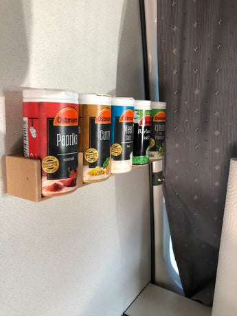 Este estante para especias ofrece una solución sencilla y eficaz para el almacenamiento de especias, tanto en casa como de viaje. Tanto si se monta en la cocina como en una autocaravana VW Bus, mantiene tus especias organizadas y al alcance. El diseño garantiza que las botellas se mantengan estables, lo que supone una ventaja al conducir en una autocaravana. El estante contribuye a maximizar el espacio y es compatible con las marcas de frascos de especias que se muestran en las imágenes, proporcionando una solución de almacenamiento a medida.