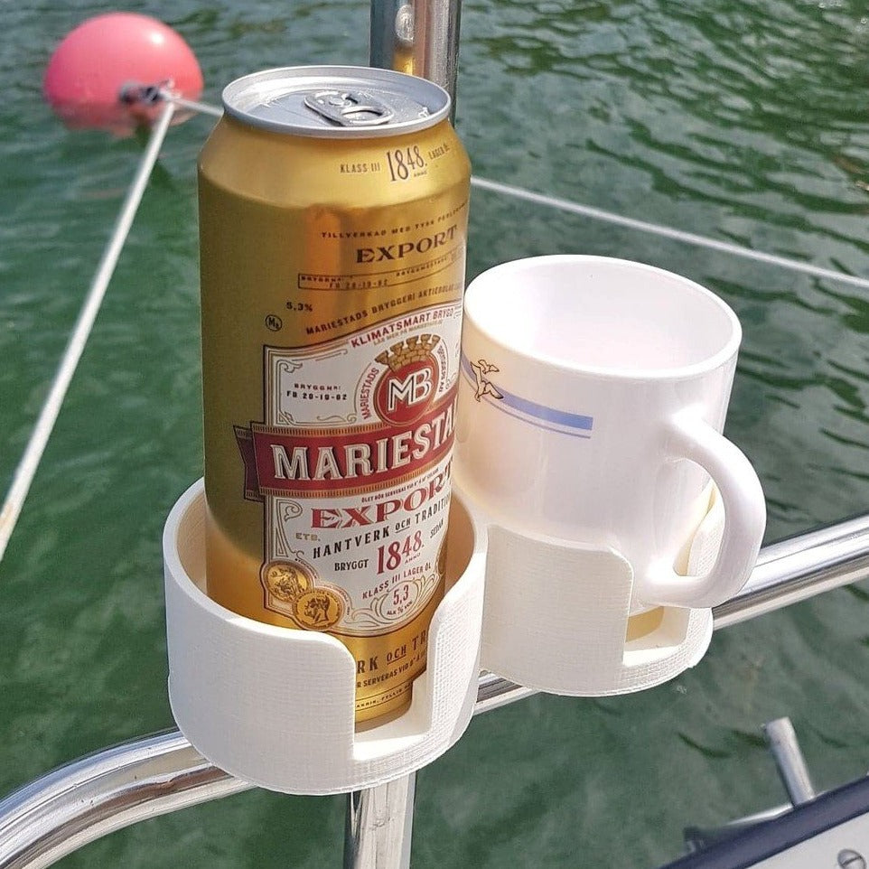 Este es un soporte doble para vasos, tazas o latas para rieles de mar de 25 mm en barcos. La parte interior está dividida en dos secciones para que quepan tanto tazas como latas.