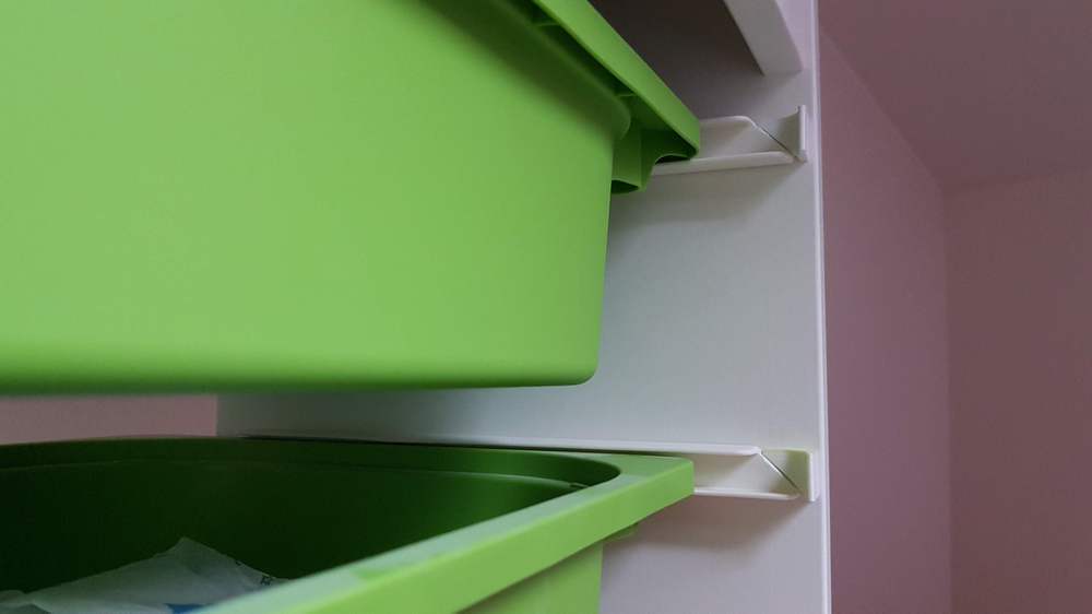 El tope final IKEA TROFAST está diseñado para evitar que los contenedores de su mueble TROFAST se deslicen desde la parte posterior, lo que evita daños en la pared por los contenedores que se empujan contra él. El uso de este tope final no requiere tornillos, por lo que no dañará los muebles de madera.