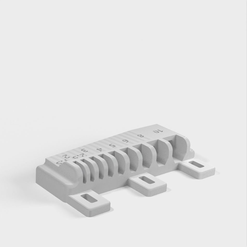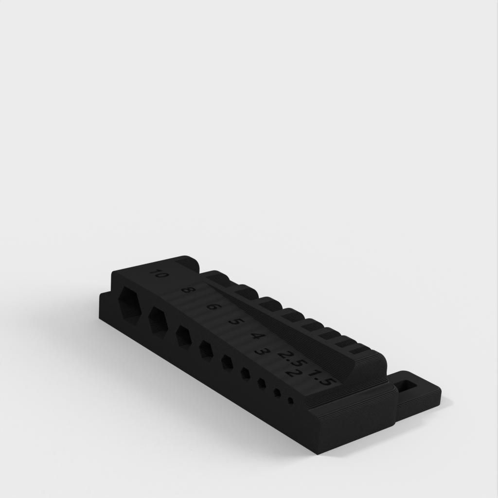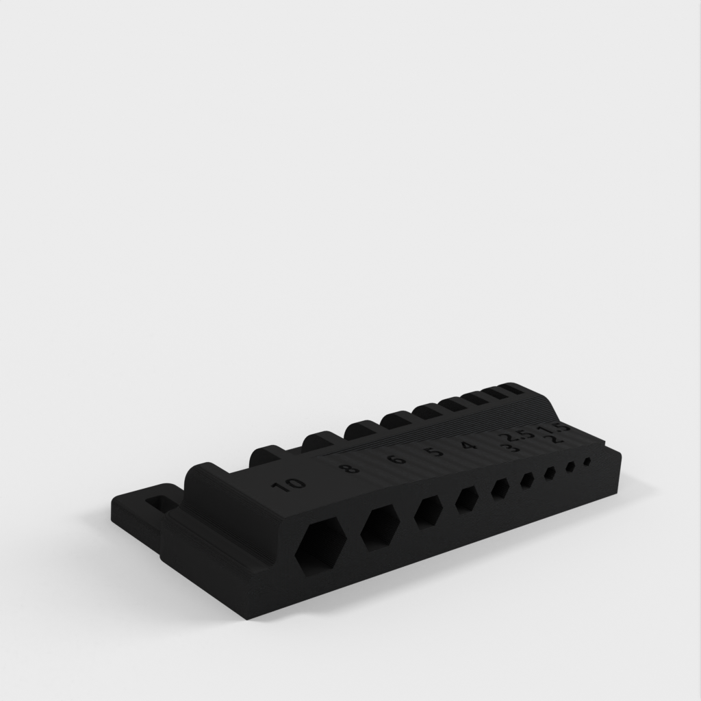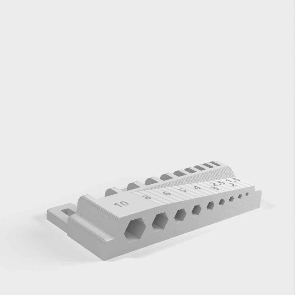 Porta llaves hexagonales Skadis es un conjunto de porta llaves diseñados para manejar llaves hexagonales. Tiene números para indicar los tamaños para una fácil identificación y se coloca fácilmente en cualquier panel IKEA Skådis/Skadis. Este diseño es un poco más elegante ya que parte del frente está cortado en ángulo para ahorrar algo de material.