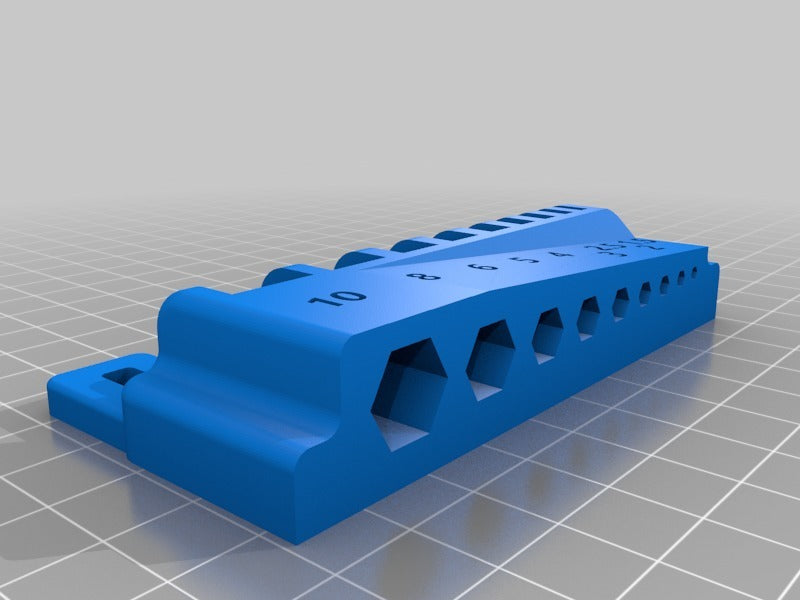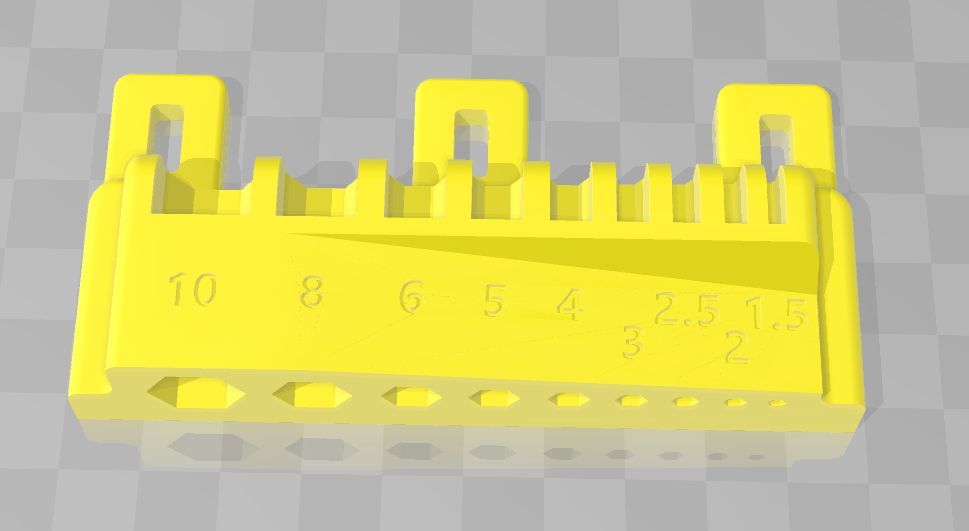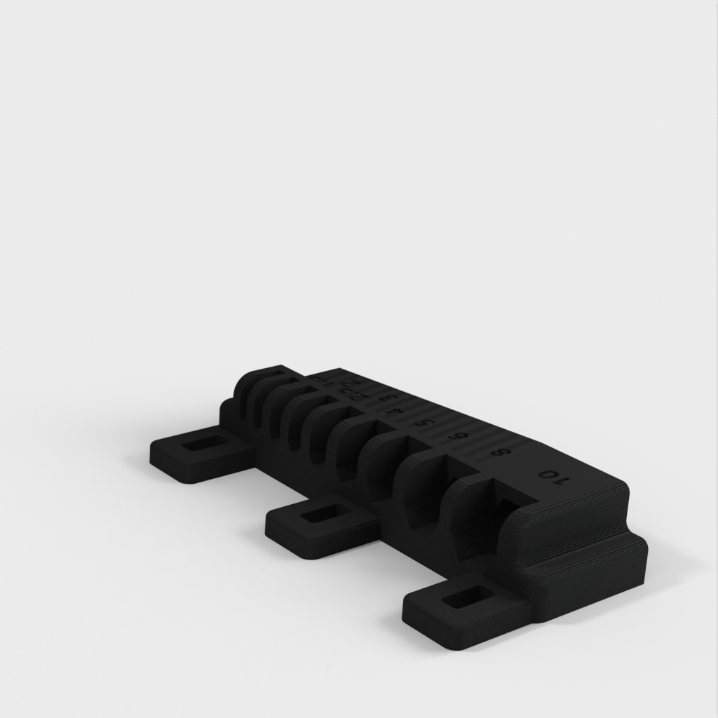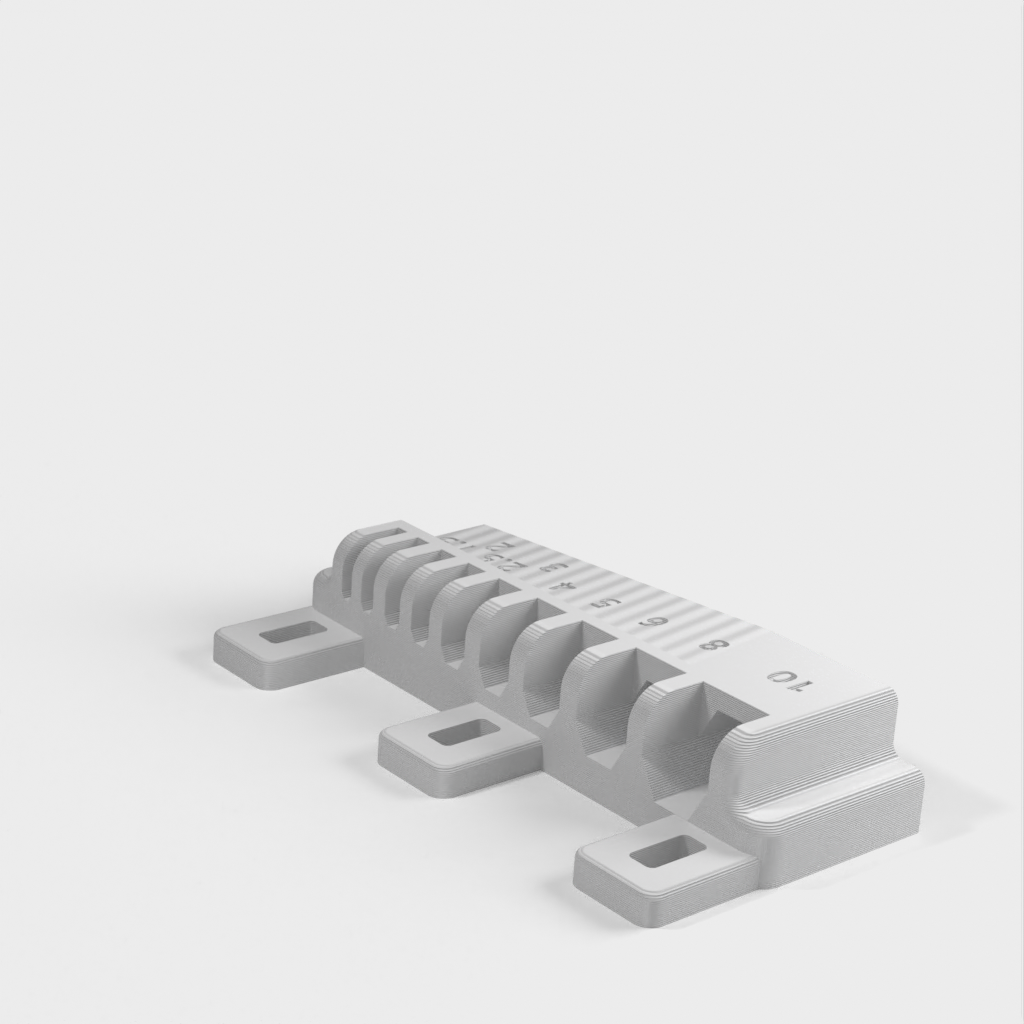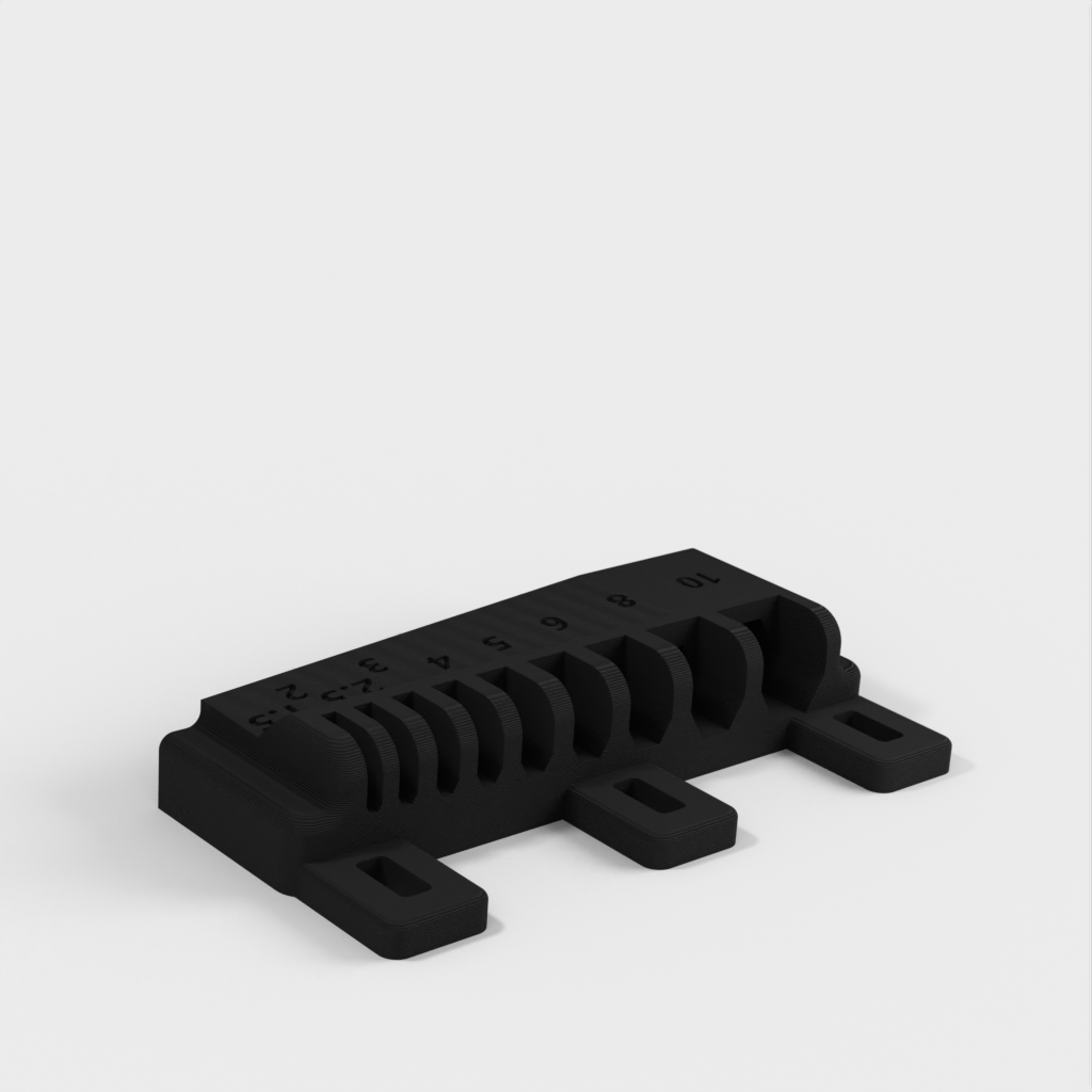 Porta llaves hexagonales Skadis es un conjunto de porta llaves diseñados para manejar llaves hexagonales. Tiene números para indicar los tamaños para una fácil identificación y se coloca fácilmente en cualquier panel IKEA Skådis/Skadis. Este diseño es un poco más elegante ya que parte del frente está cortado en ángulo para ahorrar algo de material.