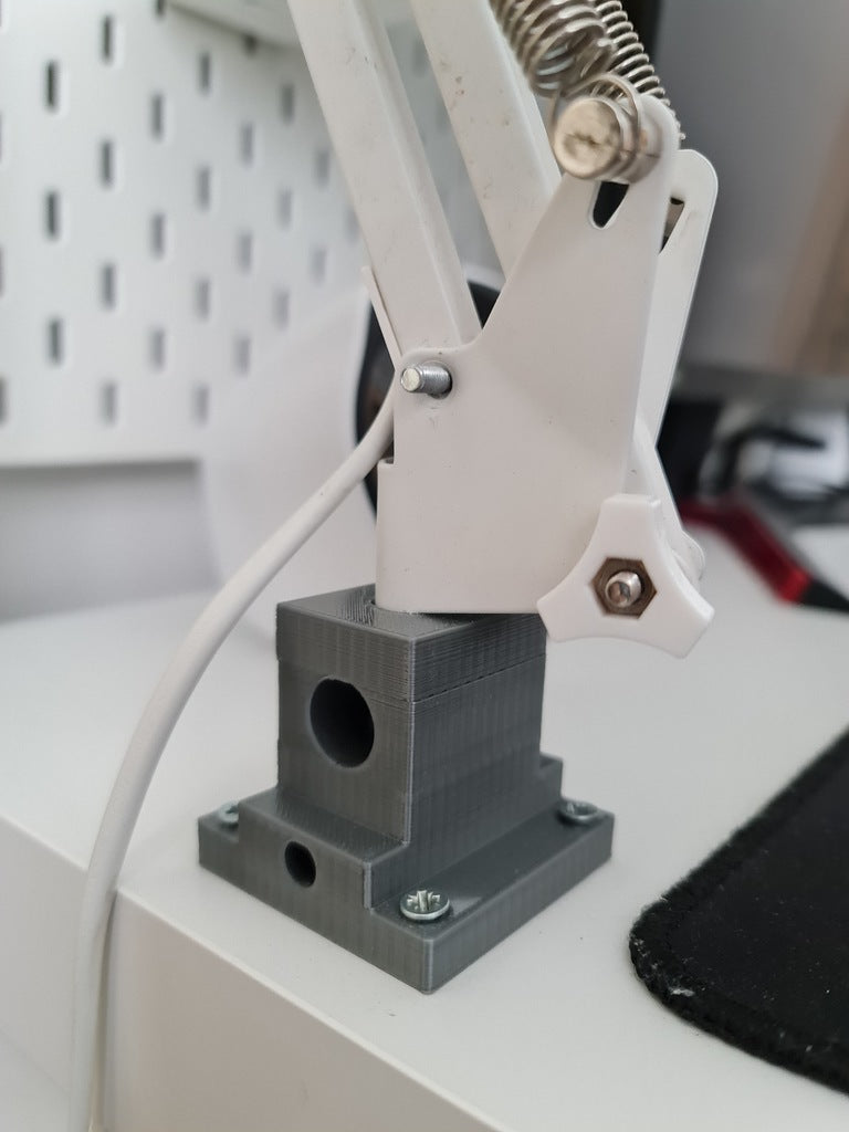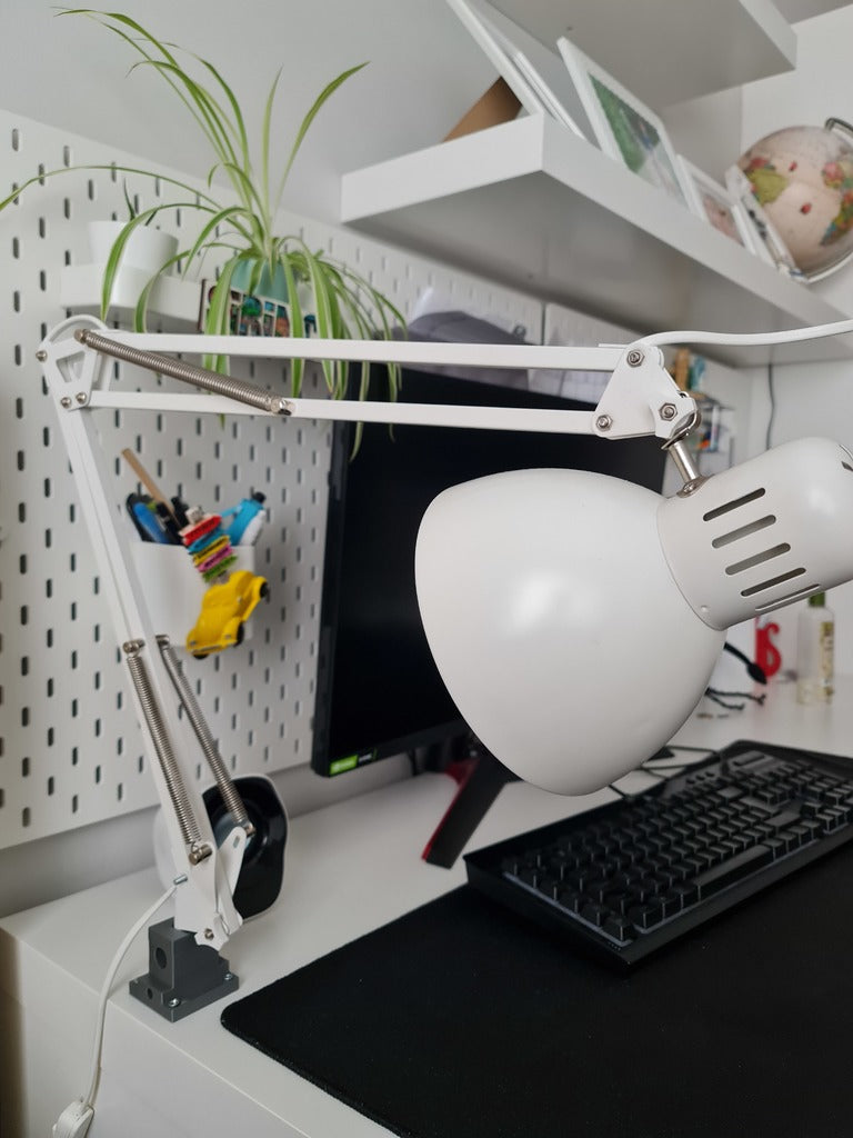 Un soporte de escritorio para la lámpara IKEA Tertial. El soporte se puede fijar directamente al escritorio para una máxima estabilidad y un movimiento mínimo. Adecuado para cualquier oficina o área de estudio para una iluminación óptima. La lámpara Tertial se puede colocar fácilmente en el soporte para un espacio de trabajo limpio y ordenado.