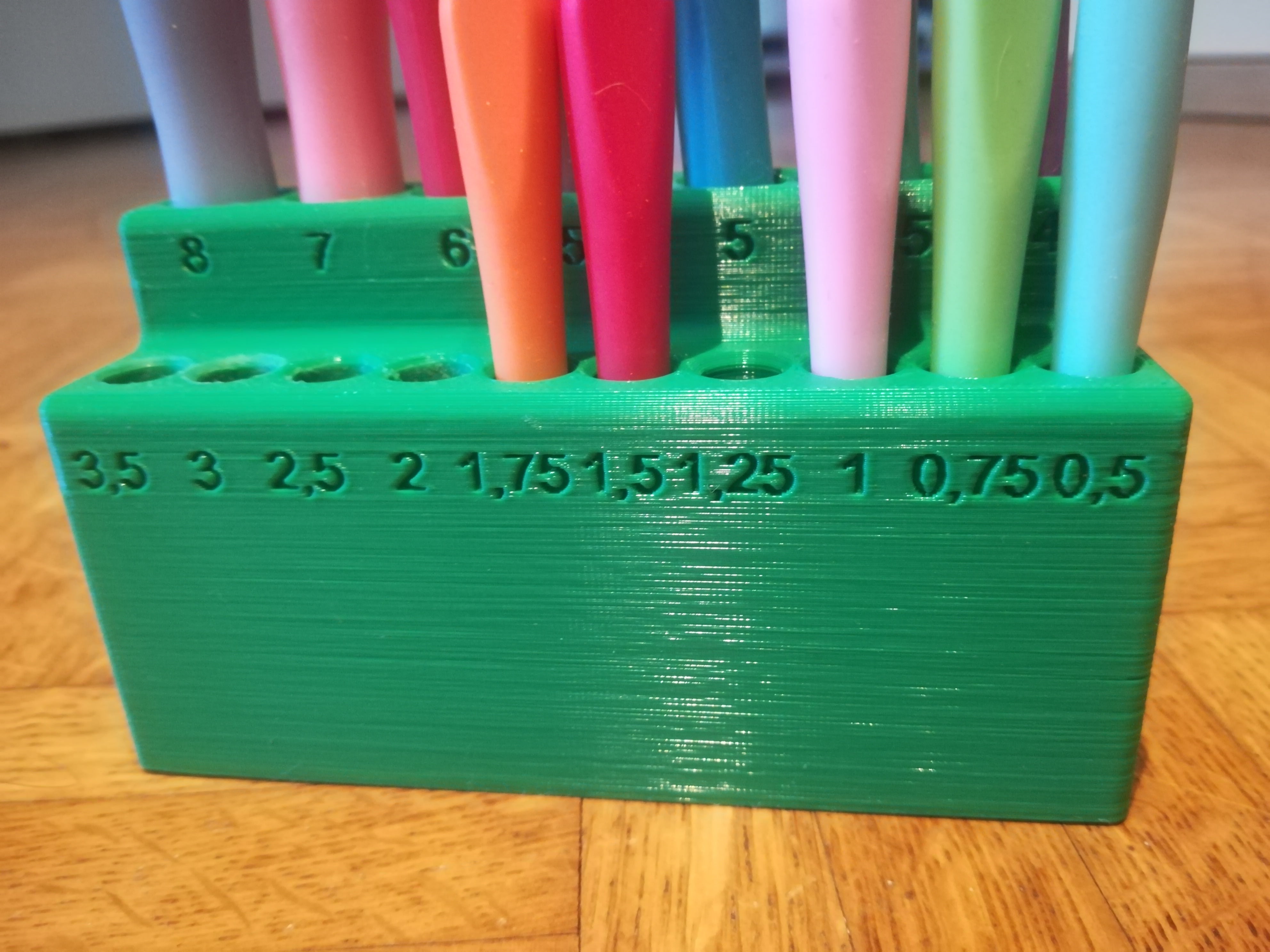 Este soporte es la solución perfecta para guardar tus agujas de ganchillo favoritas. Puede contener 17 tamaños diferentes de agujas de ganchillo, lo que facilita el seguimiento de tus herramientas y la búsqueda rápida del tamaño adecuado para tu proyecto. Con tamaños de orificio de 12 mm a 8 mm, el estante se adapta a una amplia gama de agujas de ganchillo, por lo que siempre las tienes a mano cuando te llega la inspiración.