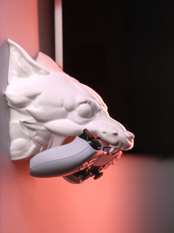 - Soporte elegante para mando con la forma de una cabeza de lobo detallada.