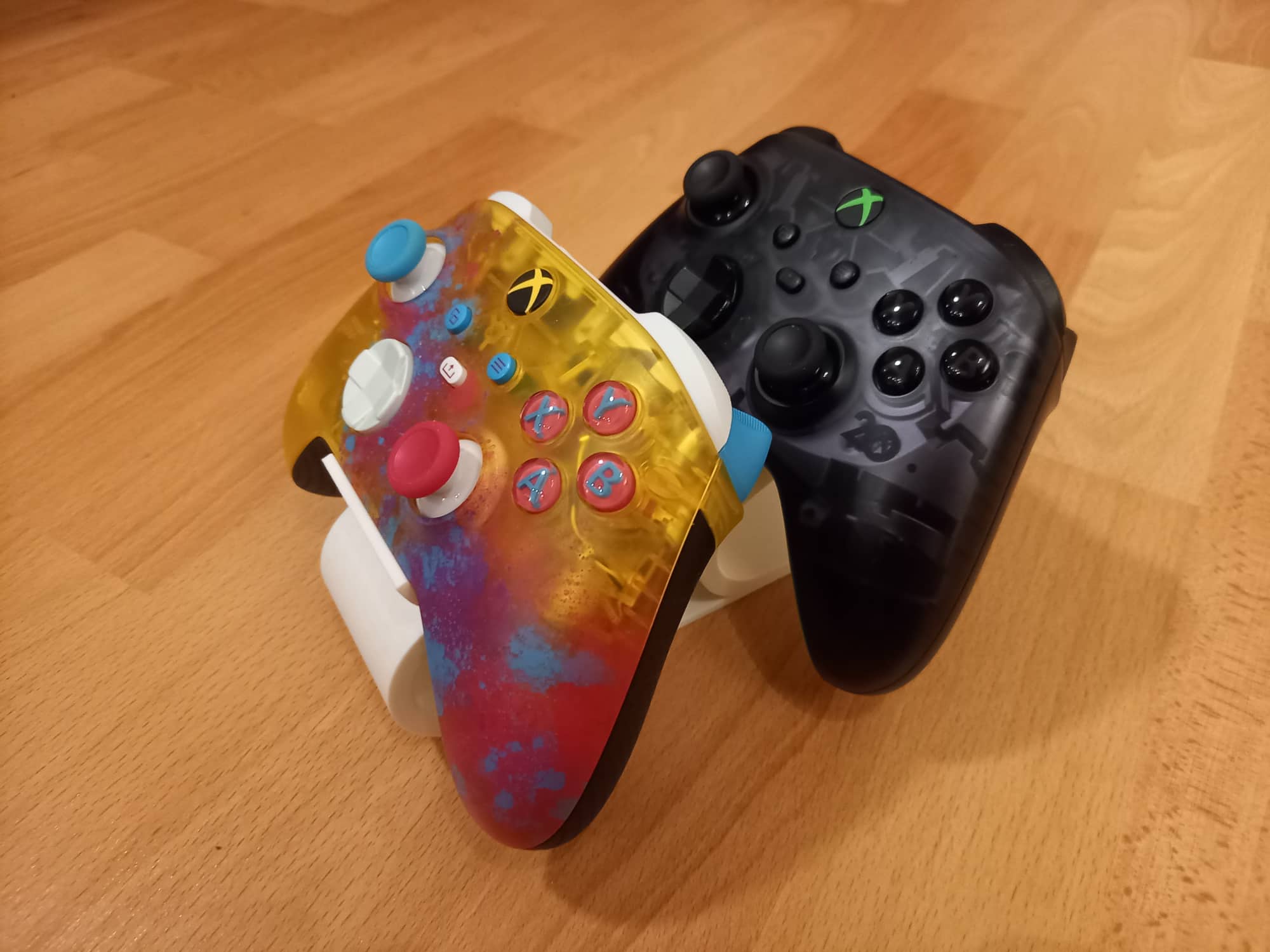Soporte/soporte doble para dos mandos Xbox. Este modelo es compatible con los mandos de Xbox One y Xbox Series y es perfecto para guardar los mandos cuando no se utilizan. El modelo original para un mando también se incluye en los archivos.