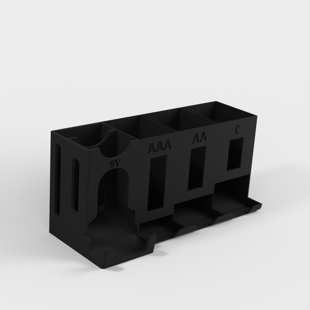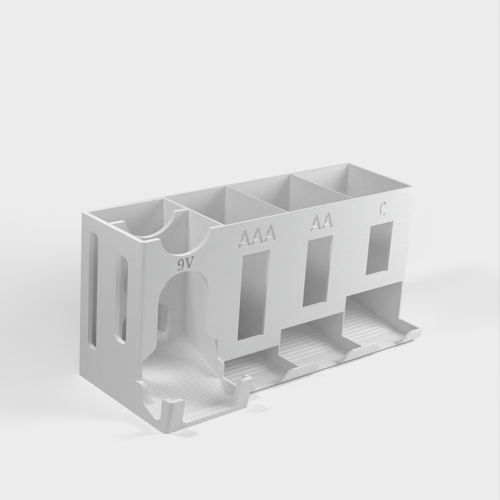 Guarde fácilmente sus baterías AA, AAA, C y de 9 voltios en este soporte.
