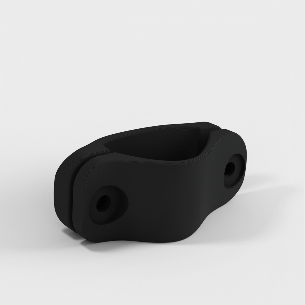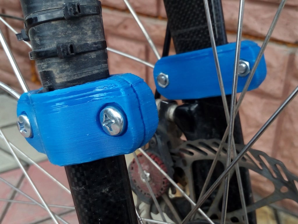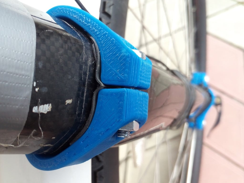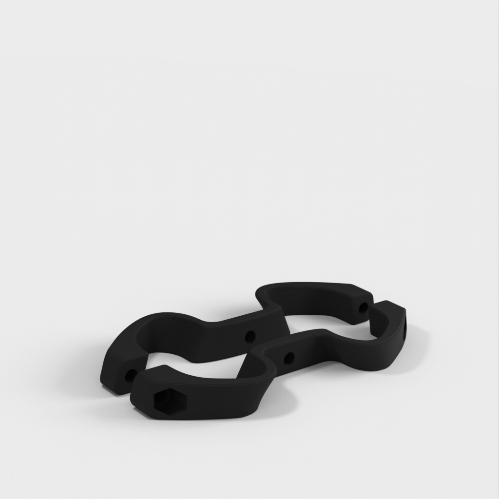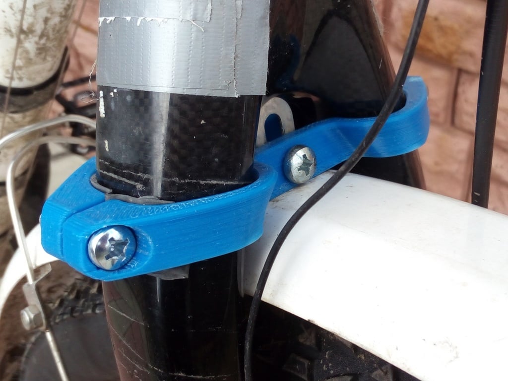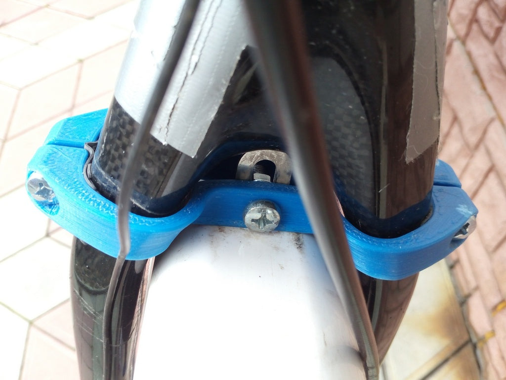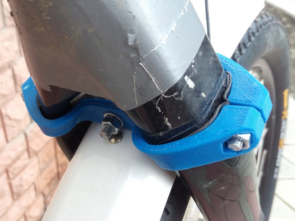 Abrazadera de soporte de guardabarros simple y confiable para montar un guardabarros delantero completo en una MTB de 29" con horquilla delantera de fibra de carbono. Diseñada para adaptarse a muchos tipos de horquillas de fibra de carbono y proporcionar un montaje estable y robusto.