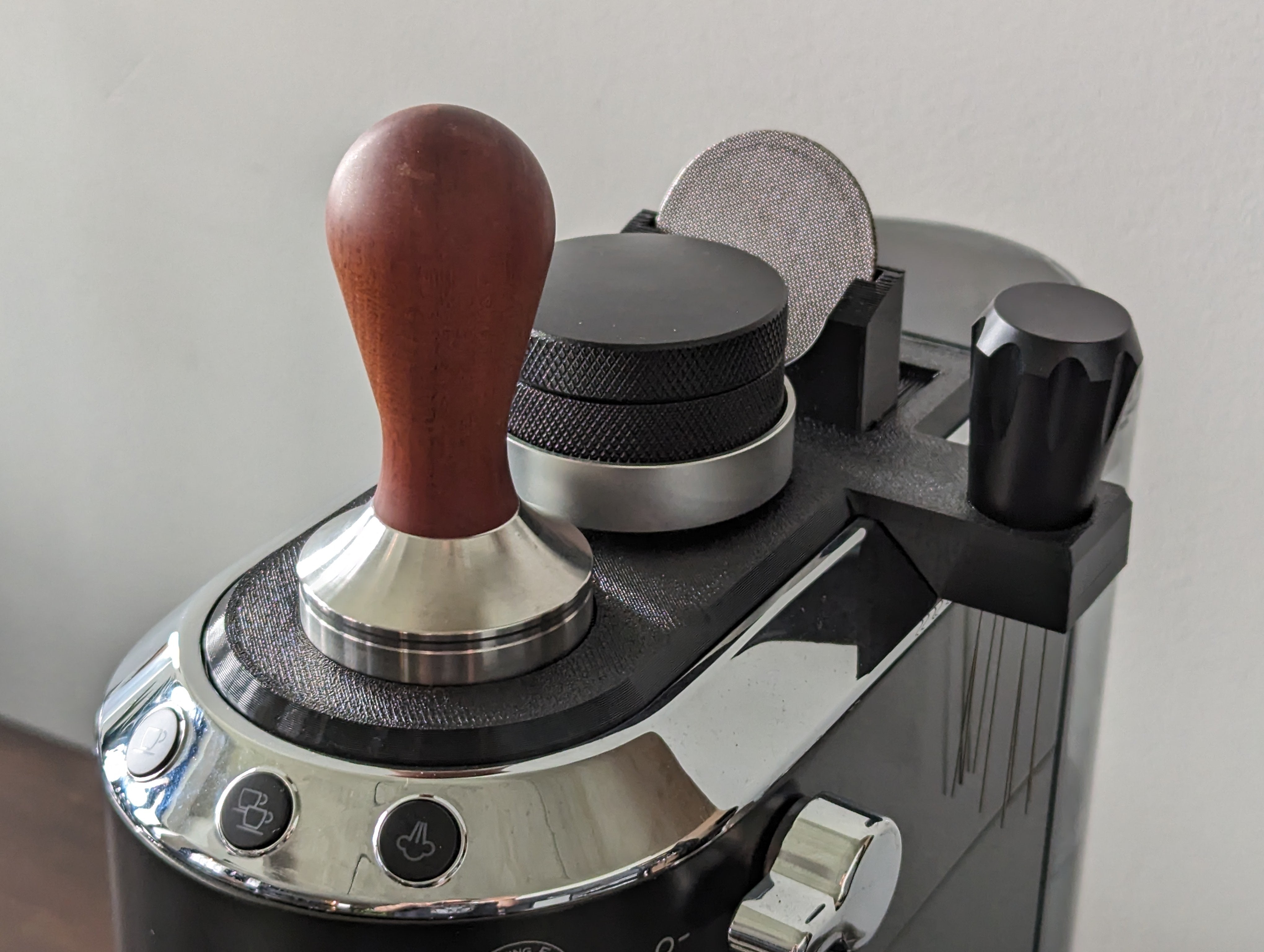 Viene con un práctico soporte para herramientas para dos herramientas de 51 mm, lo que permite almacenar tanto la herramienta WDT como dos pantallas de puck. Este accesorio no solo proporciona una superficie más ordenada, sino que también asegura que todo esté a mano cuando necesites preparar tu perfecta taza de café.
