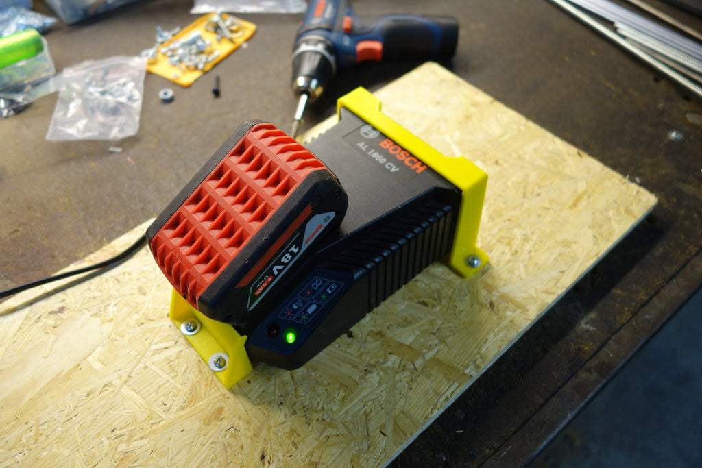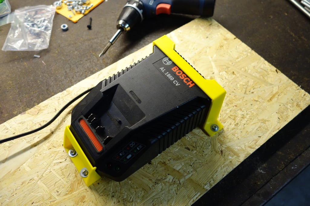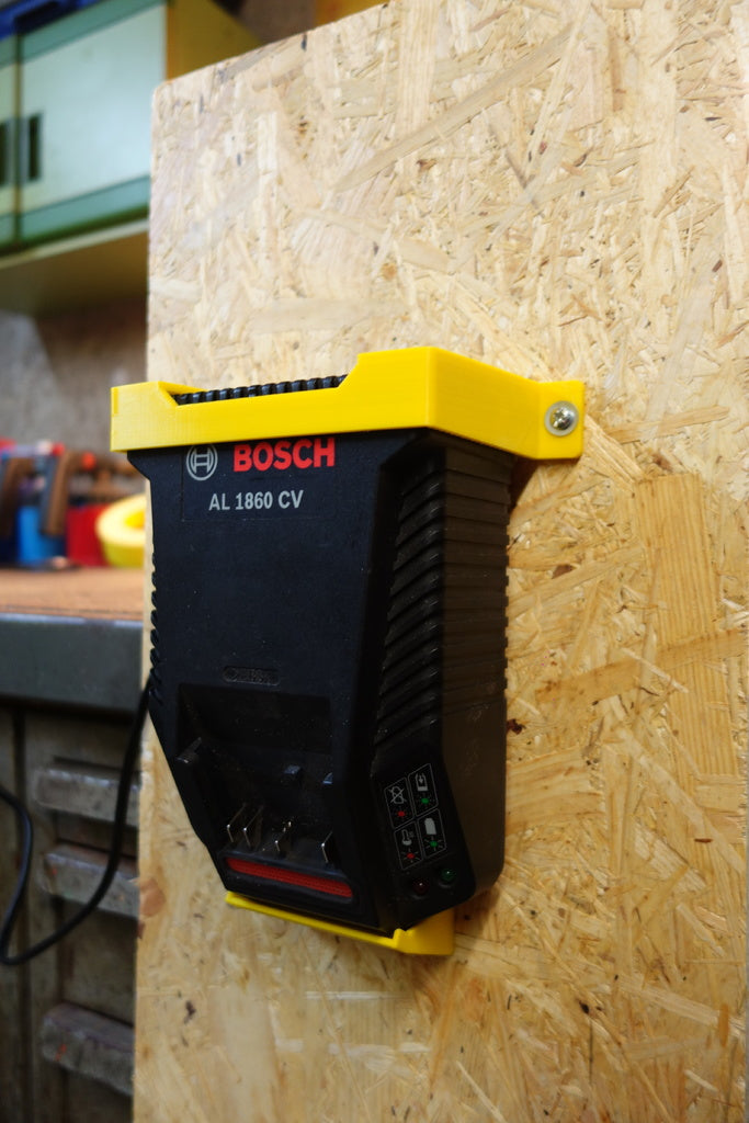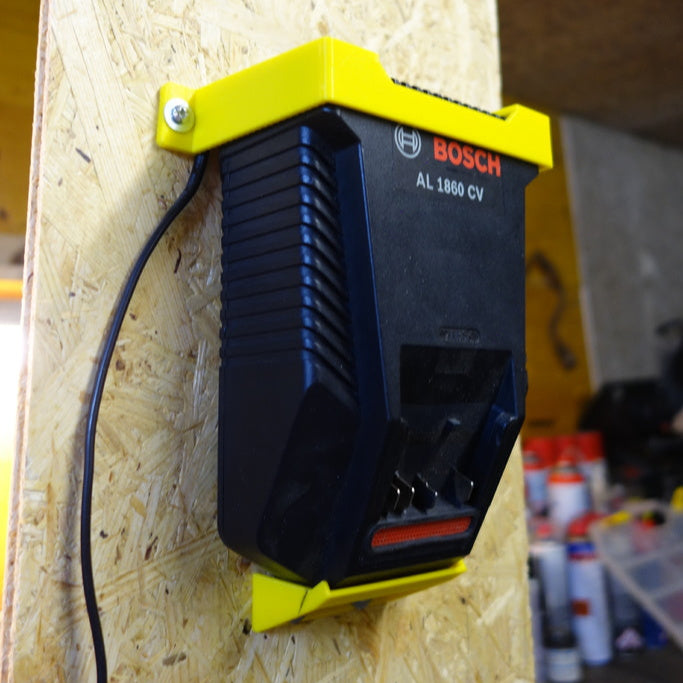 Este soporte de pared está diseñado para mi cargador Bosch AL 1860 CV (BC 630 versión estadounidense), de modo que pueda montar mi cargador en la pared. Esto significa que ocupa menos espacio en mi escritorio.