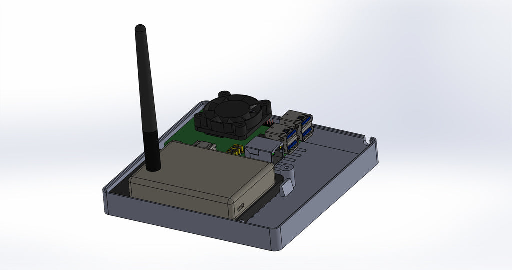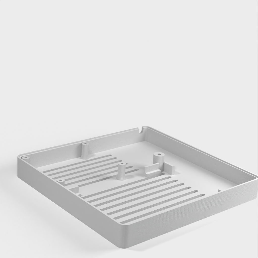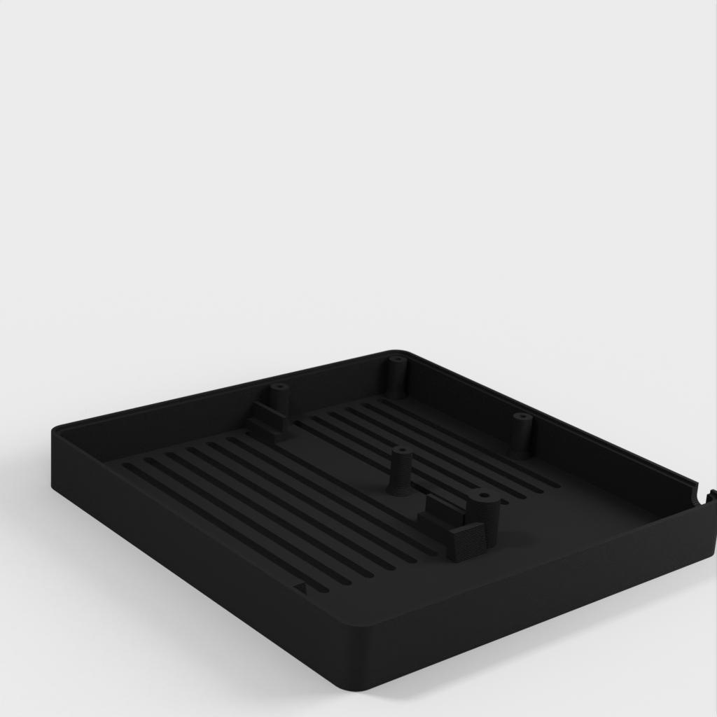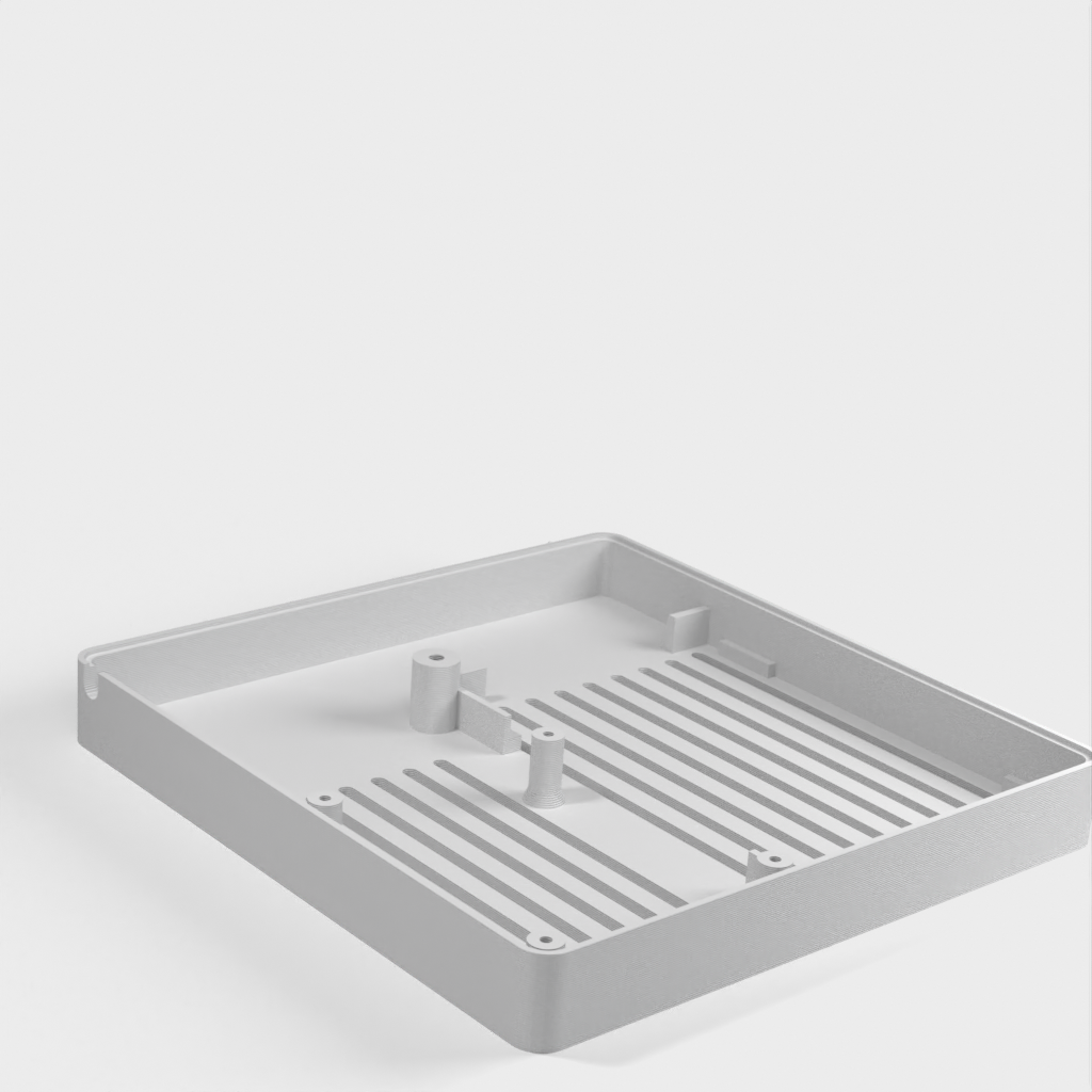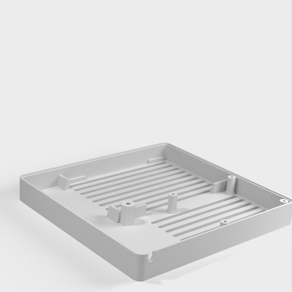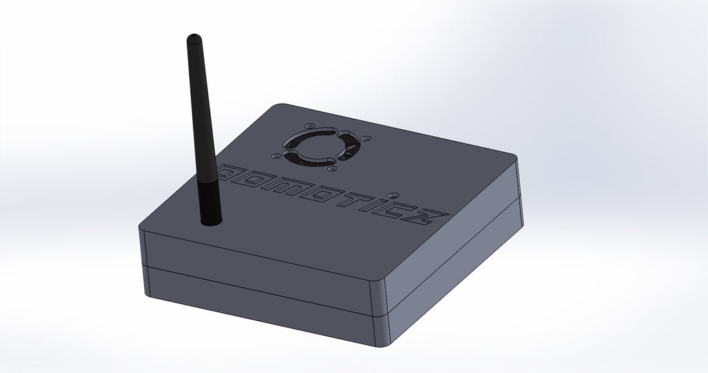 Caja personalizada para Domoticz que contiene Raspberry Pi, Pi Drive, RFX.com, Aeon stick z wave. Se debe montar un ventilador de 40 mm en la tapa superior. Recuerde añadir almohadillas debajo de la caja para asegurar una refrigeración óptima. Los cambios se han hecho de acuerdo a los dibujos técnicos, incluyendo el cambio de la ubicación de los agujeros de la frambuesa y la elevación de la mesa de la frambuesa. Parte de la cubierta superior se ha hecho más delgada para permitir la visualización del estado de los LED a través de material transparente.
