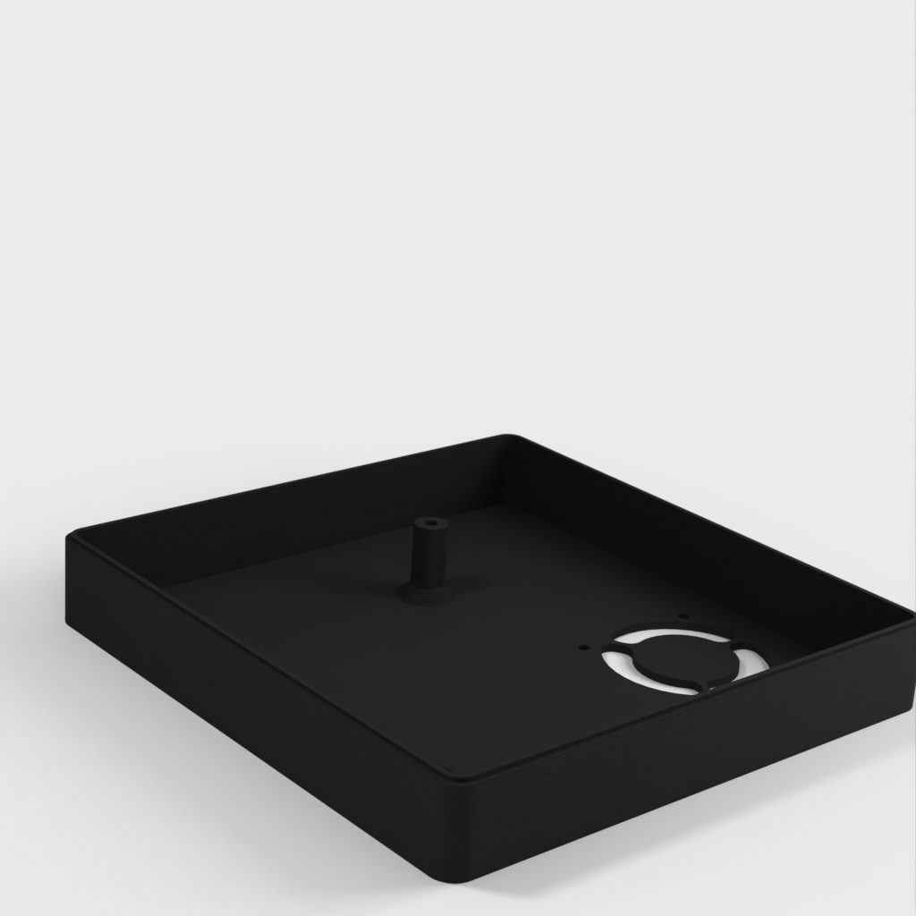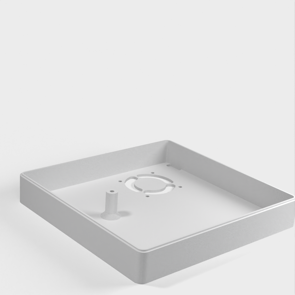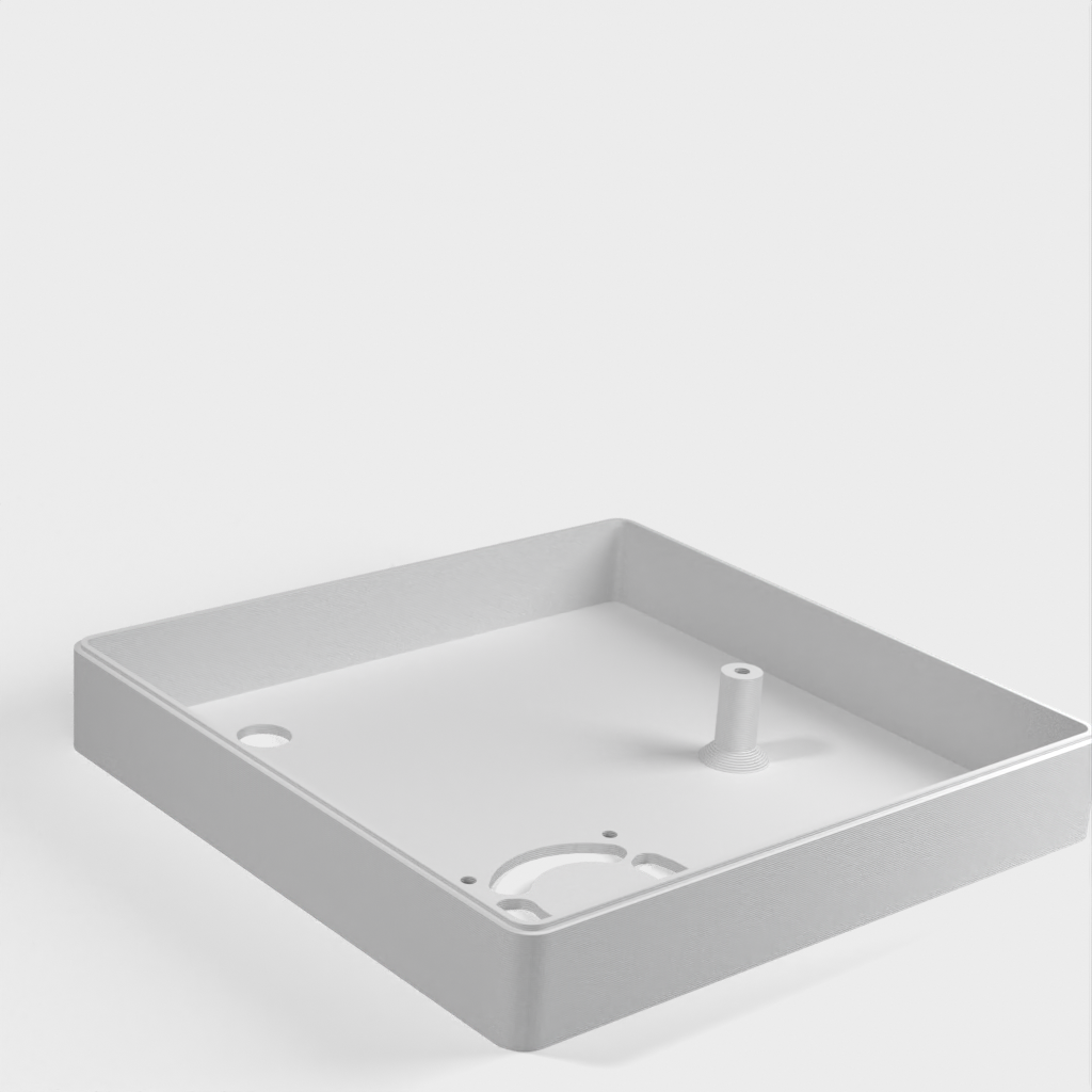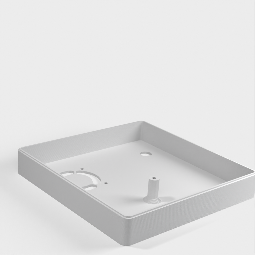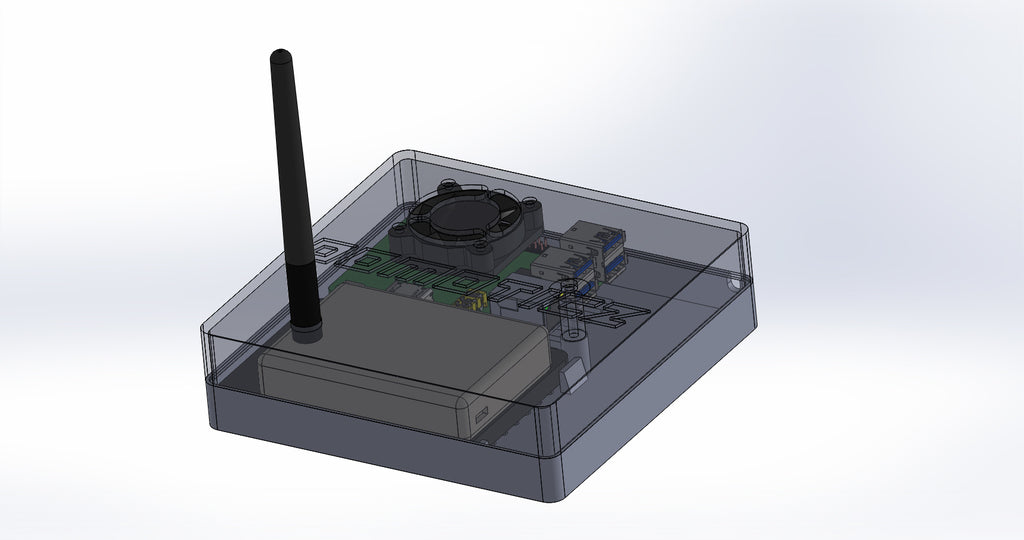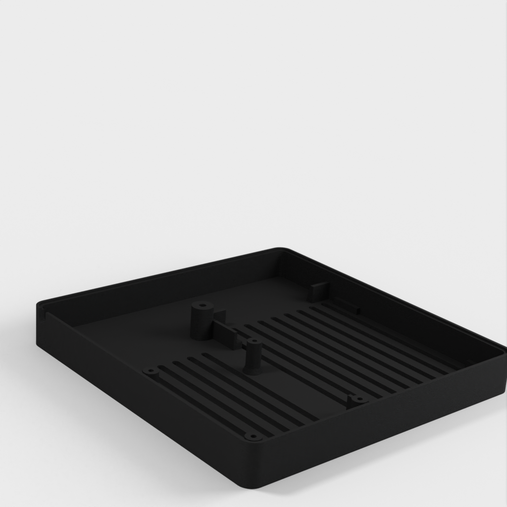 Caja personalizada para Domoticz que contiene Raspberry Pi, Pi Drive, RFX.com, Aeon stick z wave. Se debe montar un ventilador de 40 mm en la tapa superior. Recuerde añadir almohadillas debajo de la caja para asegurar una refrigeración óptima. Los cambios se han hecho de acuerdo a los dibujos técnicos, incluyendo el cambio de la ubicación de los agujeros de la frambuesa y la elevación de la mesa de la frambuesa. Parte de la cubierta superior se ha hecho más delgada para permitir la visualización del estado de los LED a través de material transparente.