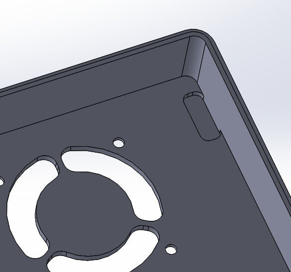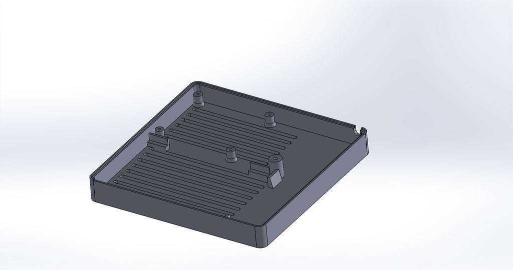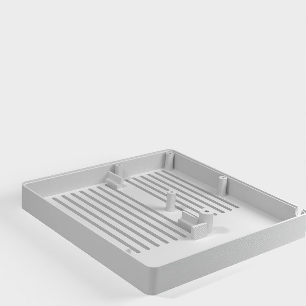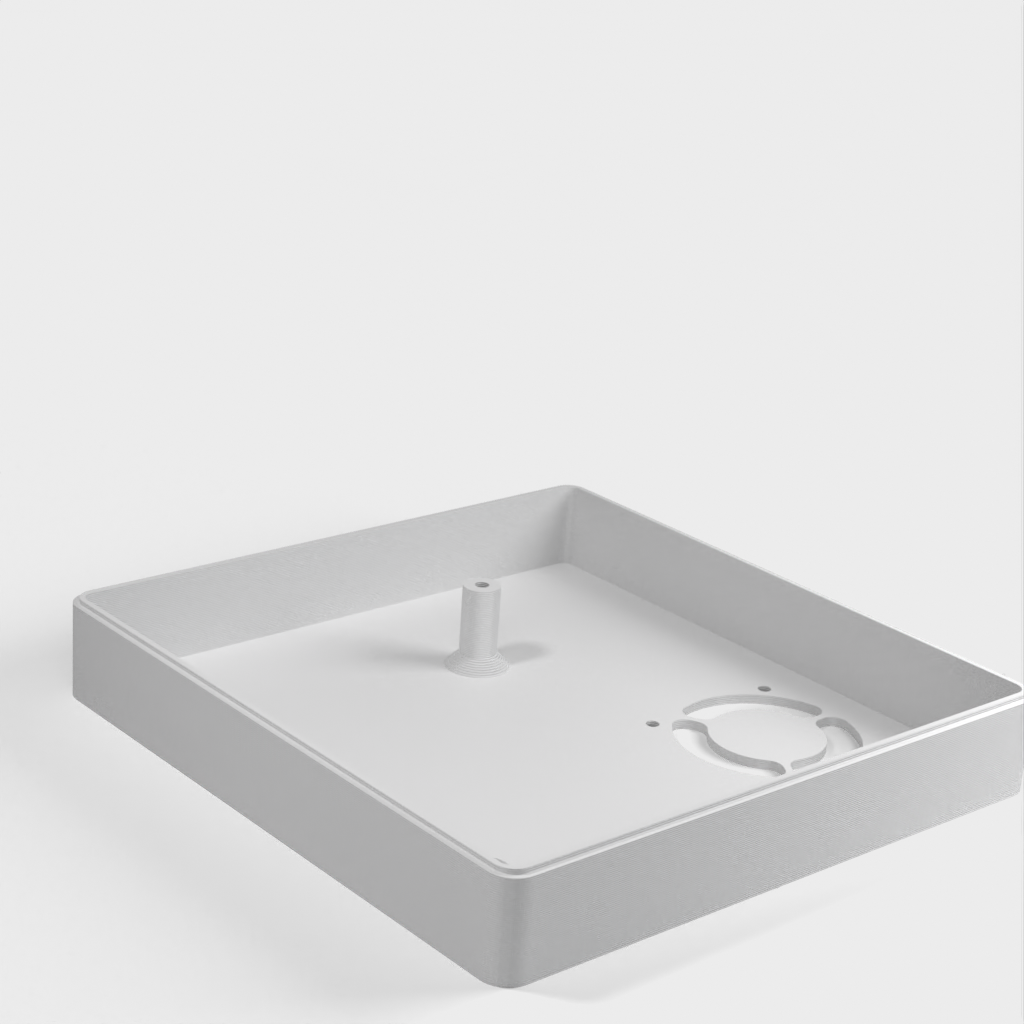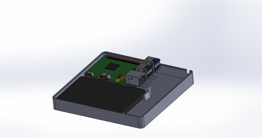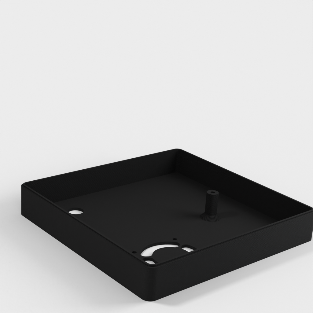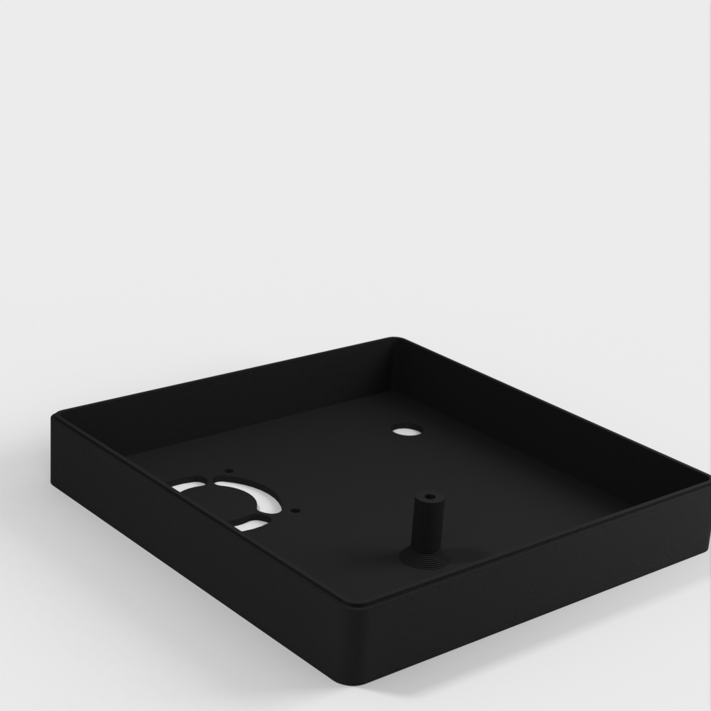Caja personalizada para Domoticz que contiene Raspberry Pi, Pi Drive, RFX.com, Aeon stick z wave. Se debe montar un ventilador de 40 mm en la tapa superior. Recuerde añadir almohadillas debajo de la caja para asegurar una refrigeración óptima. Los cambios se han hecho de acuerdo a los dibujos técnicos, incluyendo el cambio de la ubicación de los agujeros de la frambuesa y la elevación de la mesa de la frambuesa. Parte de la cubierta superior se ha hecho más delgada para permitir la visualización del estado de los LED a través de material transparente.