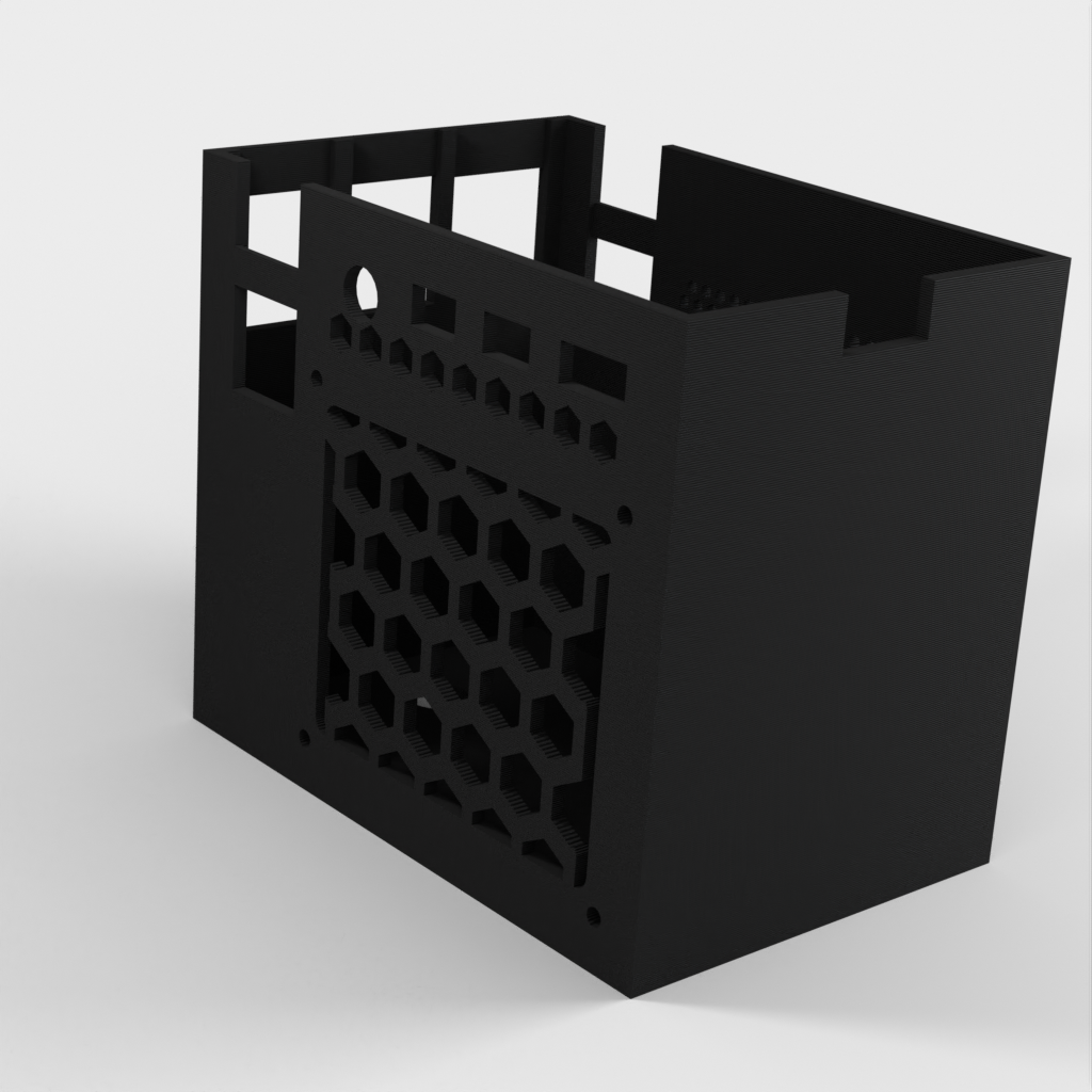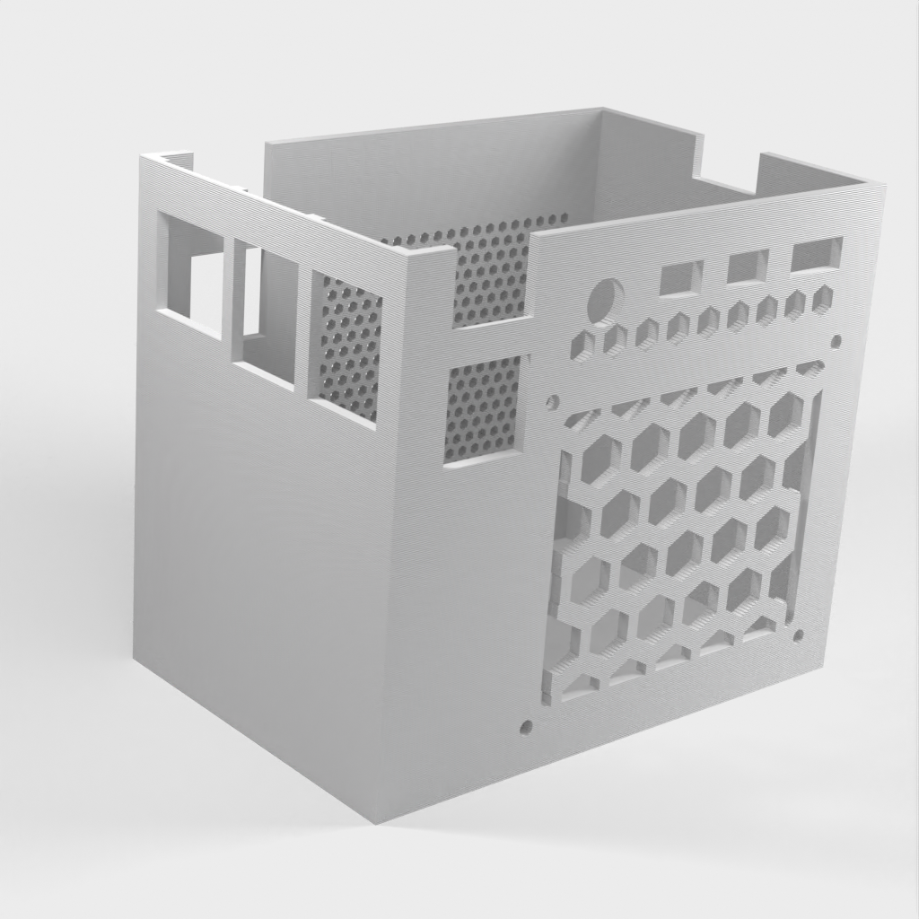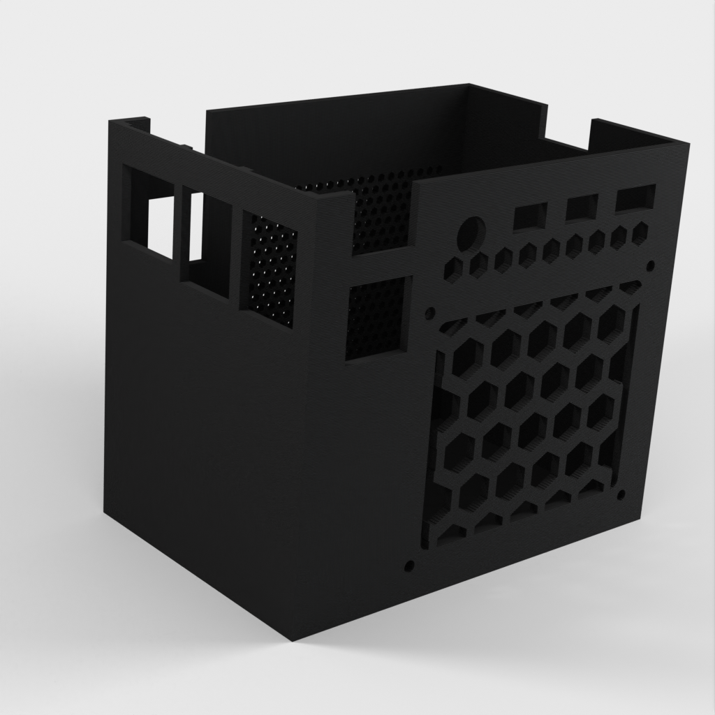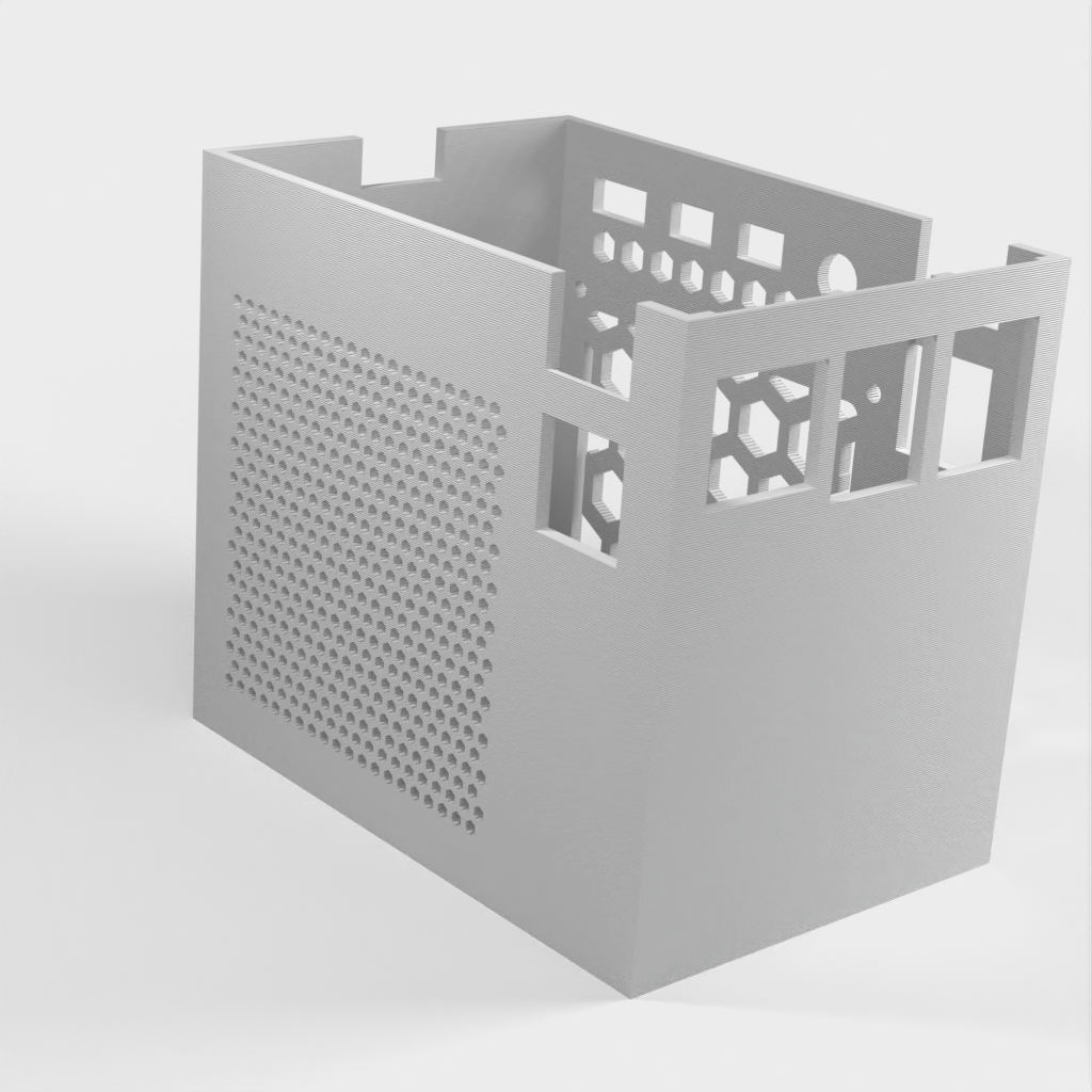 Esta es una carcasa minimalista para la Raspberry Pi 4 que se adapta a un refrigerador Ice Tower. El diseño superior de la carcasa tiene hexágonos más grandes en la parte posterior, por lo que es más fácil de imprimir. Después de la impresión, estos hexágonos se pueden quitar para dar a la caja un aspecto más agradable con la placa de acrílico que viene con el refrigerador Ice Tower montado en el lado de la caja. Los clips y la parte inferior de la carcasa se ajustan para encajar mejor y soportar múltiples diámetros de pies de goma.