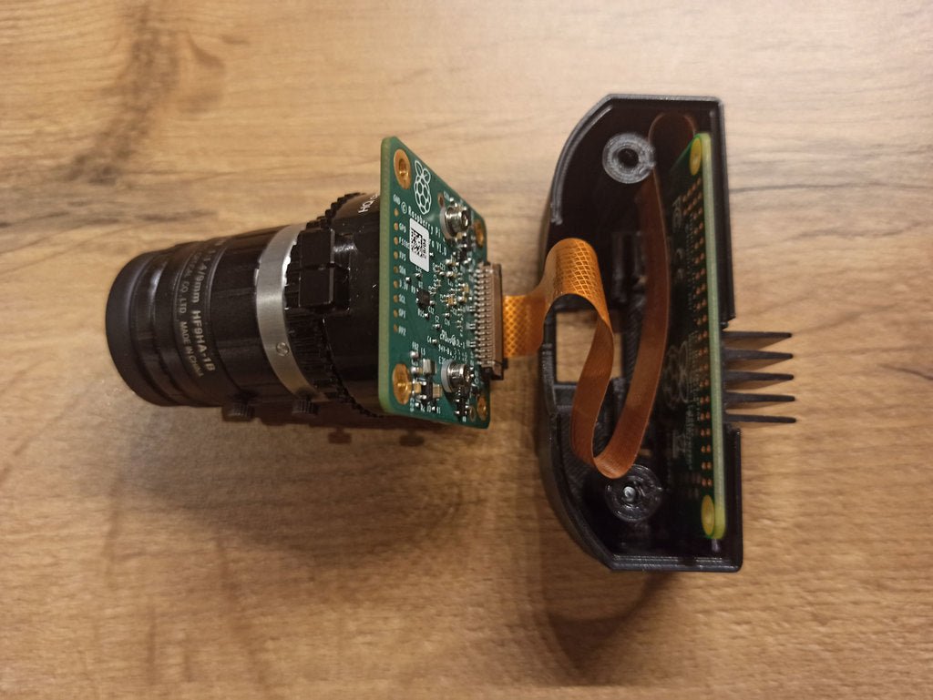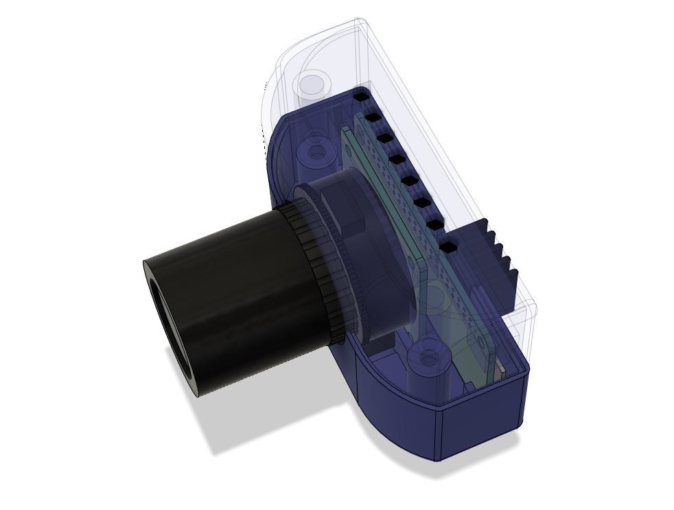 La carcasa de la cámara se puede cerrar con dos tornillos de chapa de 3 mm. Existen varios archivos .stl para la carcasa inferior dependiendo del acceso que se desee. También hay algunas versiones con un orificio más grande para objetivos de montura C más grandes.