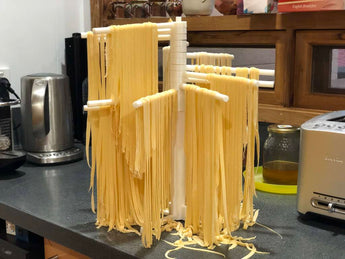 Este estante para secar pasta con 16 brazos es ideal para secar eficazmente la pasta después de la producción. Con su práctico diseño, puede configurarlo fácilmente cuando necesite hacer pasta y luego desmontarlo para facilitar su almacenamiento cuando no esté en uso. La construcción compacta permite secar mayores cantidades de pasta al mismo tiempo, lo cual es perfecto para aquellos a quienes les encanta hacer pasta casera. Ya sea que esté haciendo tagliatelle, fettuccine o espagueti, este tendedero lo ayudará a lograr la consistencia perfecta, al tiempo que se asegura de que su pasta no se pegue.