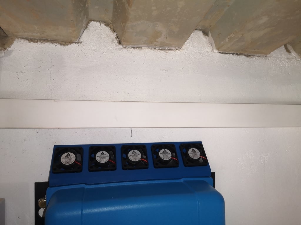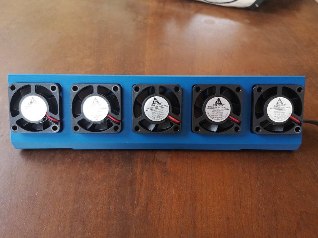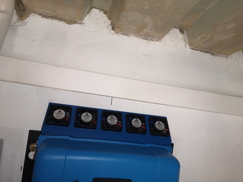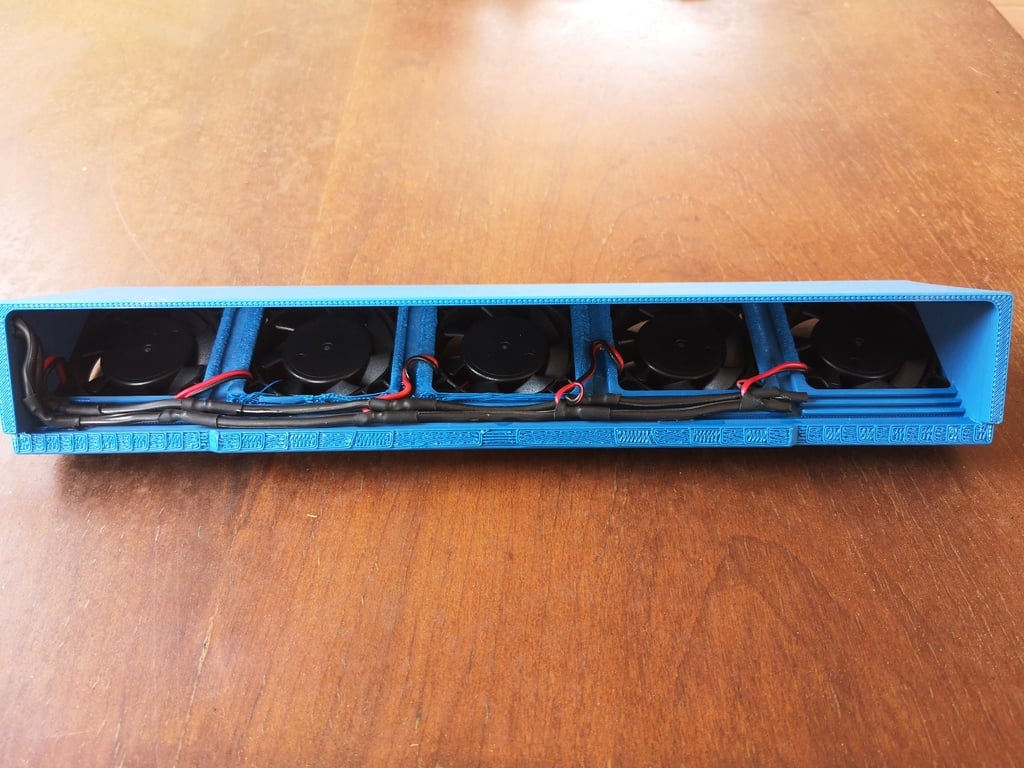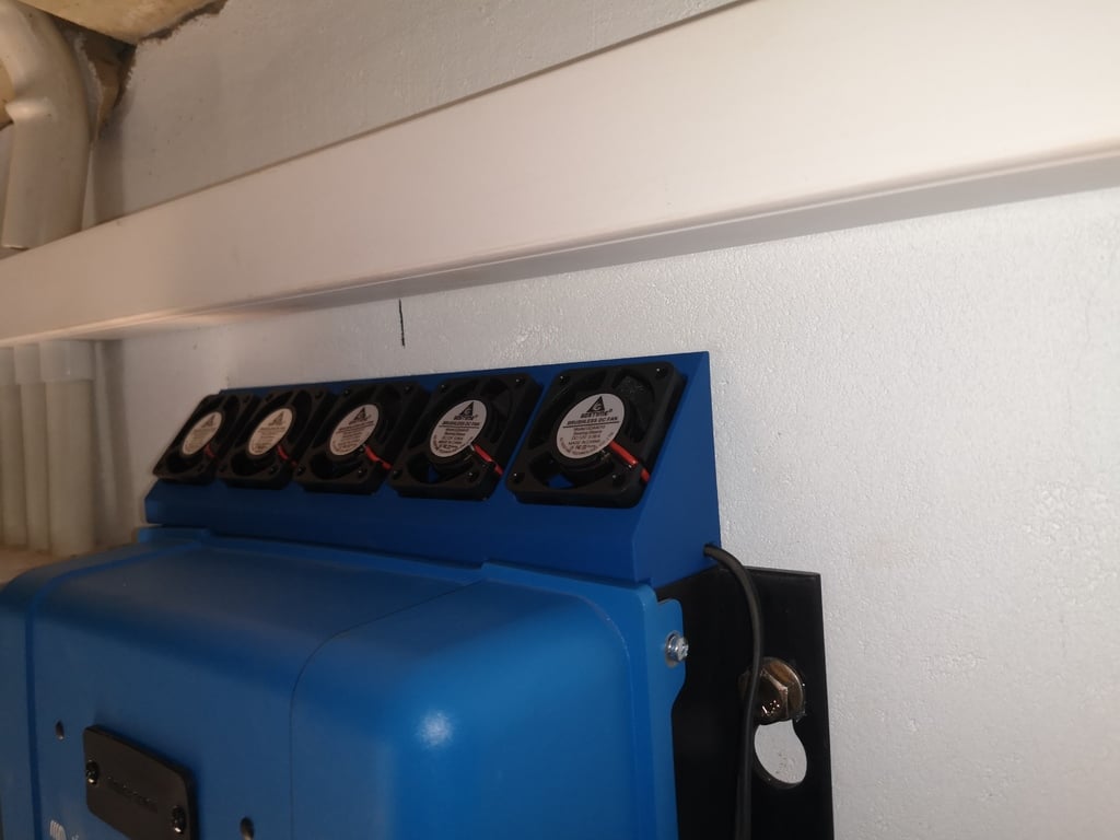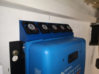 Una cubierta extractora diseñada para adaptarse a 5 ventiladores de 40 mm en un Victron 250/100 MPPT. Esta cubierta mejora significativamente la refrigeración en el disipador de calor detrás del cargador.