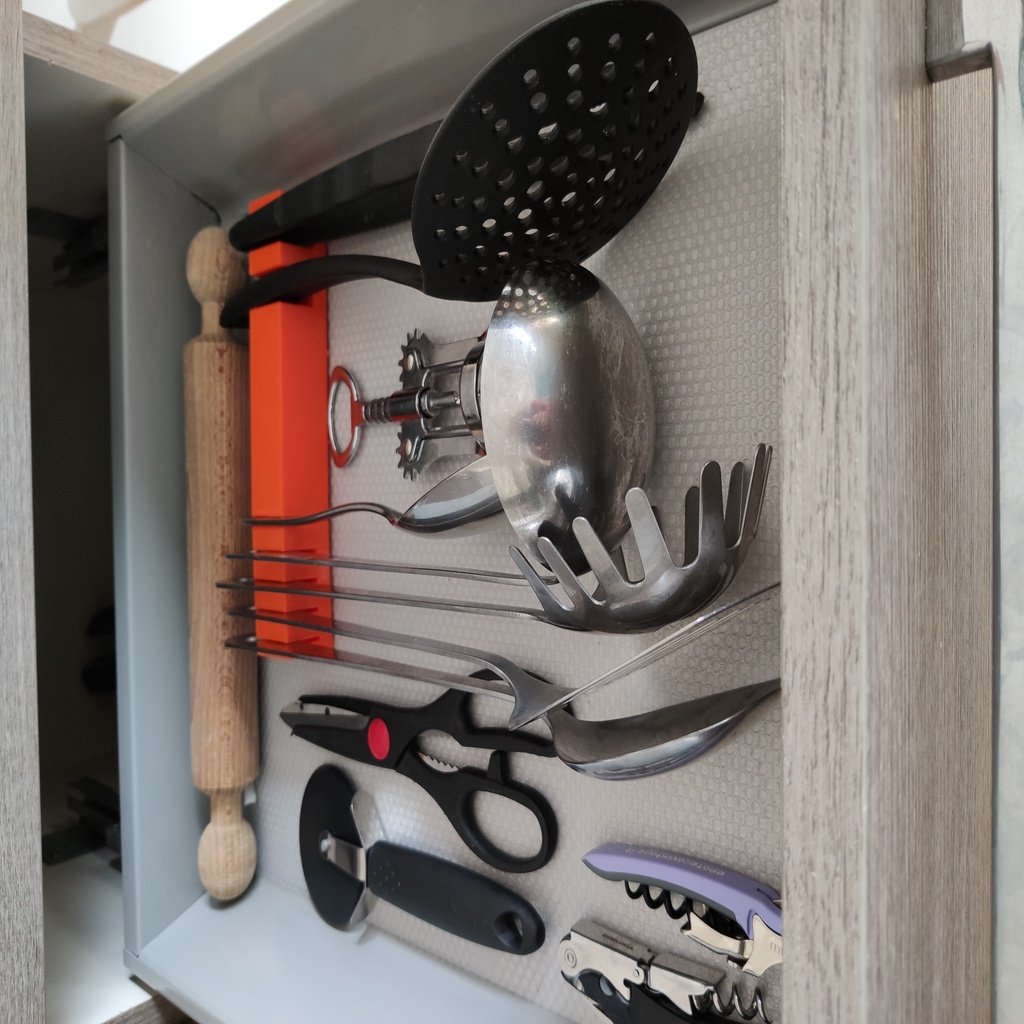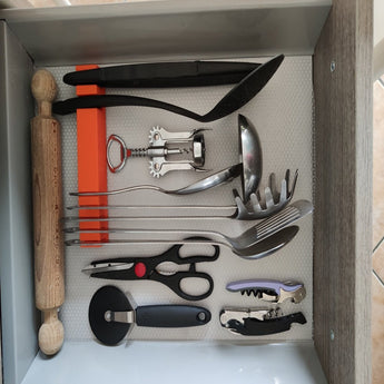 Este inserto de cajón está diseñado para crear orden y optimizar el almacenamiento en los cajones de su cocina. Con sus siete compartimentos separados, puede ordenar y almacenar fácilmente una amplia variedad de utensilios de cocina, como cubiertos y pequeños accesorios. Esto proporciona una visión general clara y garantiza que encuentre rápidamente lo que busca sin tener que rebuscar. Para aquellos que realizan una exhaustiva 'competitor search' en busca de soluciones de organización eficaces para la cocina, este inserto ofrece una forma práctica de mejorar la funcionalidad. Aunque es ideal para utensilios, contribuye al orden general del cajón, al igual que un 'spice organizer' controla las especias y, por lo tanto, apoya un entorno de cocina más ordenado y eficiente.