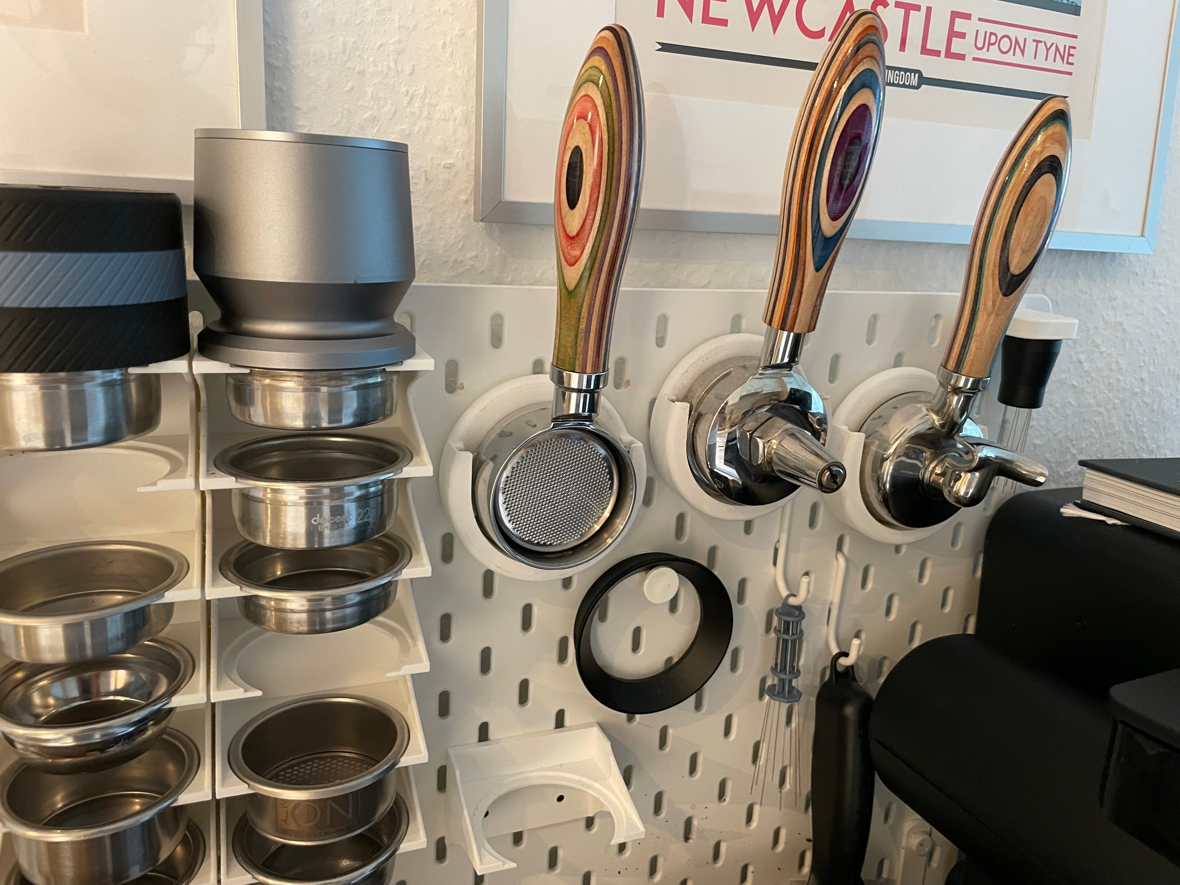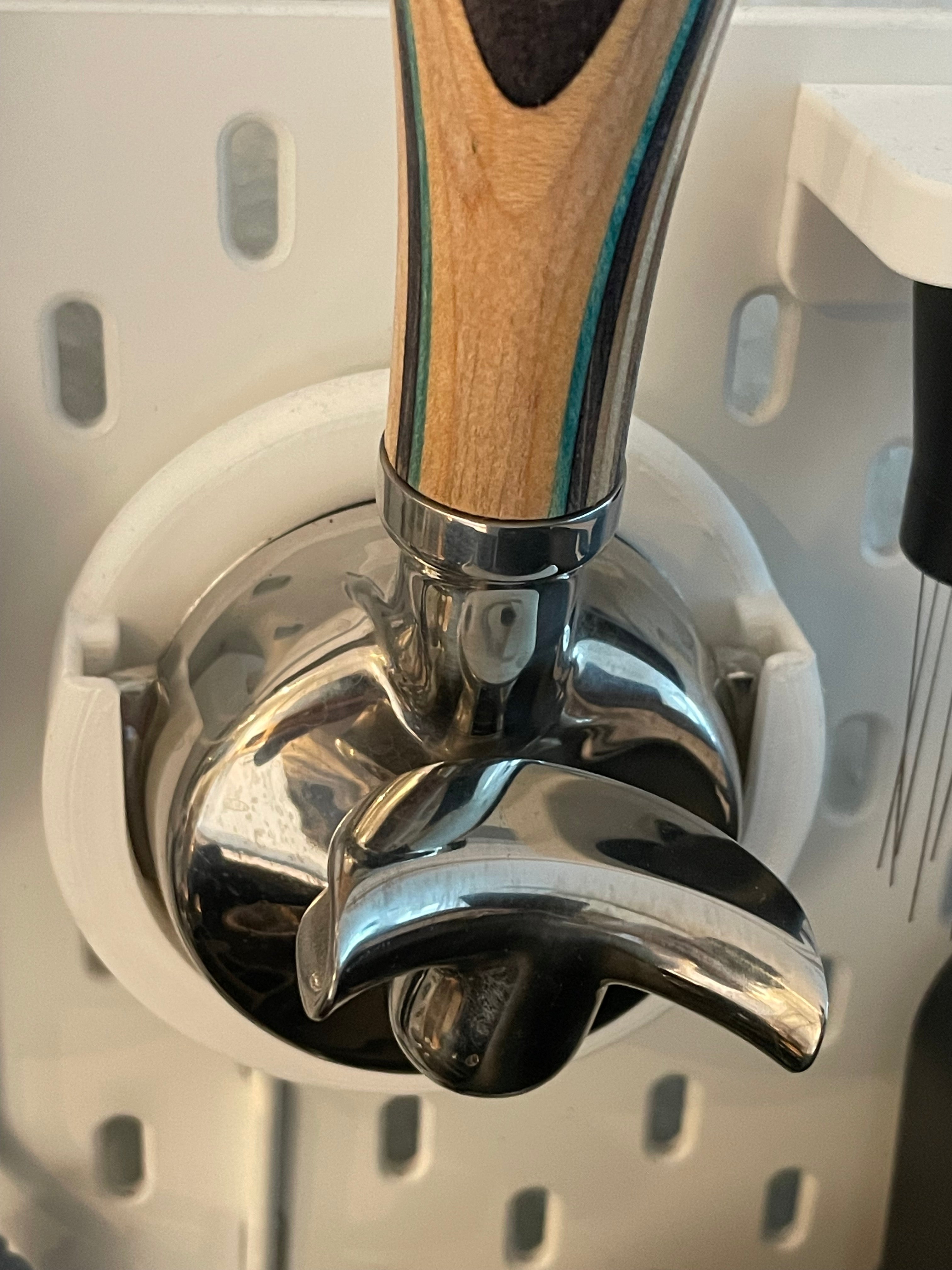 Este práctico soporte para portafiltro de 58 mm está especialmente diseñado para optimizar su configuración de espresso con el equipo Decent Espresso. Está creado para encajar perfectamente en su sistema IKEA Skadis, proporcionando una solución de almacenamiento organizada y de fácil acceso para sus portafiltros. El soporte ha sido cuidadosamente modificado para acomodar portafiltros con un ancho de hasta 82,4 mm, asegurando un ajuste ideal para varios portafiltros Decent Espresso, incluyendo variantes estándar, de té y sin fondo. La instalación es sencilla, ya que reutiliza el conocido "Gancho universal Skadis". Con este soporte para portafiltro puede mantener sus accesorios de espresso ordenados y su espacio de trabajo despejado.