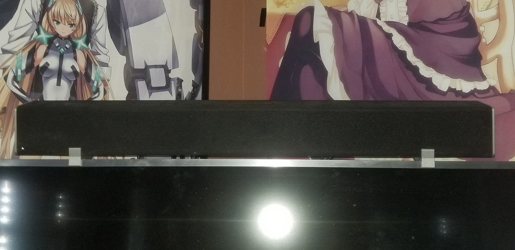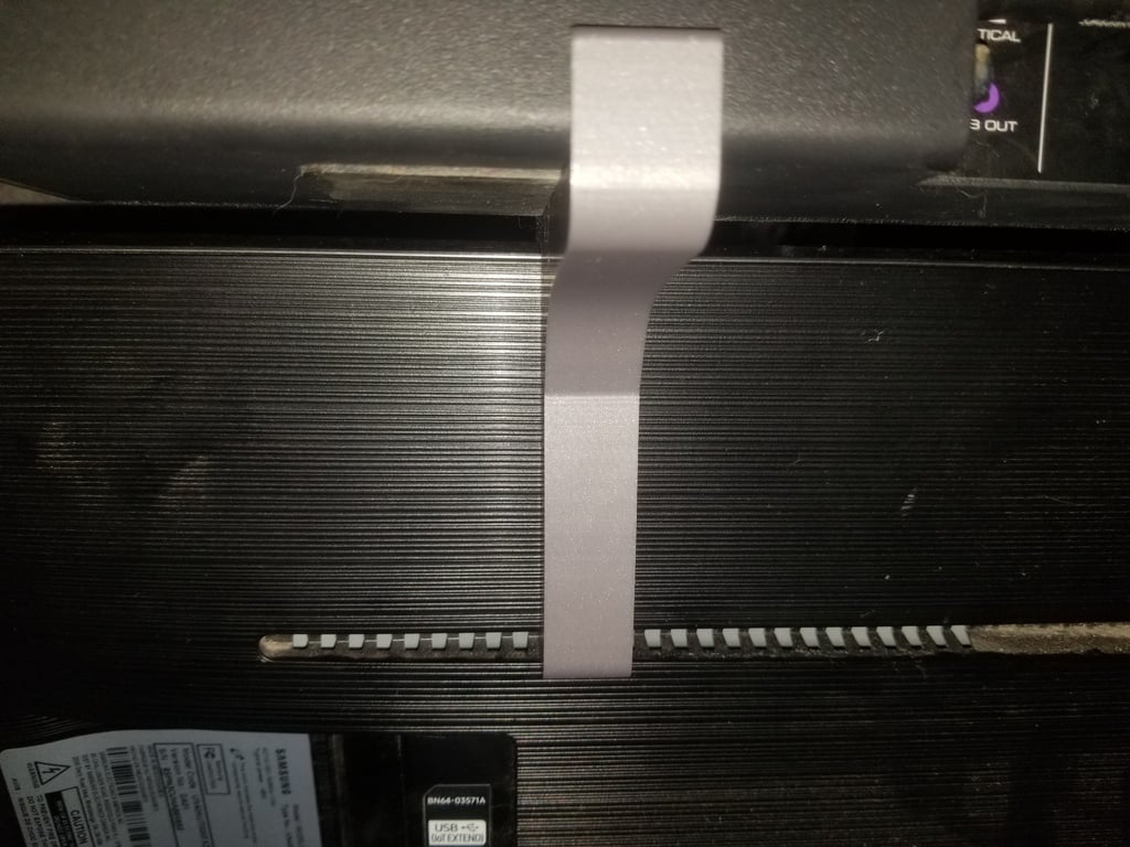 Soporte de pared simple para una barra de sonido Vizio SB2920-C6 que se adapta a la parte superior de un televisor Samsung KU7000 de 40". Este soporte se desliza sobre la parte superior del televisor y luego se fija fácilmente en la parte posterior del televisor en una ranura para ventilación, creando una instalación ordenada y ordenada.