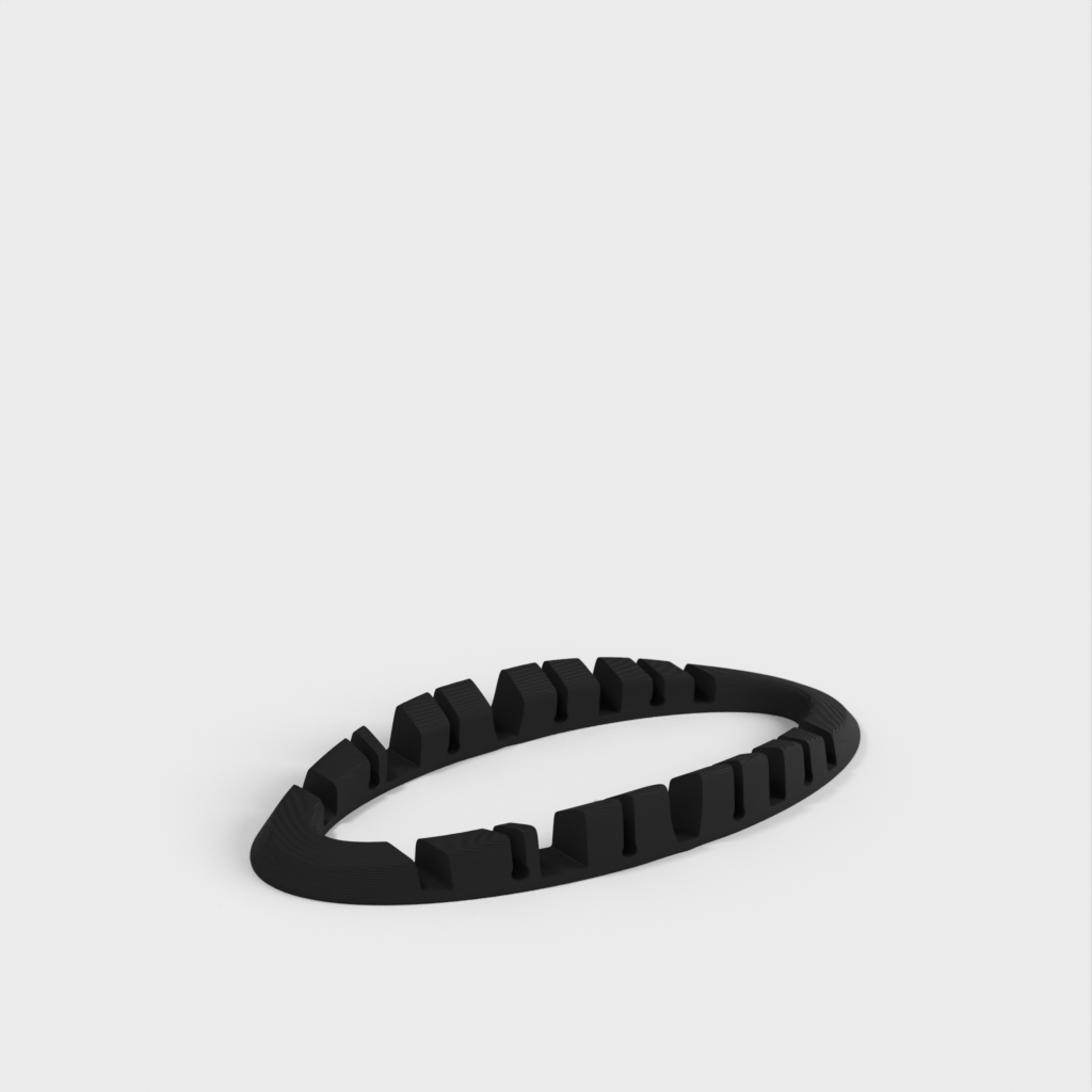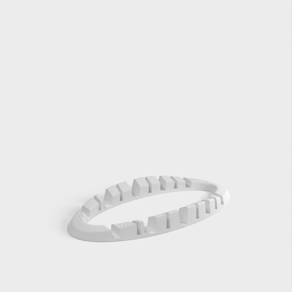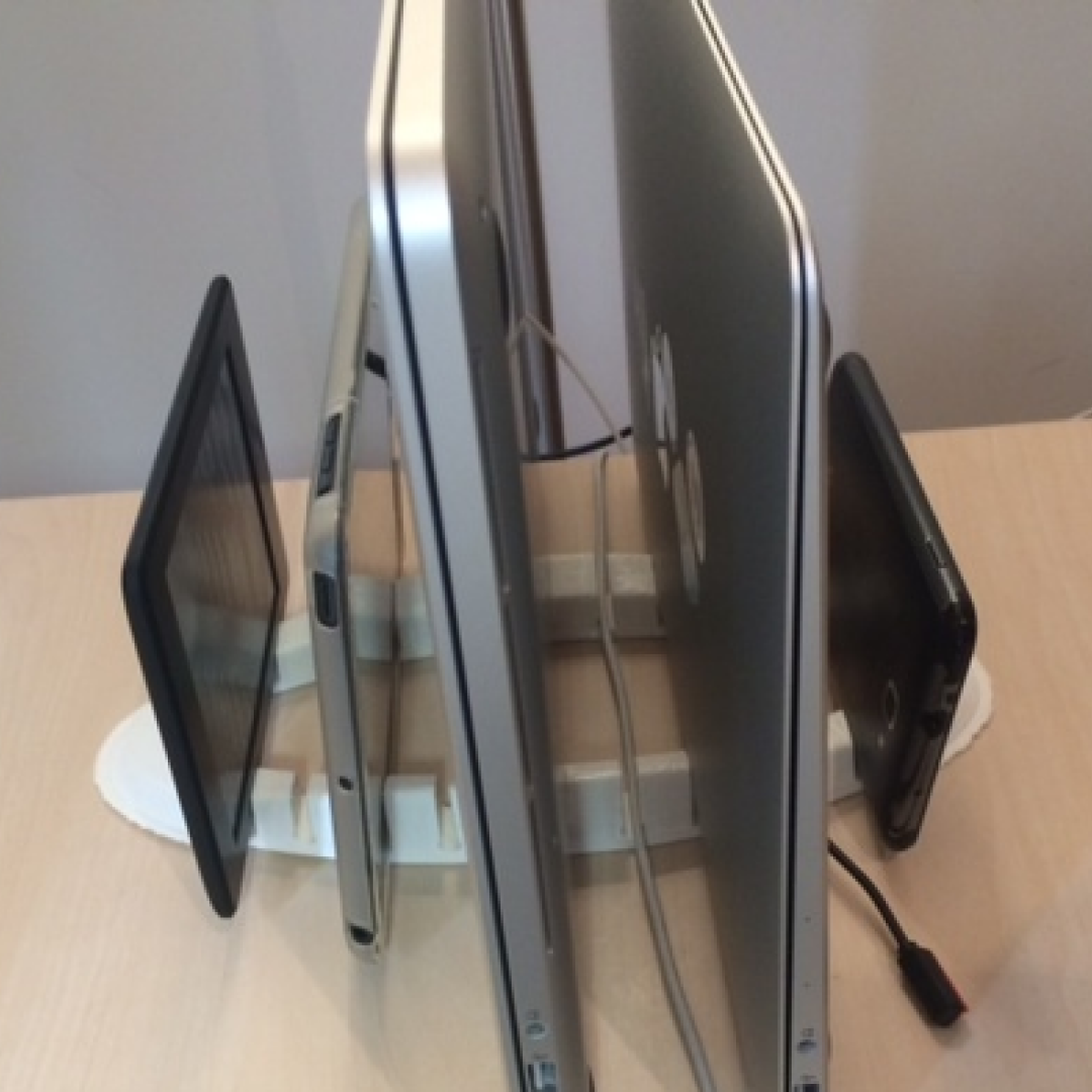 Soporte vertical para guardar 5 dispositivos Apple. P.ej. un Macbook Pro Retina 15, Macbook Air 13, Kindle Paperwhite, iPad y iPad mini. También tiene ranuras para cables, para que los cables de carga no salgan volando del escritorio cuando desenchufas.