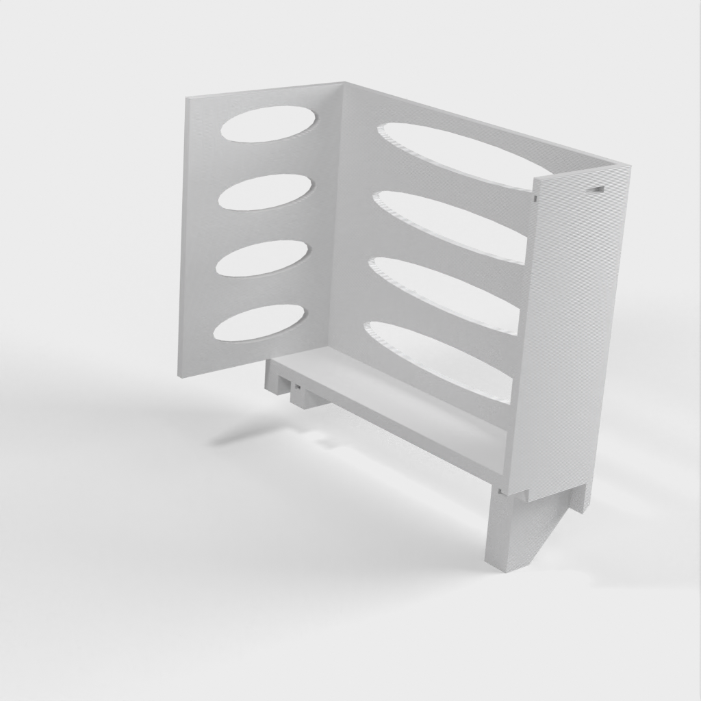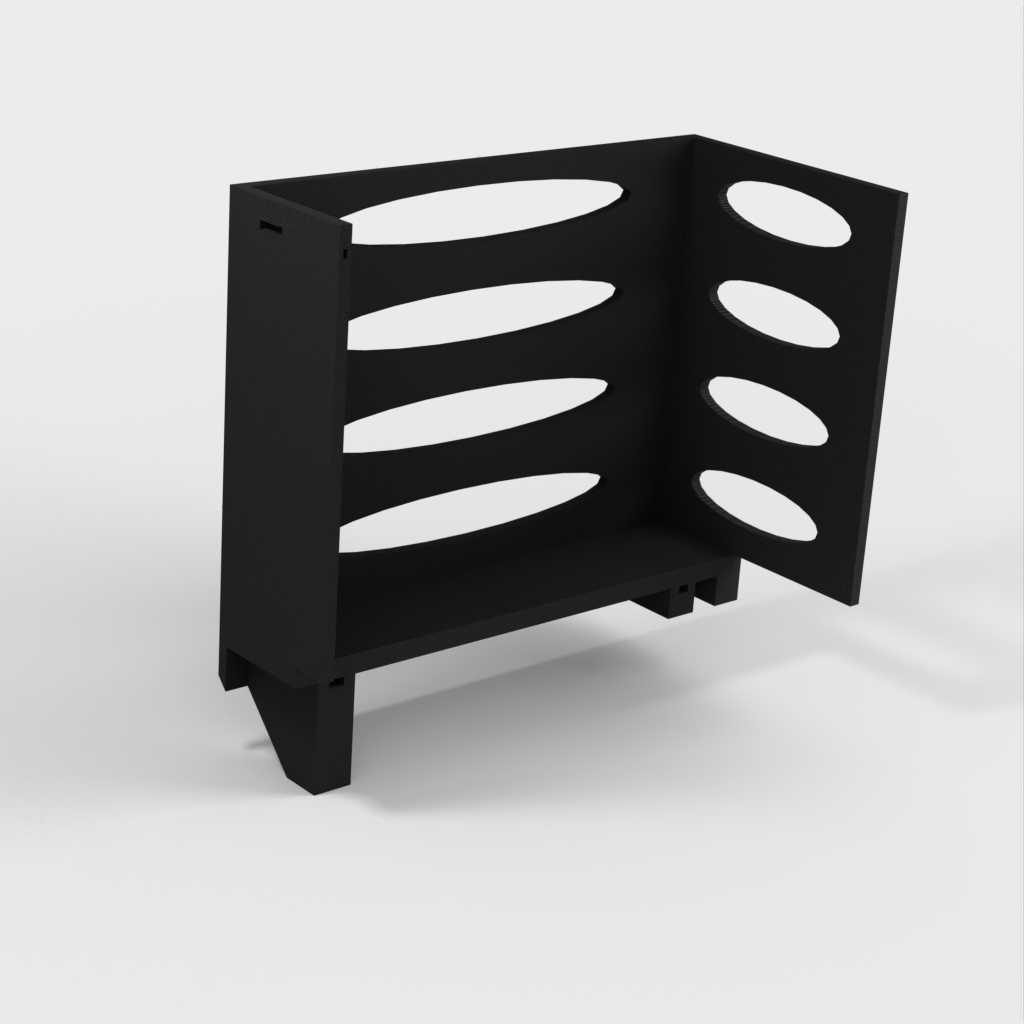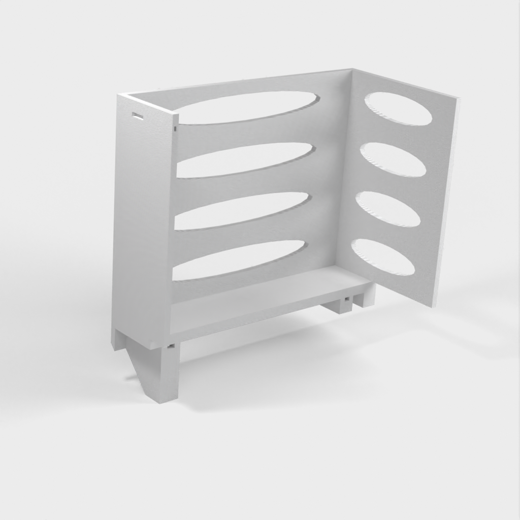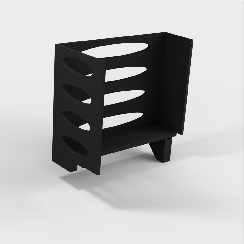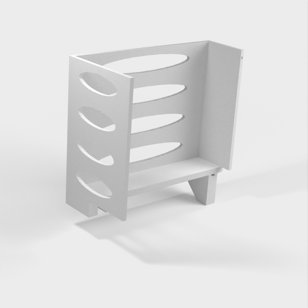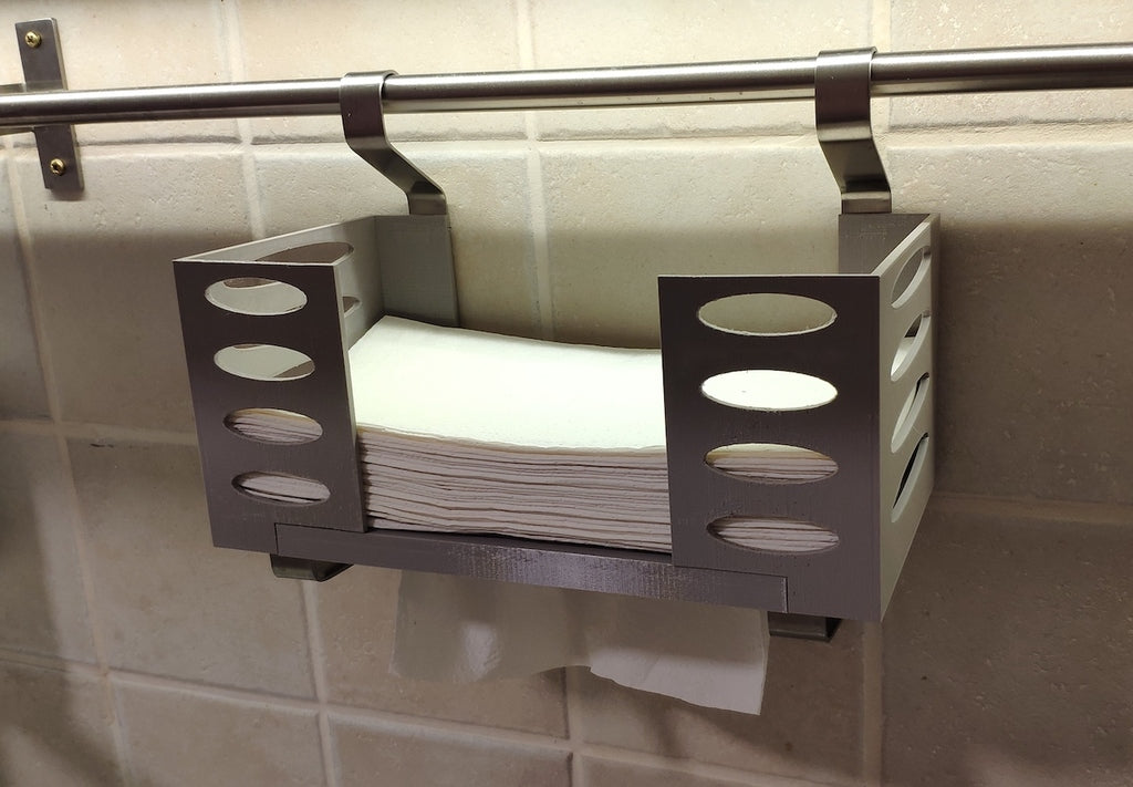 Este dispensador de toallas de papel se puede montar en un soporte de estante Ikea Grundtal. Simplemente retire la bandeja y coloque los elementos impresos en las consolas. El producto tiene aberturas más pequeñas en la parte inferior que se pueden utilizar para sujetar los artículos con un hilo fino. También hay aberturas en la parte posterior para el montaje. Las dimensiones internas son 130x 254 mm.