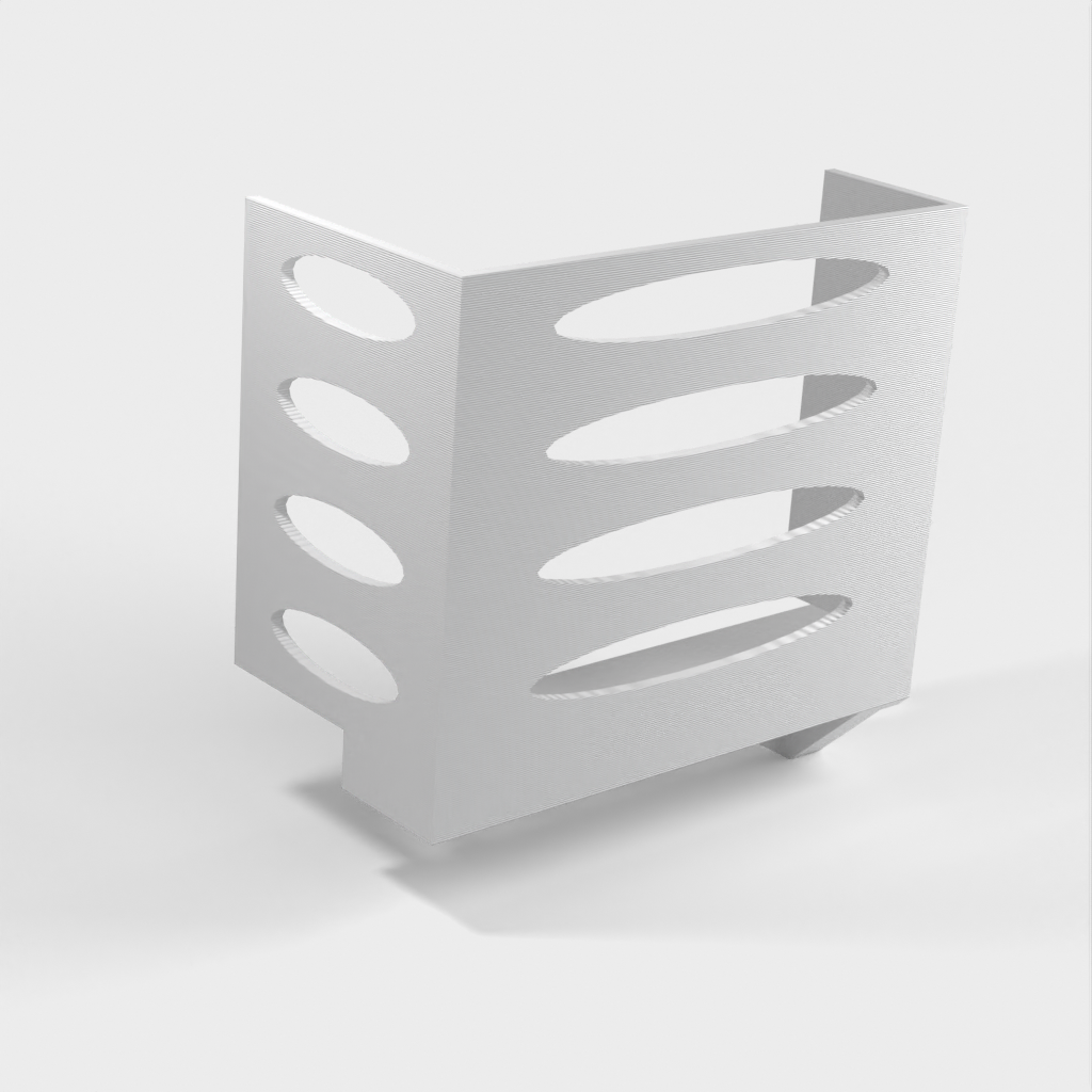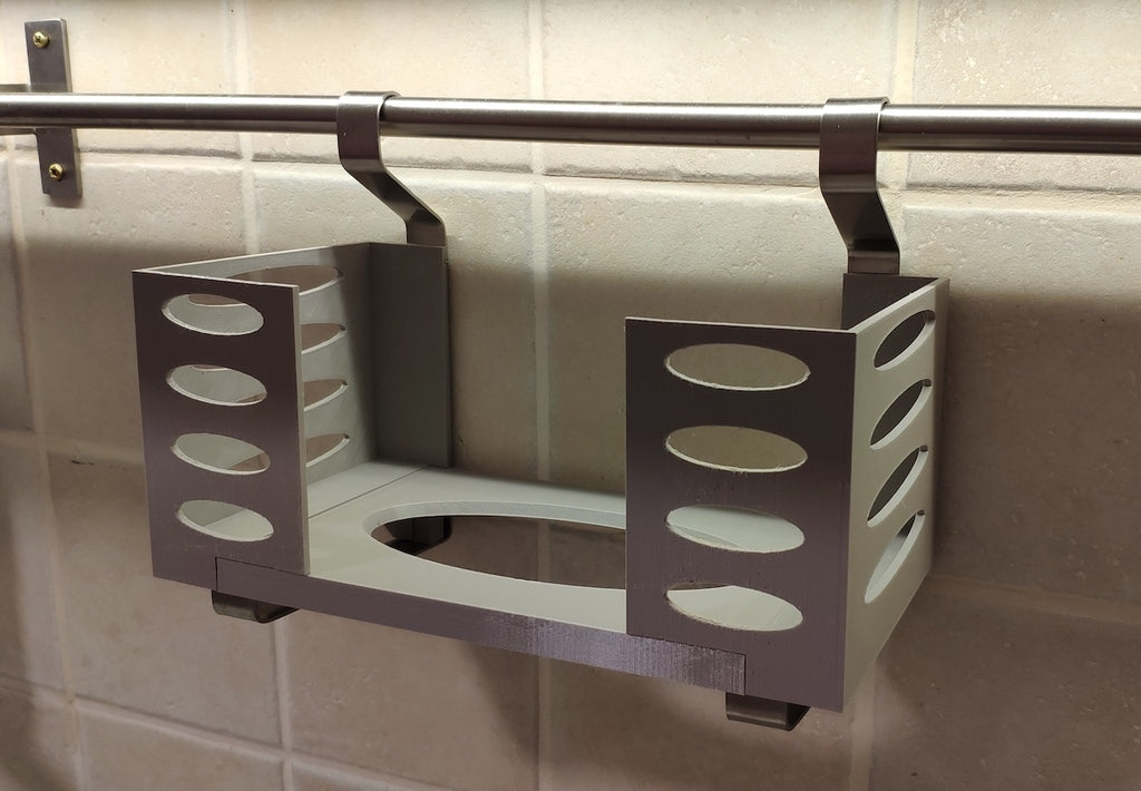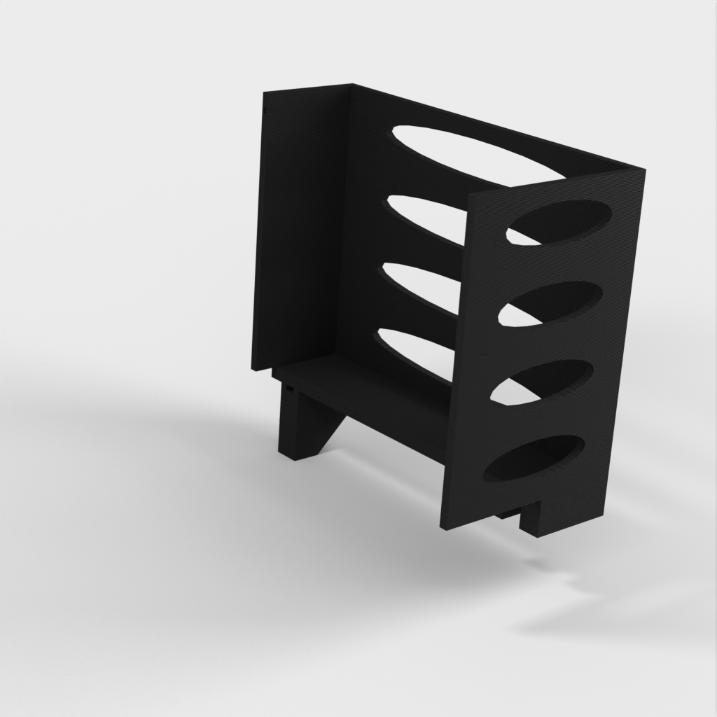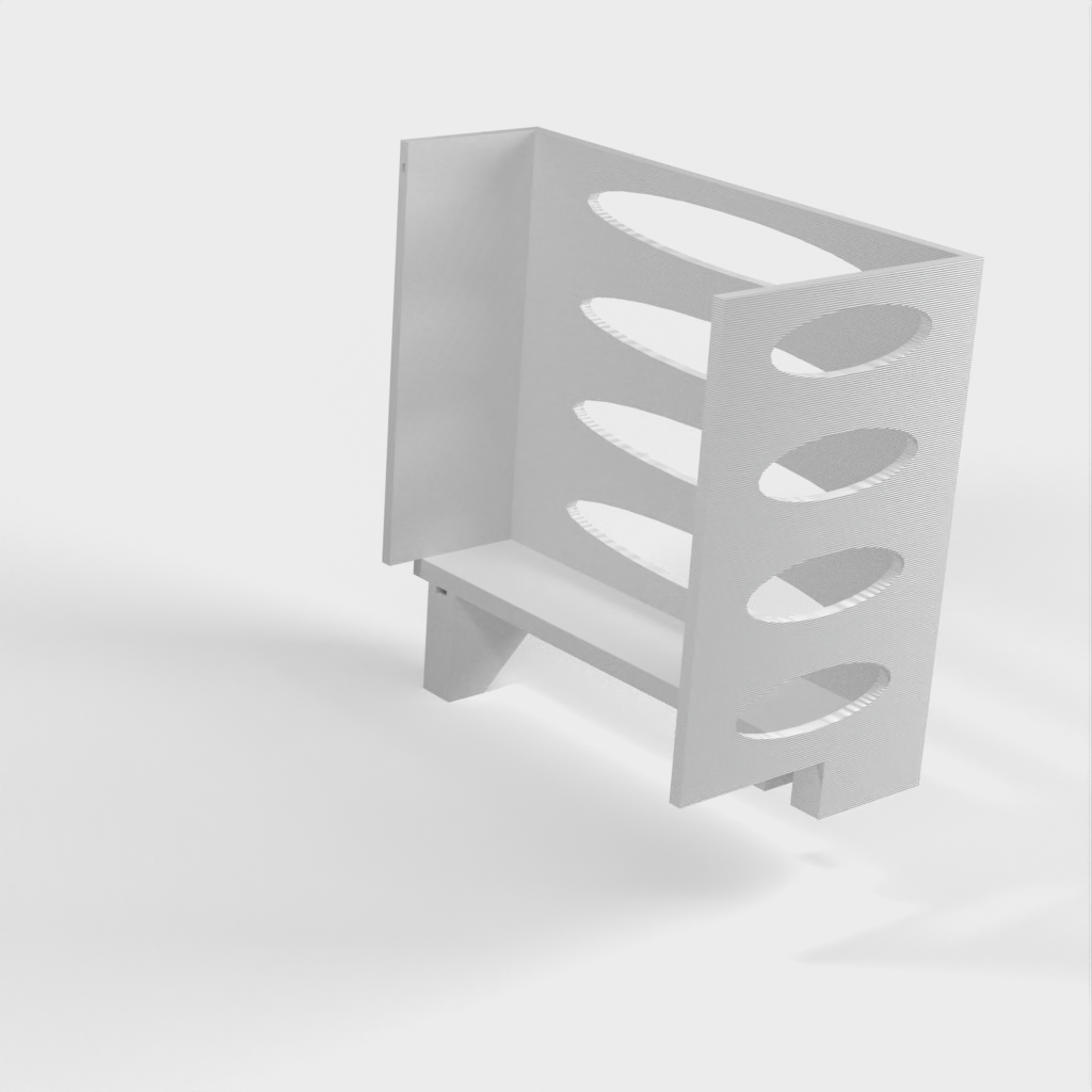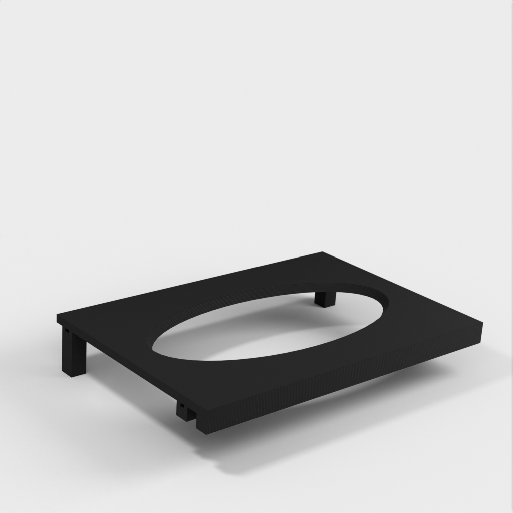 Este dispensador de toallas de papel se puede montar en un soporte de estante Ikea Grundtal. Simplemente retire la bandeja y coloque los elementos impresos en las consolas. El producto tiene aberturas más pequeñas en la parte inferior que se pueden utilizar para sujetar los artículos con un hilo fino. También hay aberturas en la parte posterior para el montaje. Las dimensiones internas son 130x 254 mm.