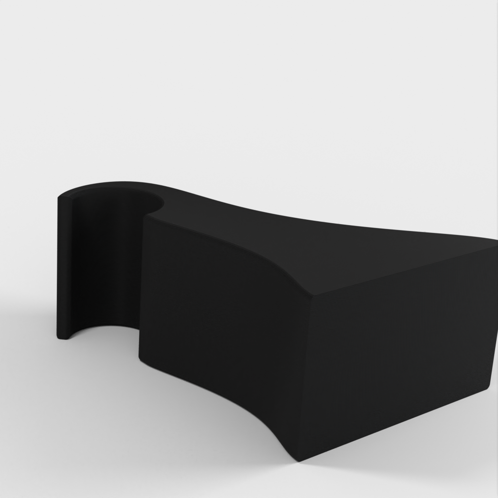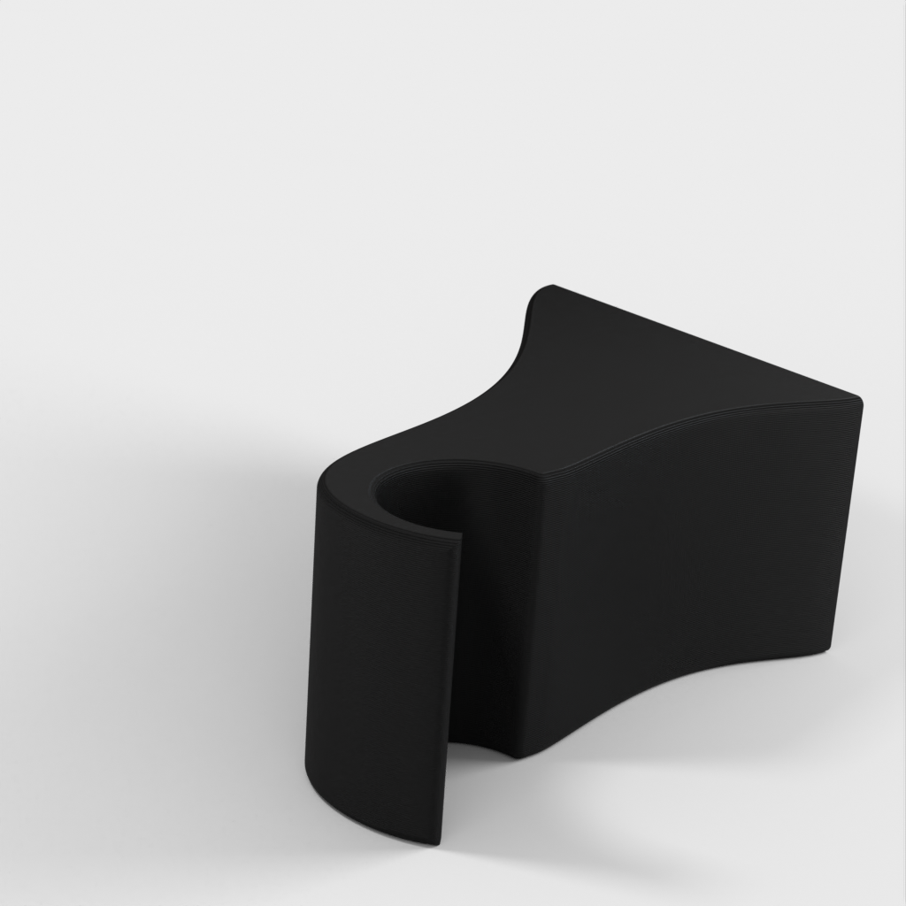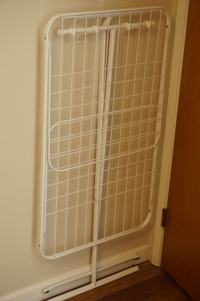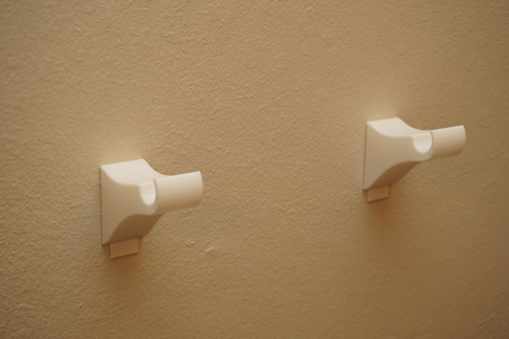 Este es un sencillo soporte de pared para un tendedero Ikea MULIG (número de artículo: 502.287.55 ). Está diseñado para fijarse a la pared mediante cinta adhesiva de doble cara (o en mi caso Command Strips). Utilizo dos para mantener mi estante fuera de la vista detrás de una puerta que normalmente está abierta.