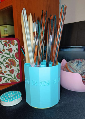 Este organizador giratorio para agujas de tricotar está diseñado para organizar las agujas de tricotar de doble punta por tamaños, pero también puede utilizarse para guardar agujas de ganchillo o material de oficina. Tiene doce compartimentos exteriores y uno ligeramente más alto y grande en el centro. Si no necesitas que gire, se puede imprimir sin base.