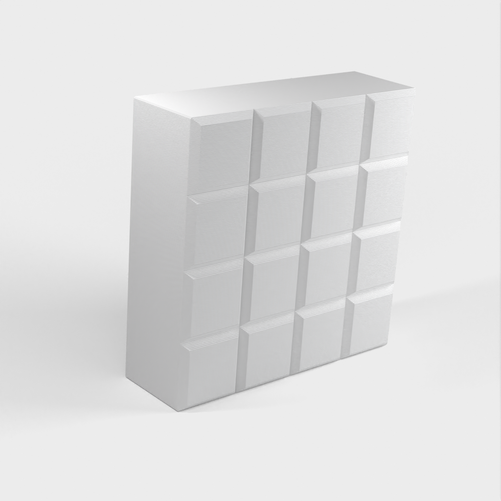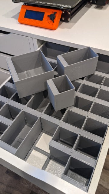 ¡Un sencillo sistema de contenedores modulares para tus cajones Ikea Alex! Los contenedores se pueden personalizar en cualquier tamaño para satisfacer sus necesidades. Los contenedores se ubican en un sistema de rejilla en la parte inferior de los cajones para evitar que se muevan y mantener la alineación. Asas con muescas de cinta de etiquetas para ayudar a mantener todo organizado.