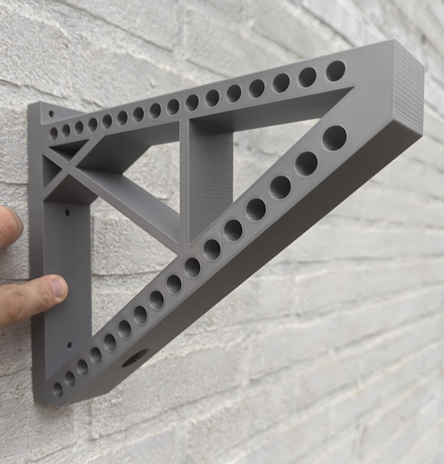 También tiene la opción de agregar soportes de estante impresos, que brindan un soporte estable para sus estantes. Este anclaje de pared es ideal para crear espacio organizado en cualquier habitación, desde la sala de estar hasta el taller, y puede soportar desde libros y cajas de almacenamiento hasta sus objetos y decoraciones decorativos favoritos. La construcción multifuncional con orificios adicionales también permite futuras adaptaciones, por ejemplo, fijar cuerdas desde el techo para asegurar objetos más largos como barras o tablones.