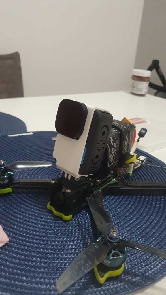 Este es un soporte vertical para GoPro Hero 9, 10 y 11. El kit es sólido y firme, y la cámara se mantiene alejada del marco para no mostrar las palas de la hélice. Además, también permite el uso de filtros ND. Perfecto para tu dron FPV.