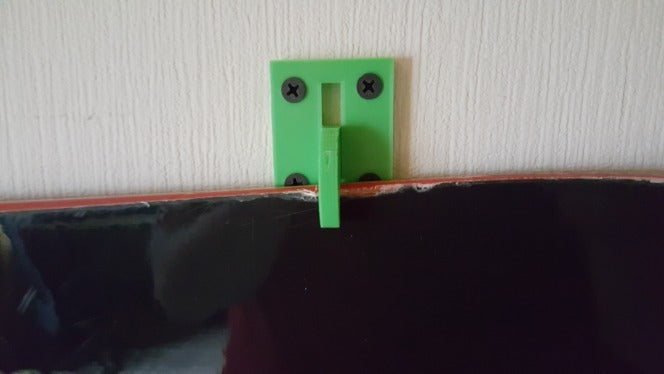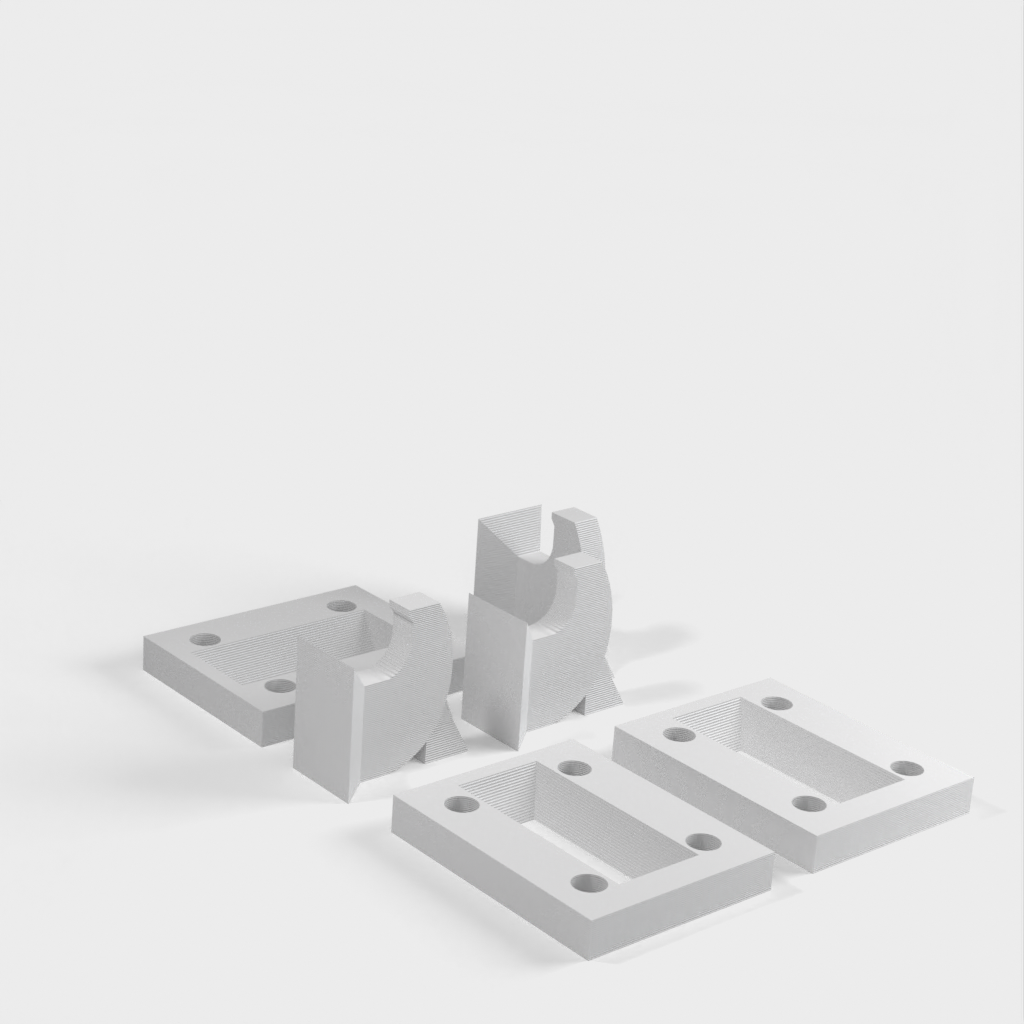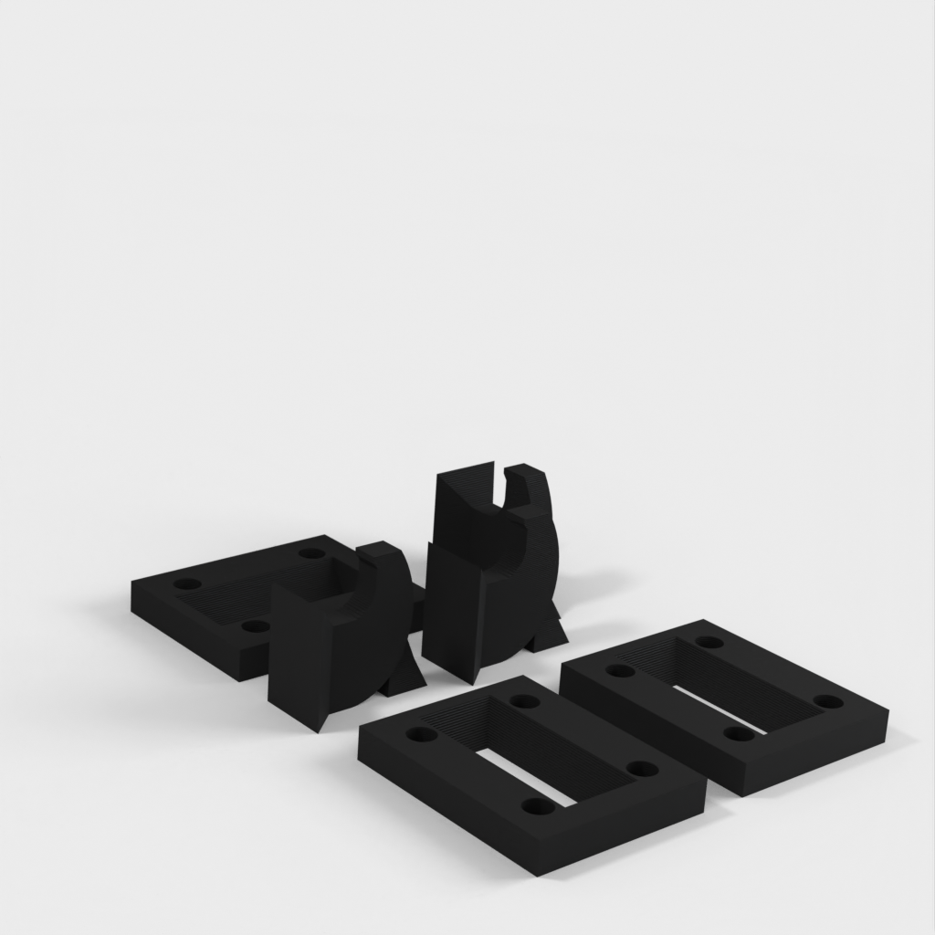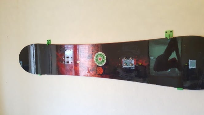 Estas son piezas para sujetar una tabla de snowboard a la pared. Las partes superiores se pueden mover para que se puedan abrir. La tabla de snowboard se puede colocar fácilmente en los soportes, lo que hace que su pared o taller esté más ordenado.