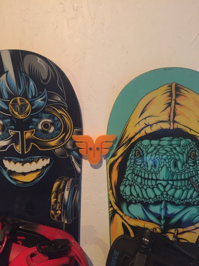 Soporte de pared para snowboard de Thrive Snowboards. Se pueden usar dos de estos para colgar una tabla de snowboard verticalmente en una pared. La manera perfecta de guardar tu tabla de snowboard de forma segura y elegante.