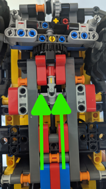 Soporte de pared para el modelo Lego Technic 42122 Jeep Wrangler. Este soporte está diseñado para montar tu modelo de Jeep Wrangler de Lego de forma segura en la pared. Como se muestra en la imagen, el soporte se conecta a la parte inferior del modelo a ambos lados de la barra de dirección.