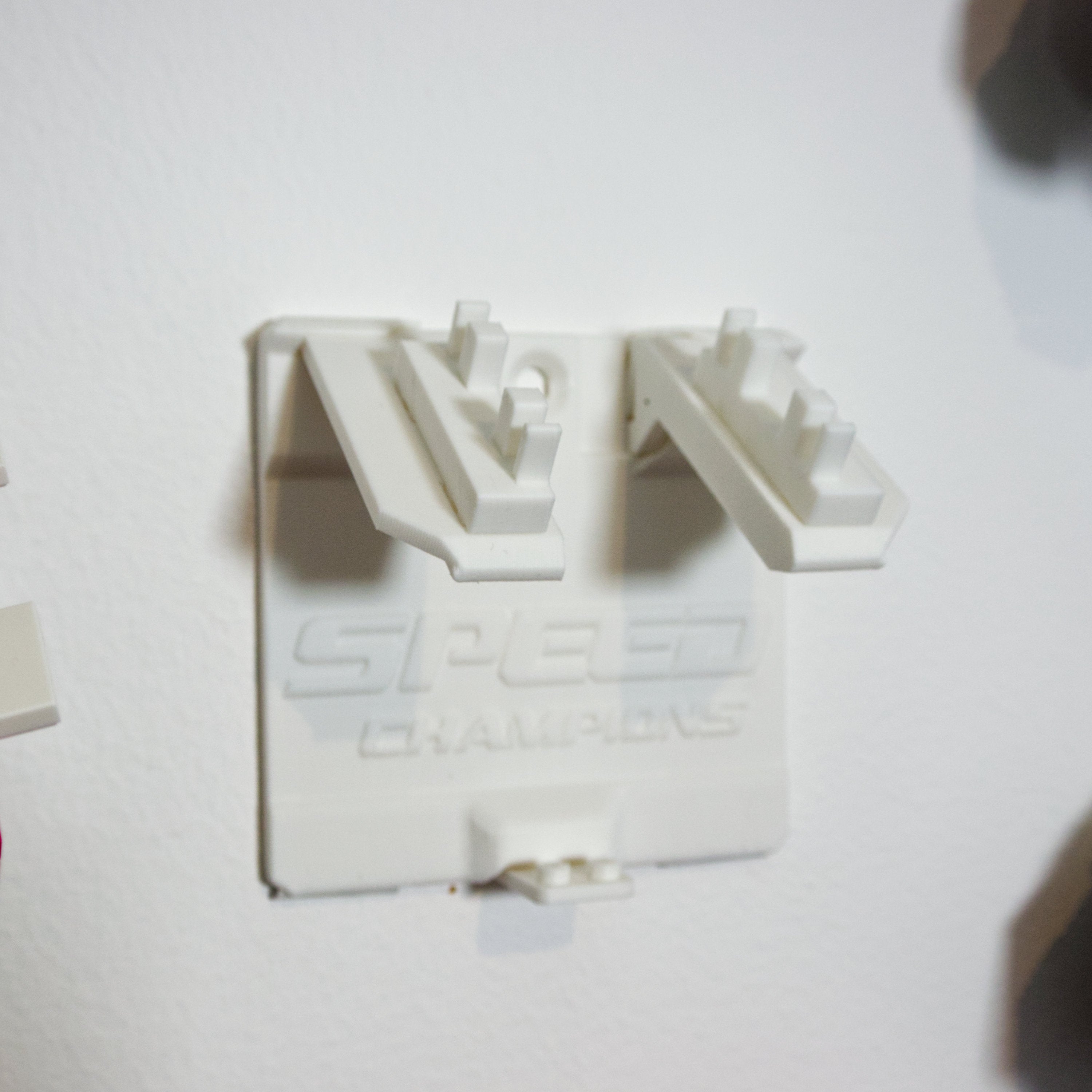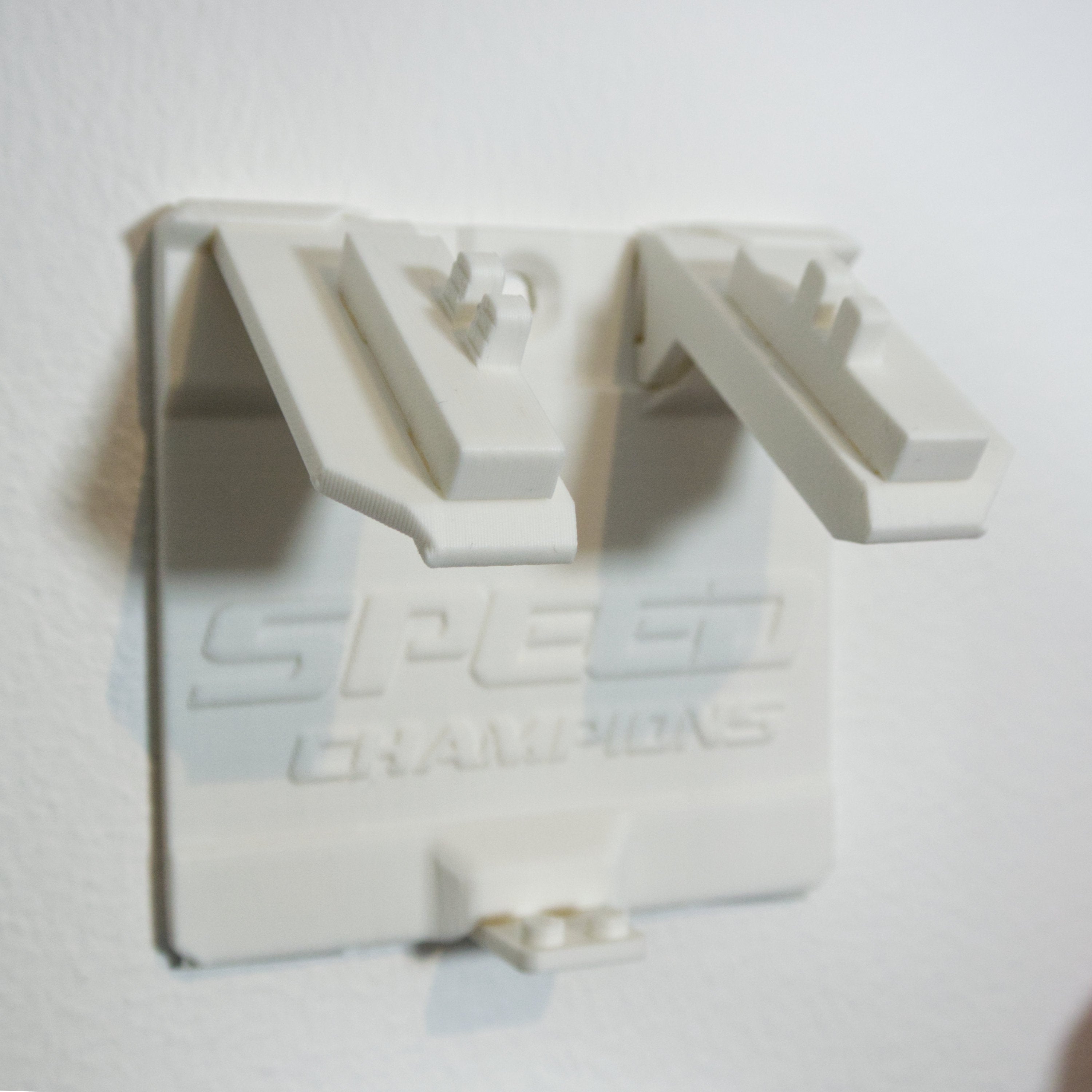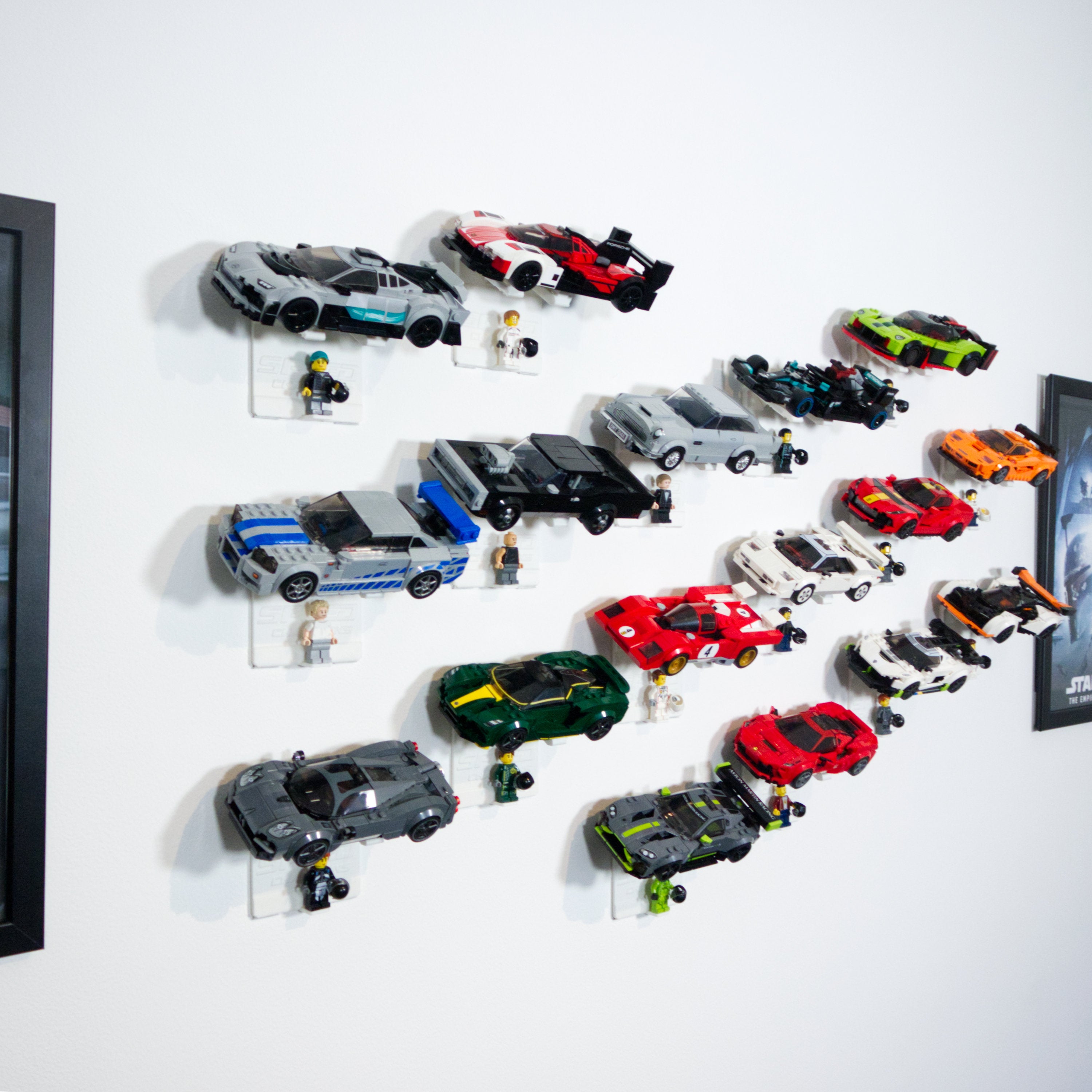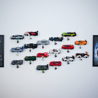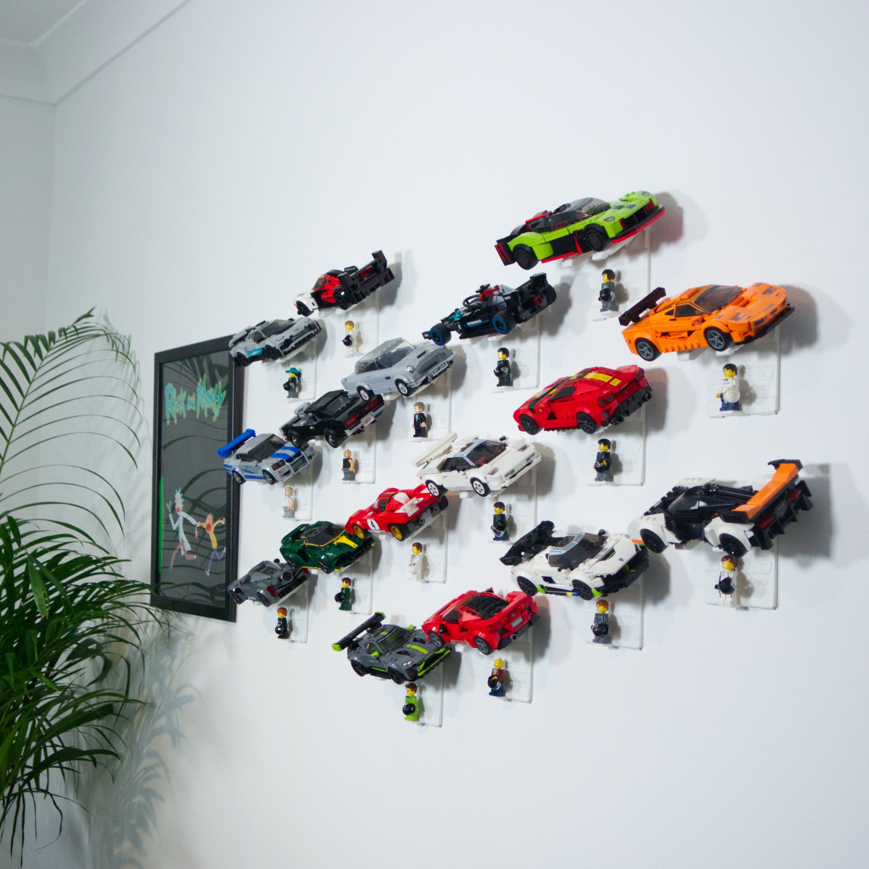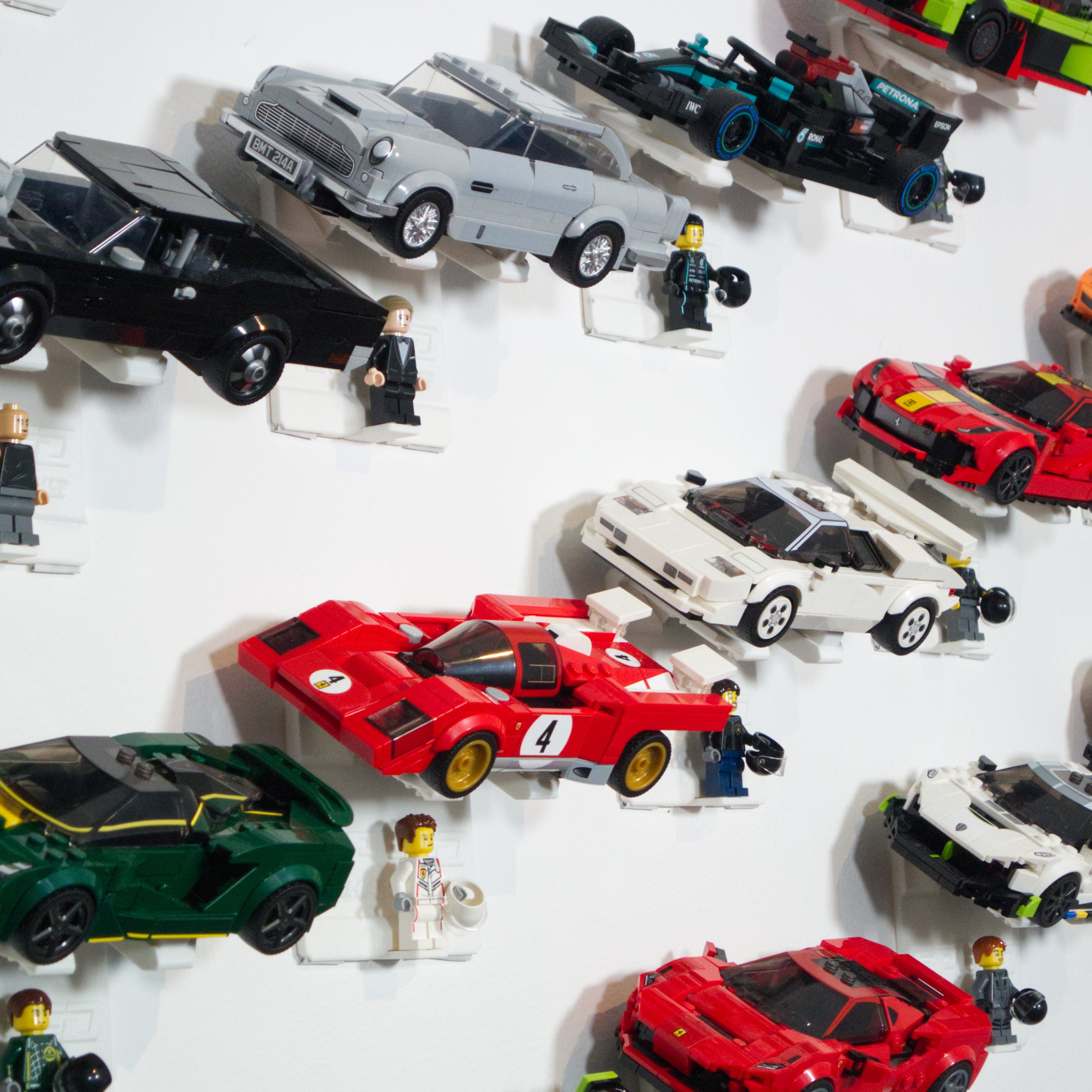 Este soporte de pared le permite exhibir sus coches LEGO Speed Champions en la pared. El sistema incluye varios adaptadores para adaptarse a casi todos los modelos, tanto nuevos como antiguos. El coche queda firmemente sujeto y se incluye un estante para que la minifigura pueda colocarse al lado. Se monta con tornillos o cinta adhesiva.