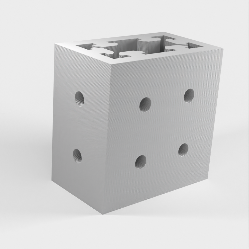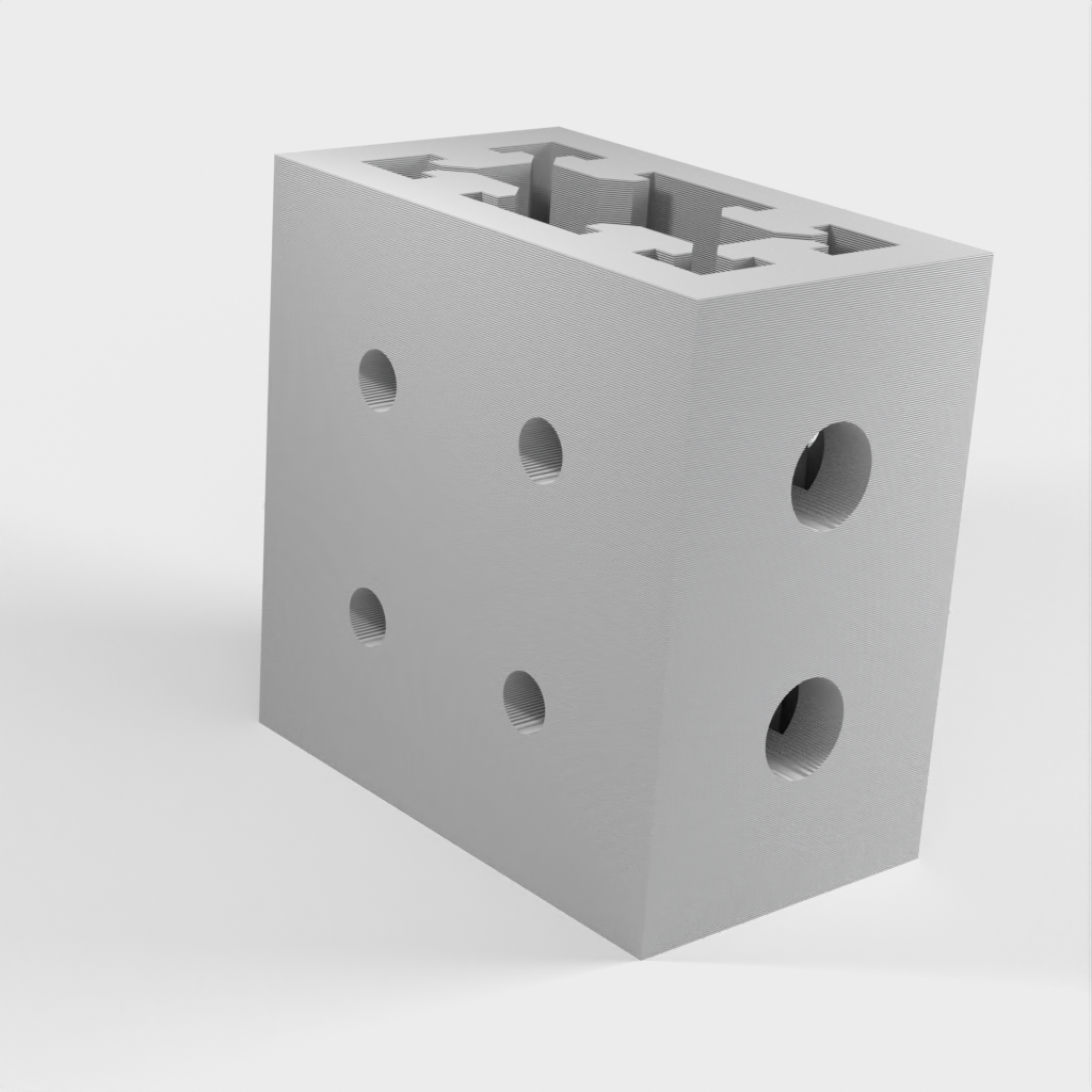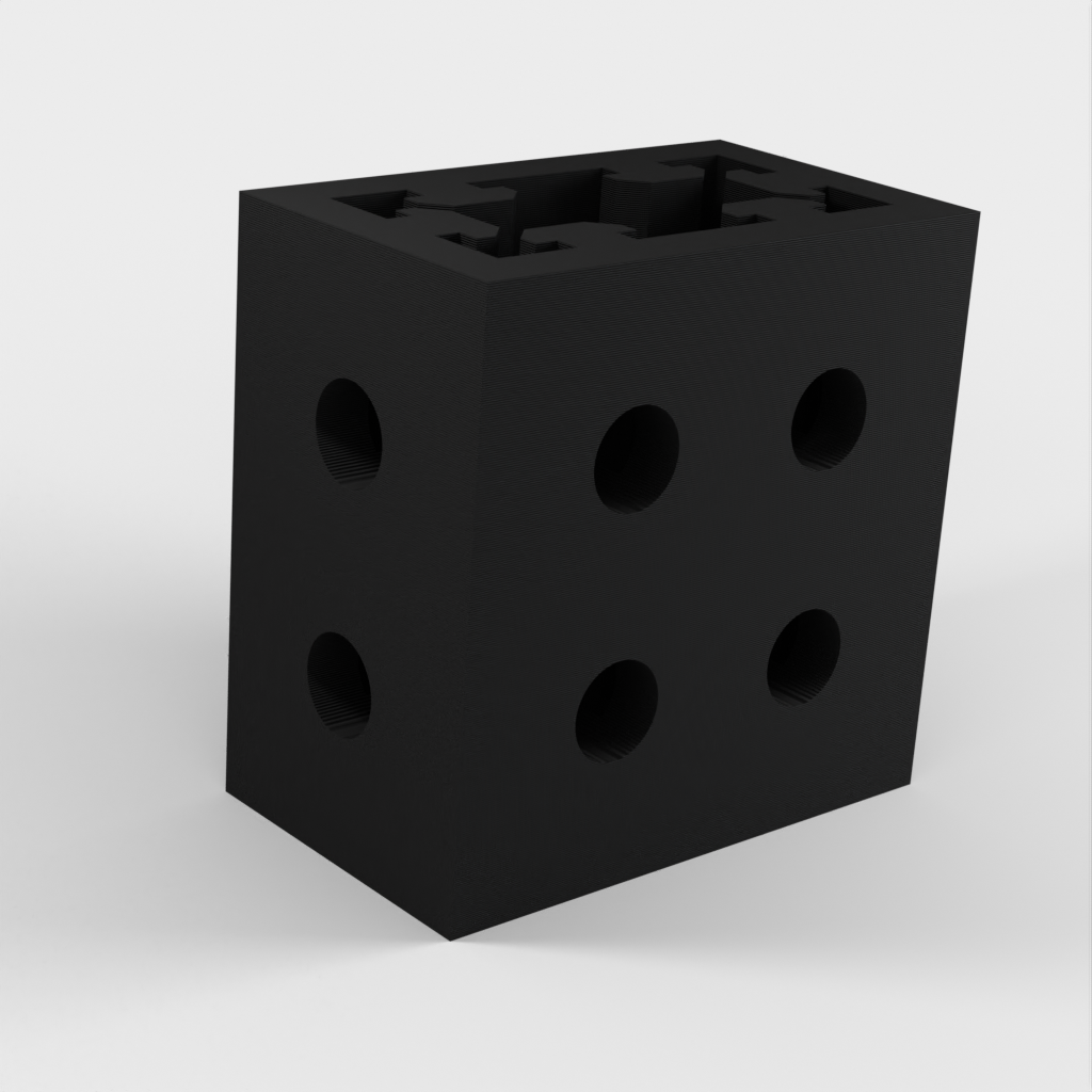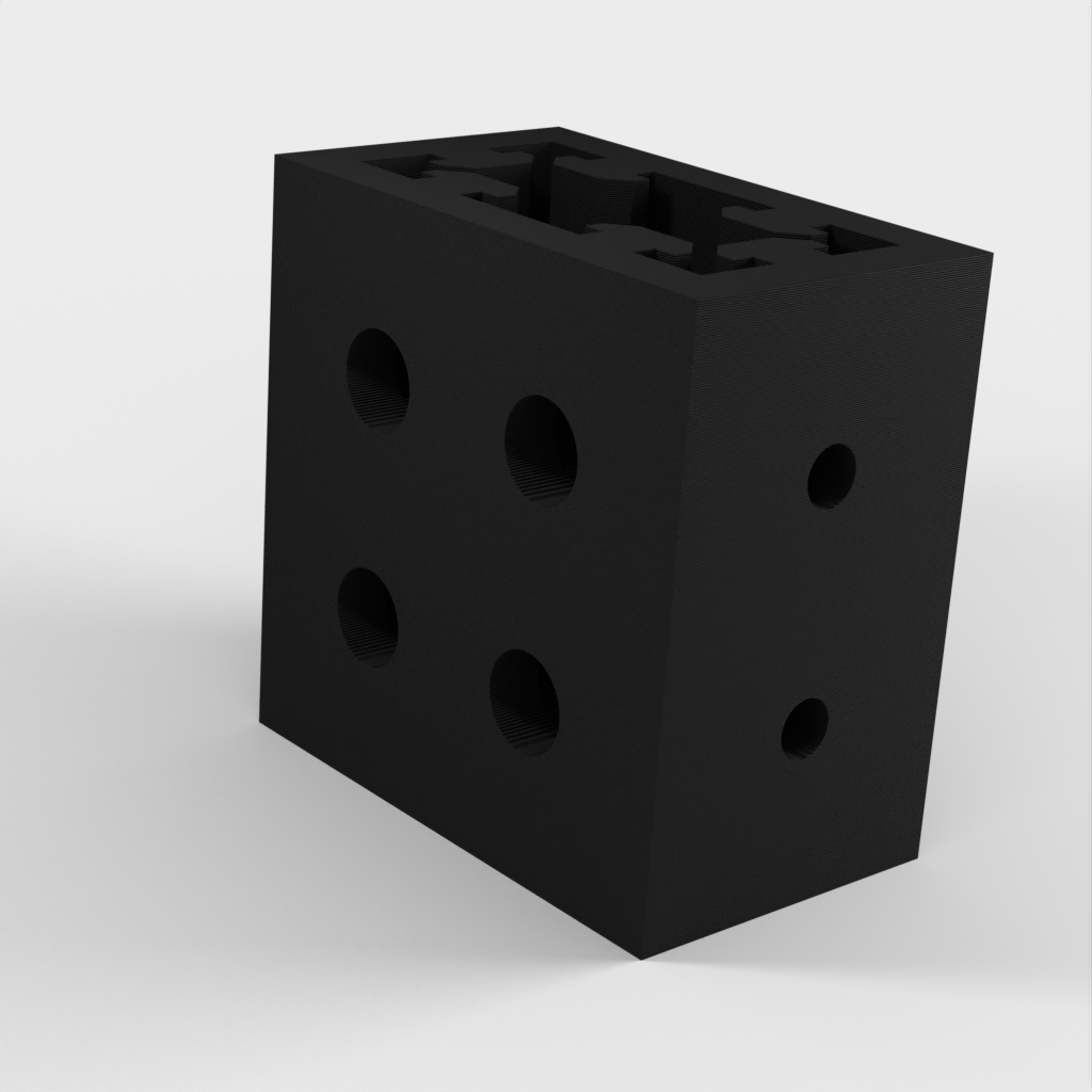 Esta herramienta de guía de broca ajustable es ideal para perfiles T-Slot y V-Slot. Nuestro riel de perforación ayuda con perforaciones precisas para pernos y tapas de pernos. Esta guía de perforación está diseñada para orificios de 5 mm en un lado para perforar el perno y orificios de 8,3 mm en el otro lado para perforar la tapa del perno. También es útil para ayudar a cortar roscas en el extremo de la extrusión. Para obtener el mejor resultado, la extrusión debe insertarse completamente.