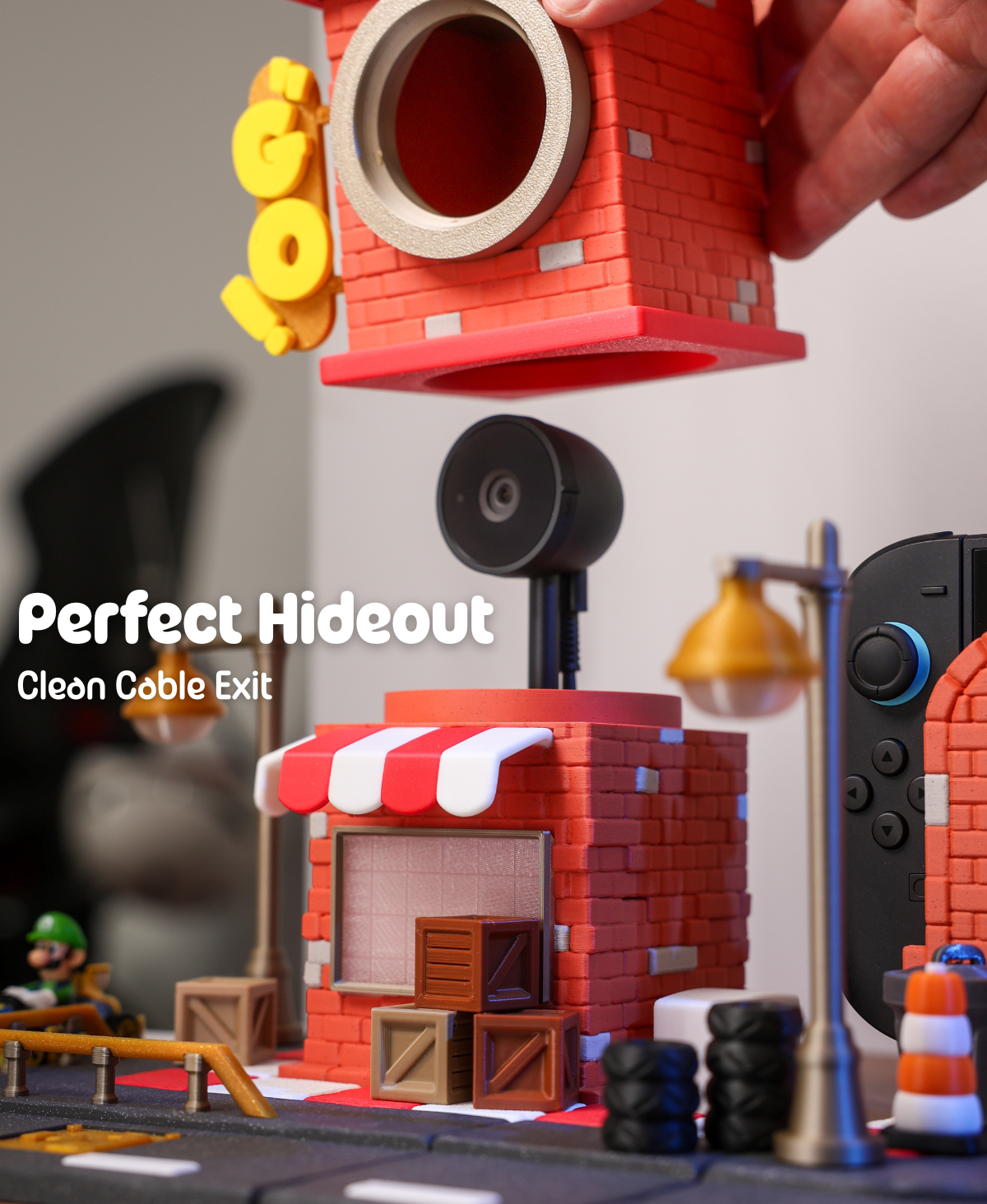 Esta Torre de Cámara, parte de la colección Turbo District, asegura su Nintendo Switch 2 Camera. Puede activar fácilmente la función de privacidad girando el segundo piso de la torre y ocultando la cámara. Cuenta con una gestión de cables discreta y una plataforma superior ideal para exhibir una figura amiibo en su configuración de juego.