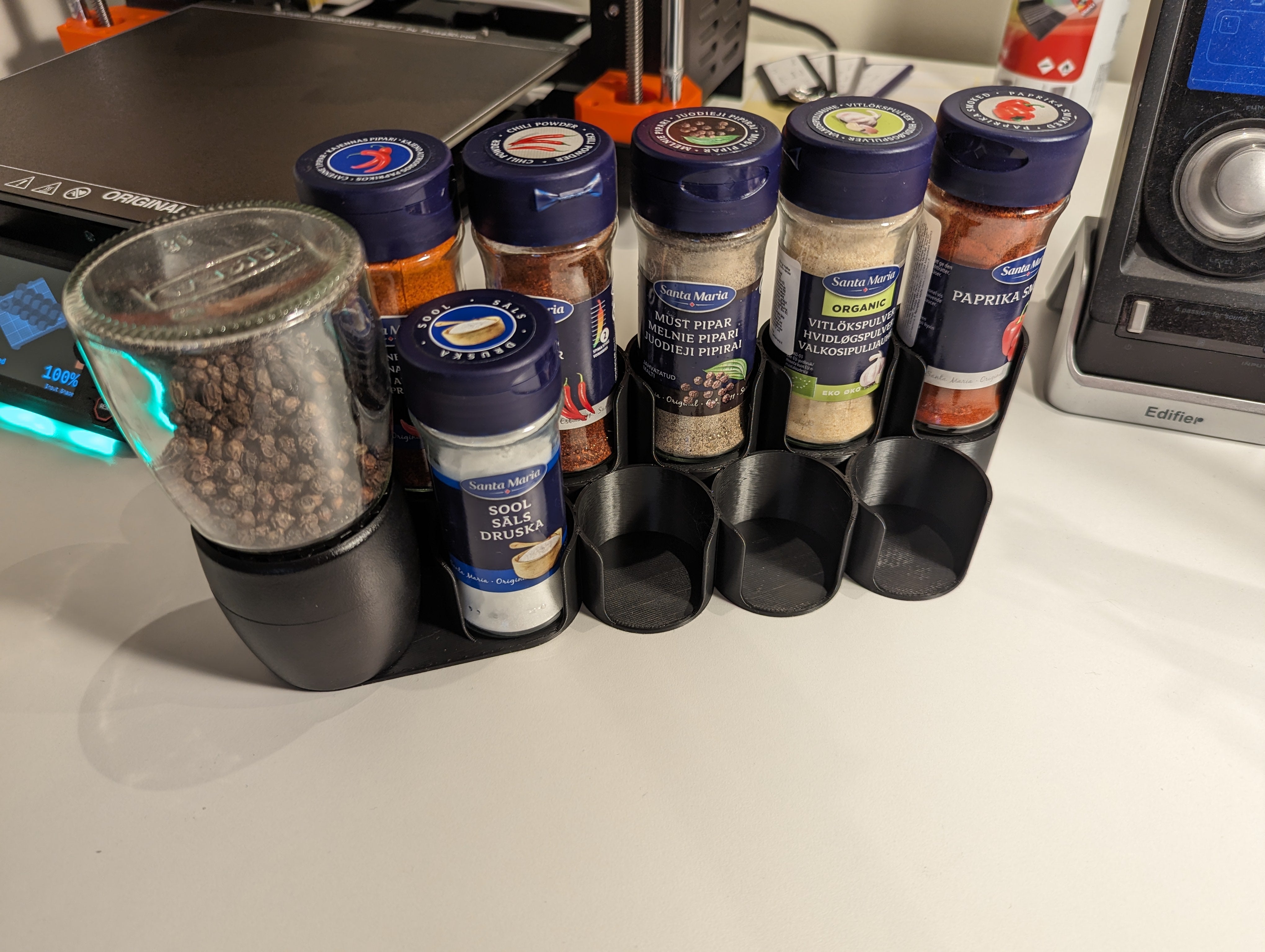 Un especiero individual diseñado para alojar 9 tarros de especias 'Santa Maria' y 1 molinillo de especias IHÄRDIG de Ikea. Cada ranura para tarros de especias tiene un diámetro interior de 42,2 mm. Esto hace que organizar y almacenar las especias sea fácil y cómodo.