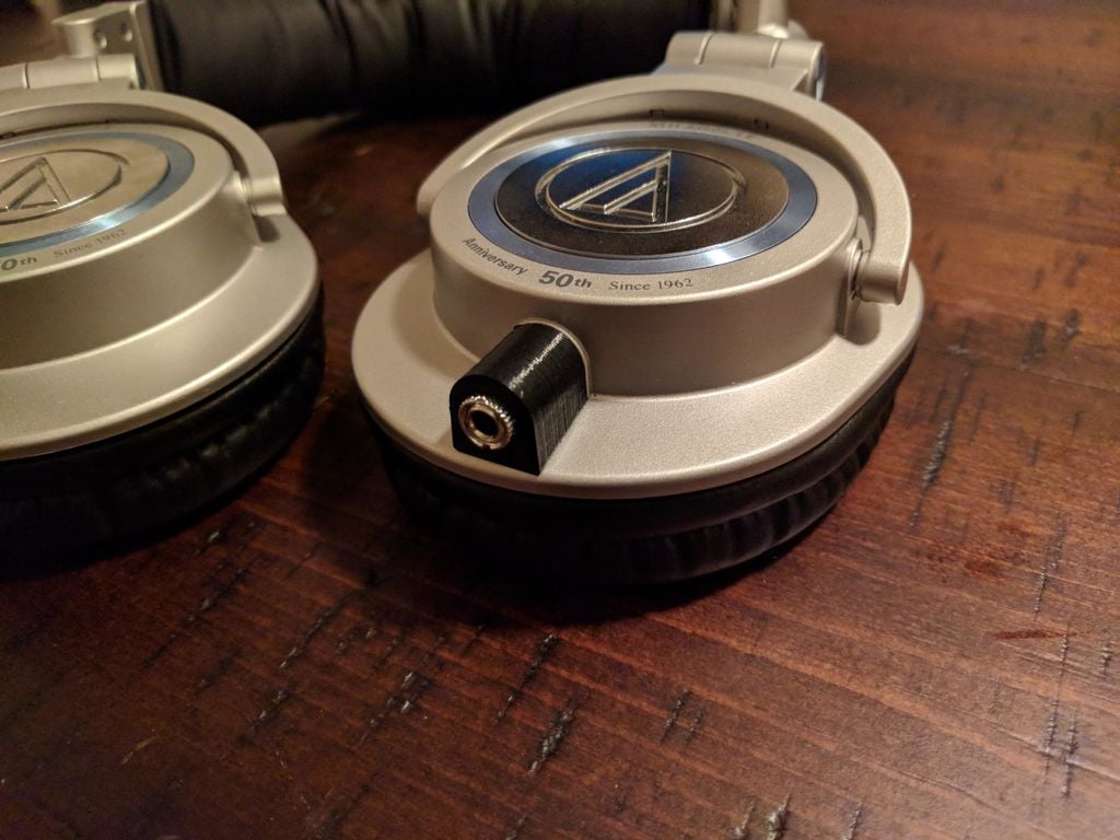 Esta carcasa compacta está diseñada para integrar un conector de audio hembra de 3,5 mm, lo que permite que el cable fijo de sus auriculares Audio Technica ATH-M50s sea extraíble. Esta modificación proporciona mayor flexibilidad y comodidad en el manejo de los cables de los auriculares.