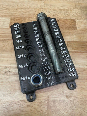 Esta herramienta de clasificación de pernos está diseñada para ayudar a organizar pernos y tuercas en estándar métrico. Funciona como una herramienta de medición eficaz que permite identificar tamaños desde M3 hasta M16, así como longitudes desde 5 mm hasta 155 mm, divididas en intervalos de 5 mm.