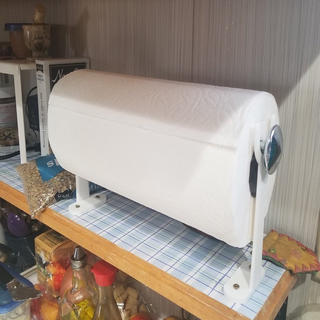 Este portarrollos de papel es una solución práctica para guardar el papel de cocina, diseñado para apoyarse libremente sobre una encimera o banco de trabajo. Es ideal cuando se desea un fácil acceso a los rollos de papel sin tener que hacer agujeros en armarios o baldosas nuevos.