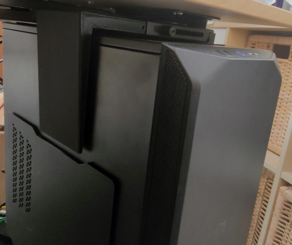 Esta extensión para soportes de torre de PC debajo del escritorio le permite montar su computadora discretamente debajo del escritorio. Está diseñado para ampliar la capacidad de los soportes de PC estándar, para que puedan acomodar cajas de torre más grandes con un ancho de hasta 26 cm. Esto es particularmente útil para gabinetes de computadora modernos, como BeQuiet Base 500, que a menudo exceden las medidas estándar.