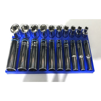 Estos organizadores para llaves de vaso de 1/4" están diseñados para mejorar la organización en su caja de herramientas tanto para tamaños métricos como SAE. Ayudan a mantener sus llaves de vaso almacenadas sistemáticamente, lo que facilita su localización y acceso durante el trabajo. El diseño es compatible con llaves de vaso estándar y profundas.