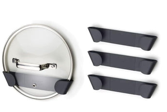 Este práctico organizador de puertas de armario está diseñado para crear orden entre las tapas de sus ollas y mantenerlas fácilmente accesibles. Al aprovechar el espacio a menudo pasado por alto en el interior de las puertas de sus armarios, puede liberar valioso espacio en los estantes de los armarios de su cocina. El sistema ayuda a evitar que las tapas se amontonen o ocupen espacio innecesario. Garantiza que las tapas de sus ollas estén almacenadas de forma segura y al alcance de la mano cuando las necesite. Una solución sencilla para un entorno de cocina más organizado.