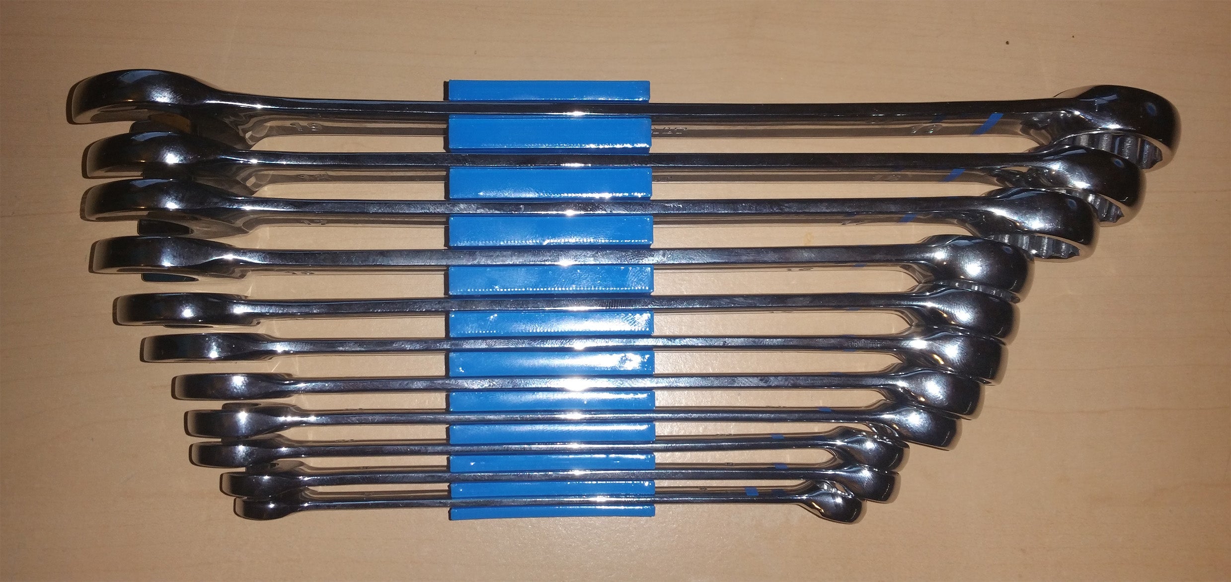 El organizador está hecho a medida para contener tamaños de llave de 8 mm a 19 mm. Cada espacio está equipado con un diseño con bridas que proporciona un agarre firme y seguro en cada llave, evitando que se caigan o traqueteen. Esto asegura que sus llaves permanezcan en su lugar, incluso durante el transporte o si se mueve el organizador.