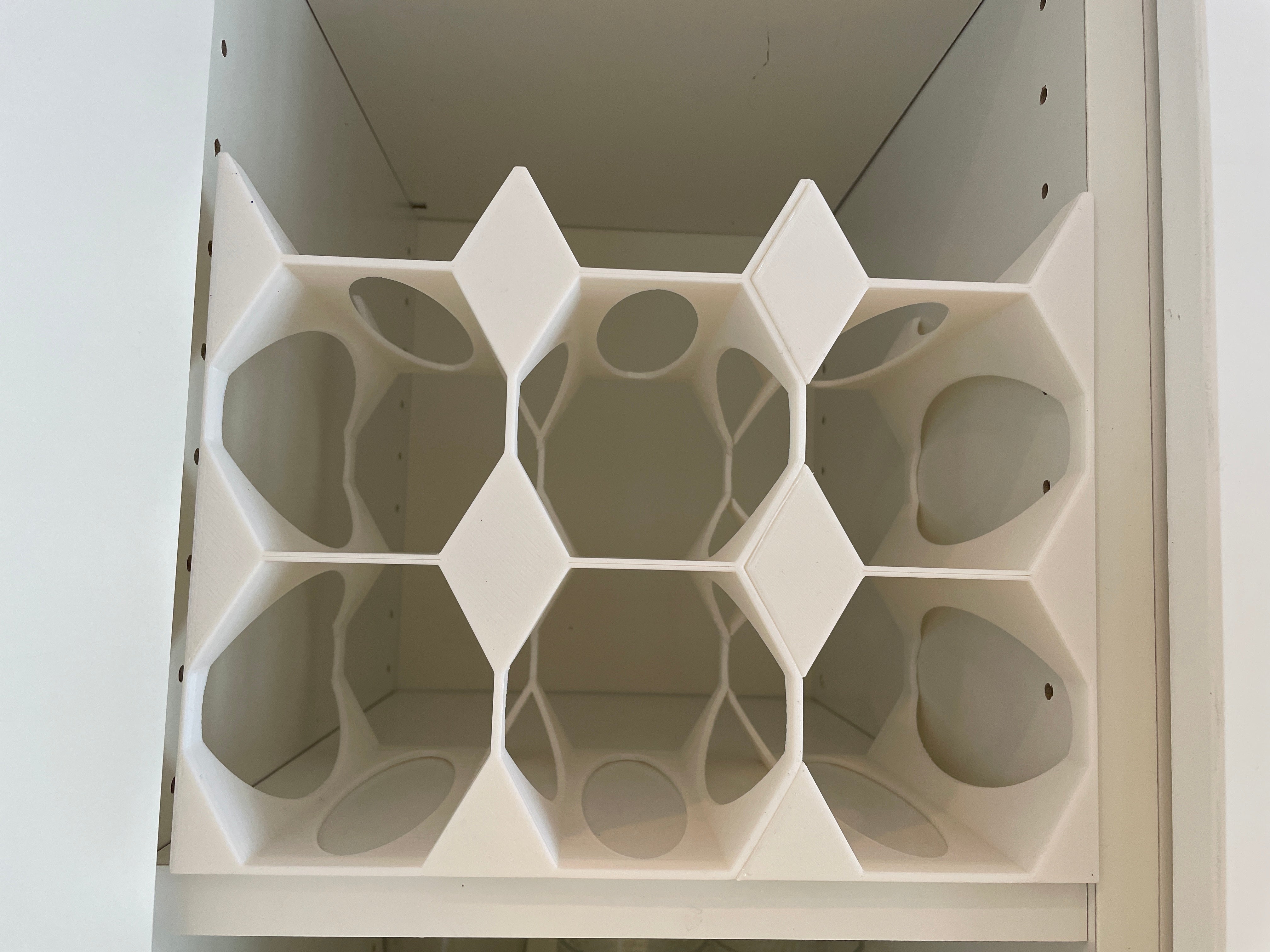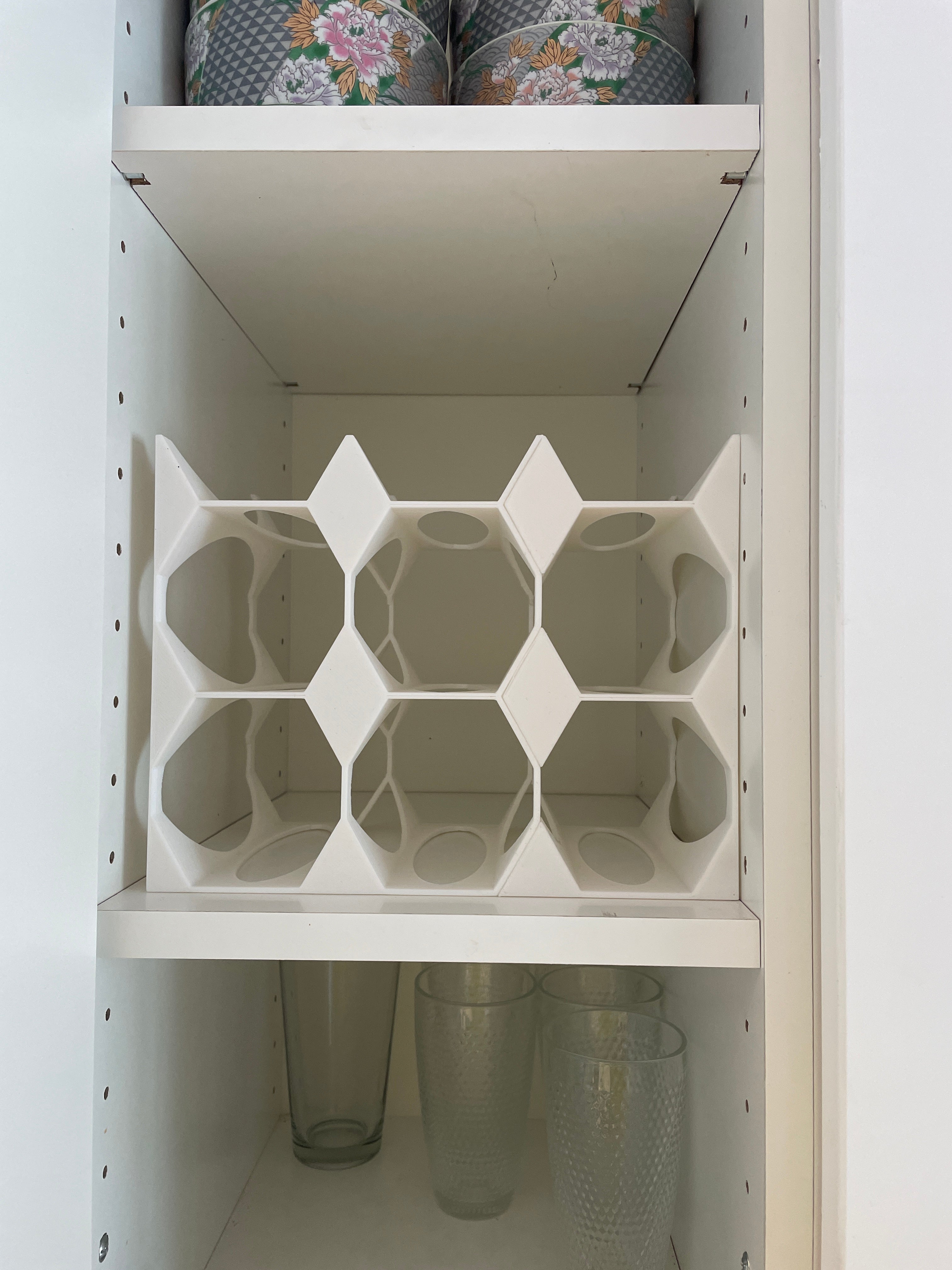 Este botellero está creado para encajar en estantes con un ancho y alto de 260 mm, lo que garantiza un uso óptimo del espacio. Su diseño estrecho proporciona suficiente espacio libre para que pueda deslizarlo fácilmente hacia adentro y hacia afuera, incluso pasando las puertas del armario.