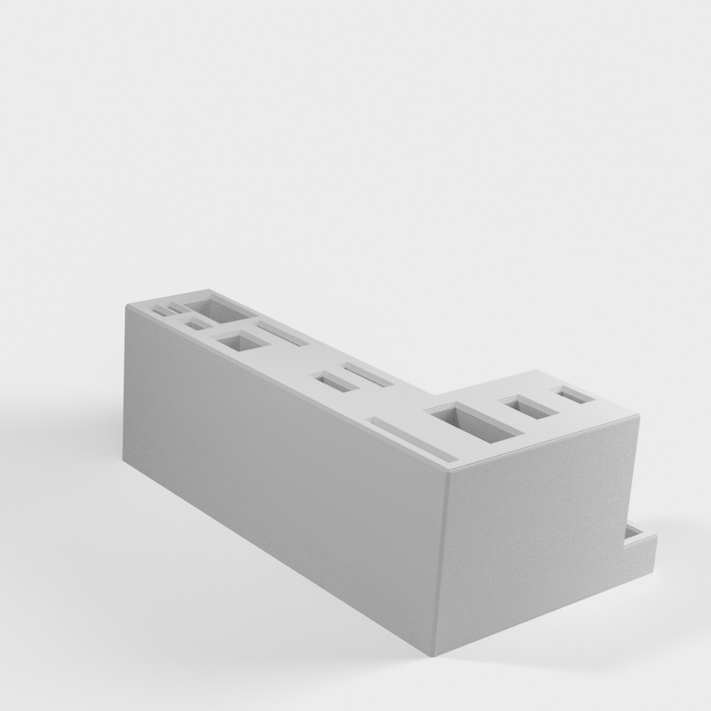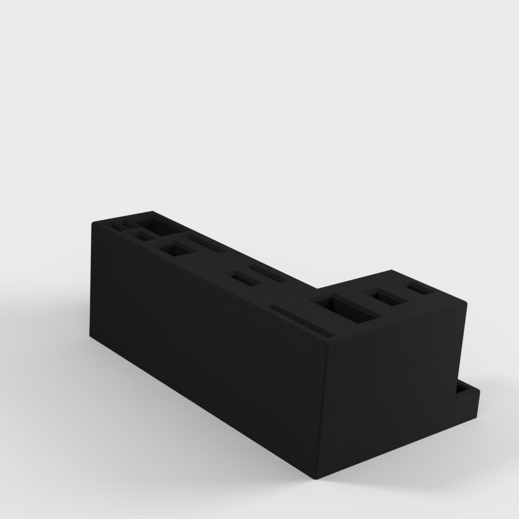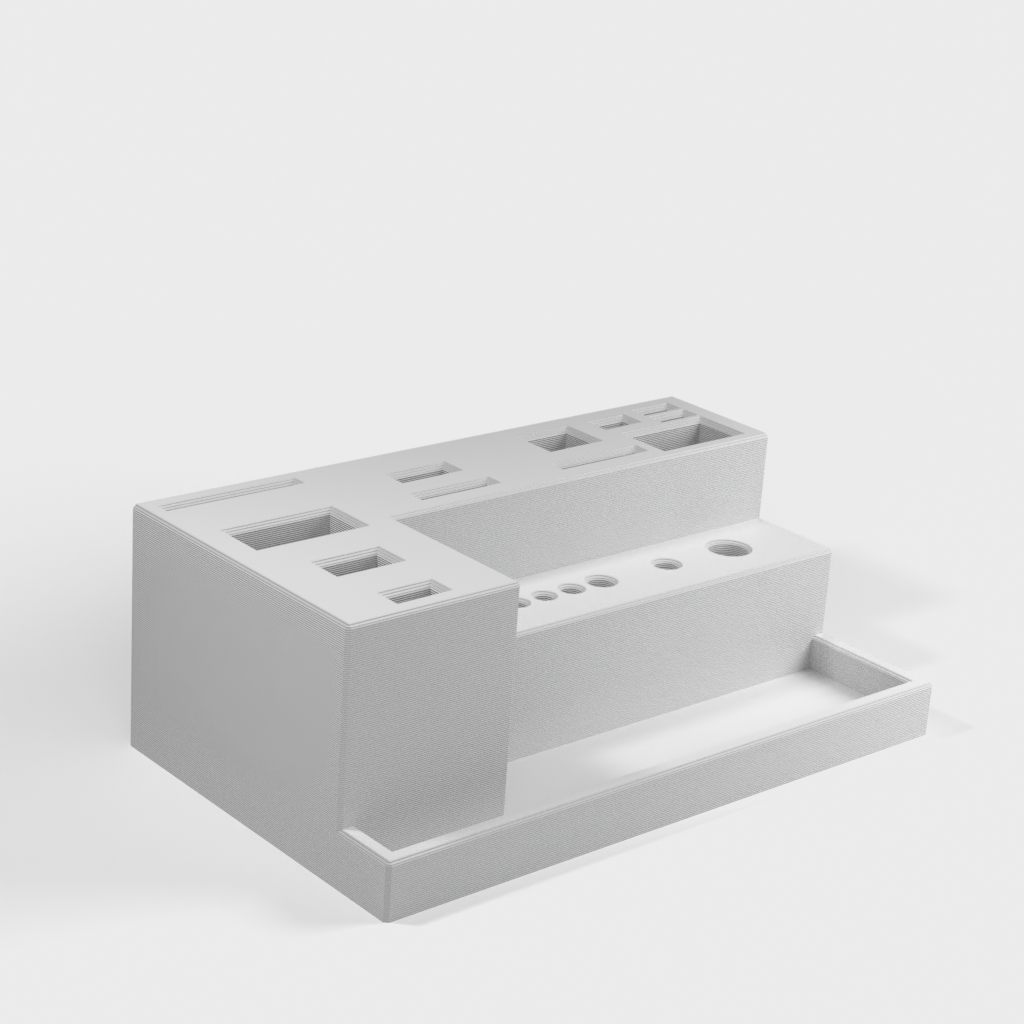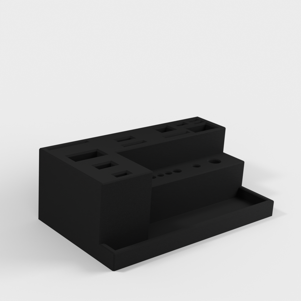 El soporte para herramientas está equipado con una práctica bandeja en la parte delantera que es ideal para almacenar piezas más pequeñas, como tornillos o boquillas, lo que garantiza que estos elementos de uso frecuente estén al alcance de la mano. El producto está diseñado para fabricarse con materiales resistentes como PLA o PETG, lo que proporciona una solución duradera para el uso diario en su entorno de impresión 3D.