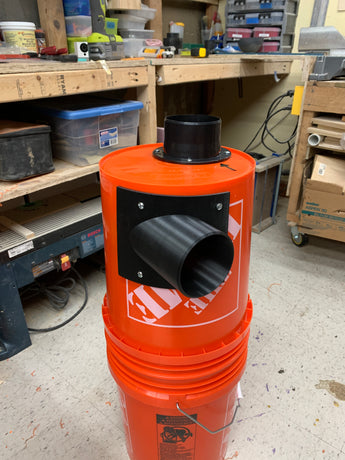 Este separador de polvo ciclónico de montaje lateral está diseñado para transformar un cubo normal de 5 galones en un sistema eficiente de recolección de polvo. Se fija al costado del balde y permite la conexión de una manguera de 4 pulgadas, lo que brinda una solución compacta y funcional para aquellos con espacio limitado en el taller.