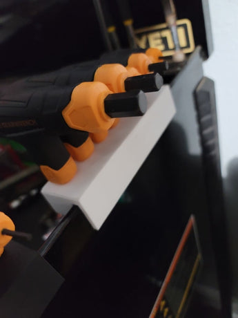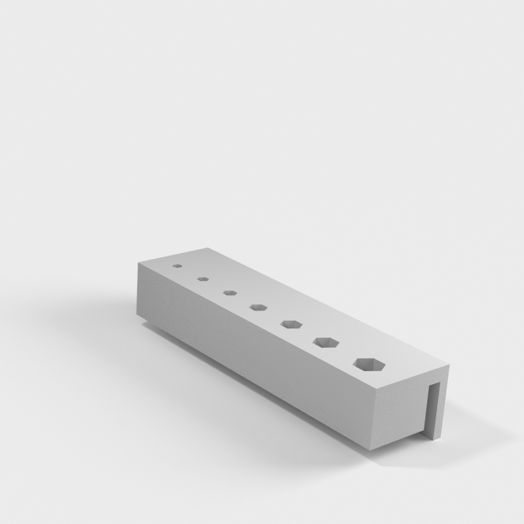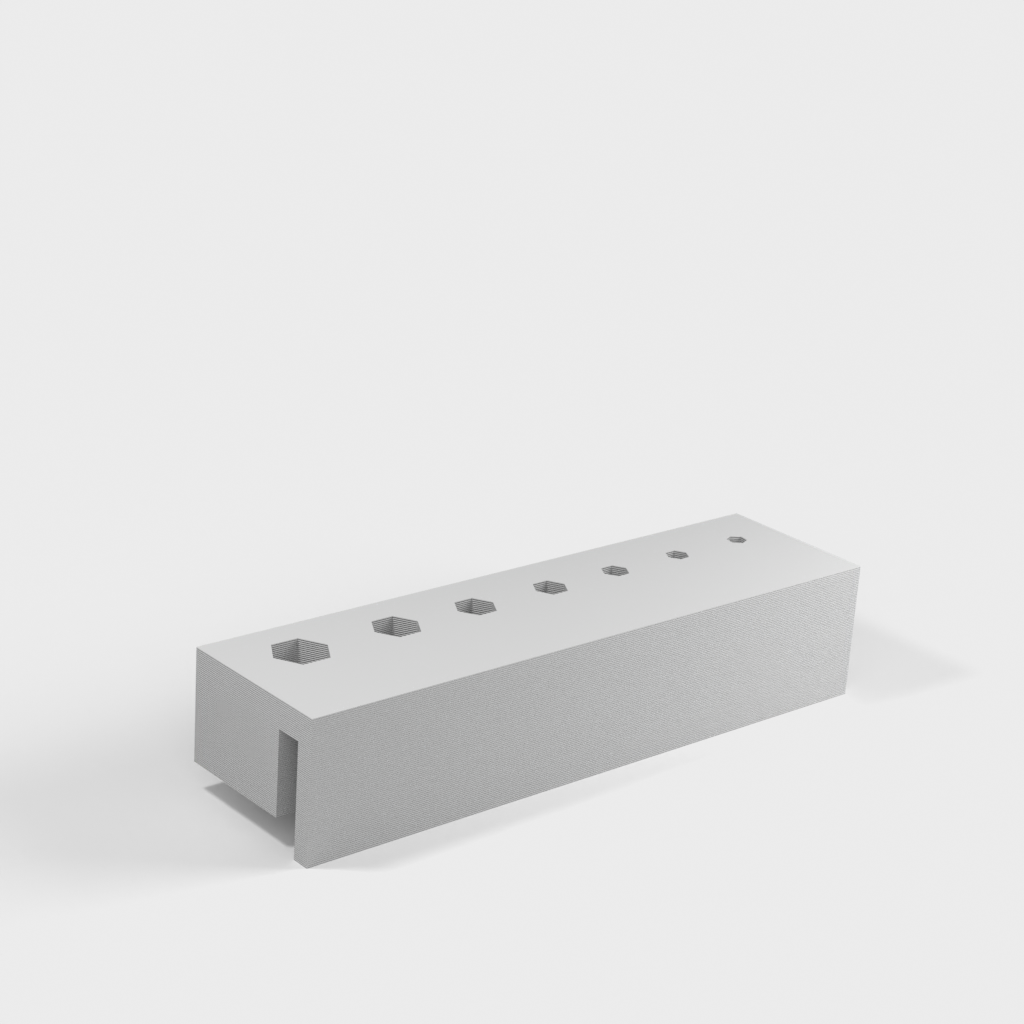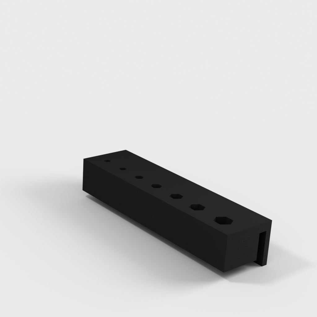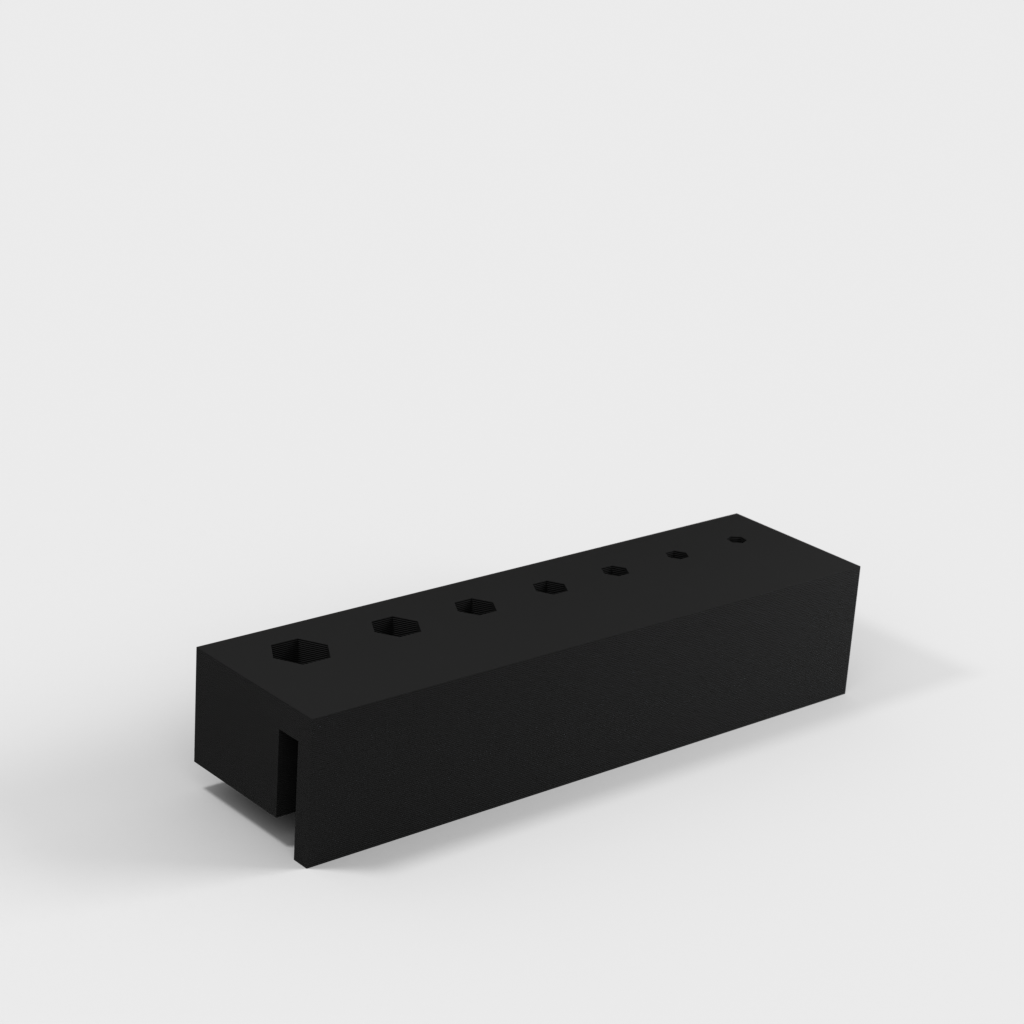 Este soporte está diseñado para almacenar de manera eficiente sus llaves Allen con mango en T y se monta fácilmente en el lateral de su caja de herramientas. El propósito es mantener sus herramientas organizadas y al alcance, lo que facilita encontrar rápidamente la llave Allen correcta durante su trabajo. El soporte asegura que sus llaves Allen estén protegidas contra el desgaste y minimiza el riesgo de perderlas cuando no están en uso. Ofrece una solución práctica y que ahorra espacio tanto para profesionales como para aficionados que desean mantener el orden en su arsenal de herramientas.