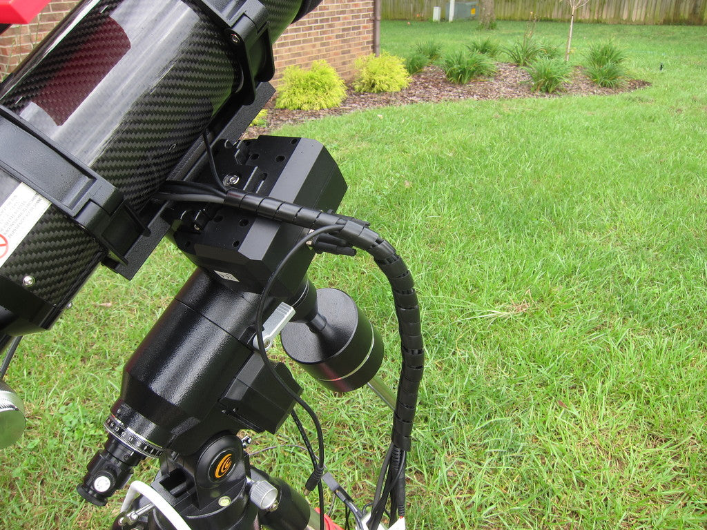 Este soporte está diseñado para proporcionar una gestión eficaz de los cables en las patas del trípode de la montura del telescopio Exos-2. Funciona como un robusto sujetacables que ayuda a asegurar los cables desde la caja de control PMC-Eight hasta la montura. Esto minimiza el riesgo de que los cables queden atrapados o enredados cuando el telescopio gira, lo que puede evitar que los motores se detengan y dañar potencialmente el equipo. Además de los cables de control primarios, este clip de cable también se puede utilizar para mantener los cables de los cables calefactores y de la cámara de astrofotografía de forma segura en su lugar, contribuyendo a una sesión de observación más organizada y sin problemas.